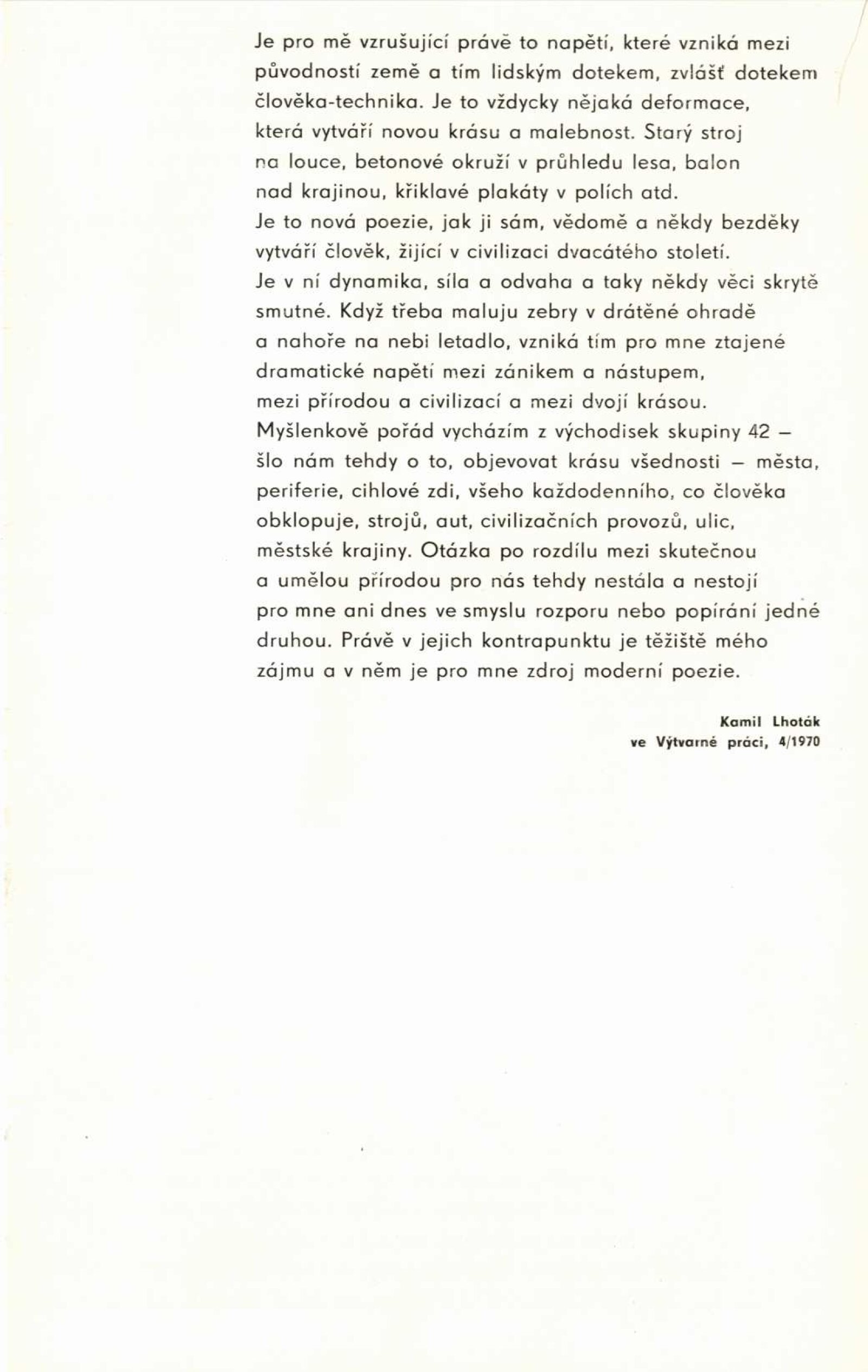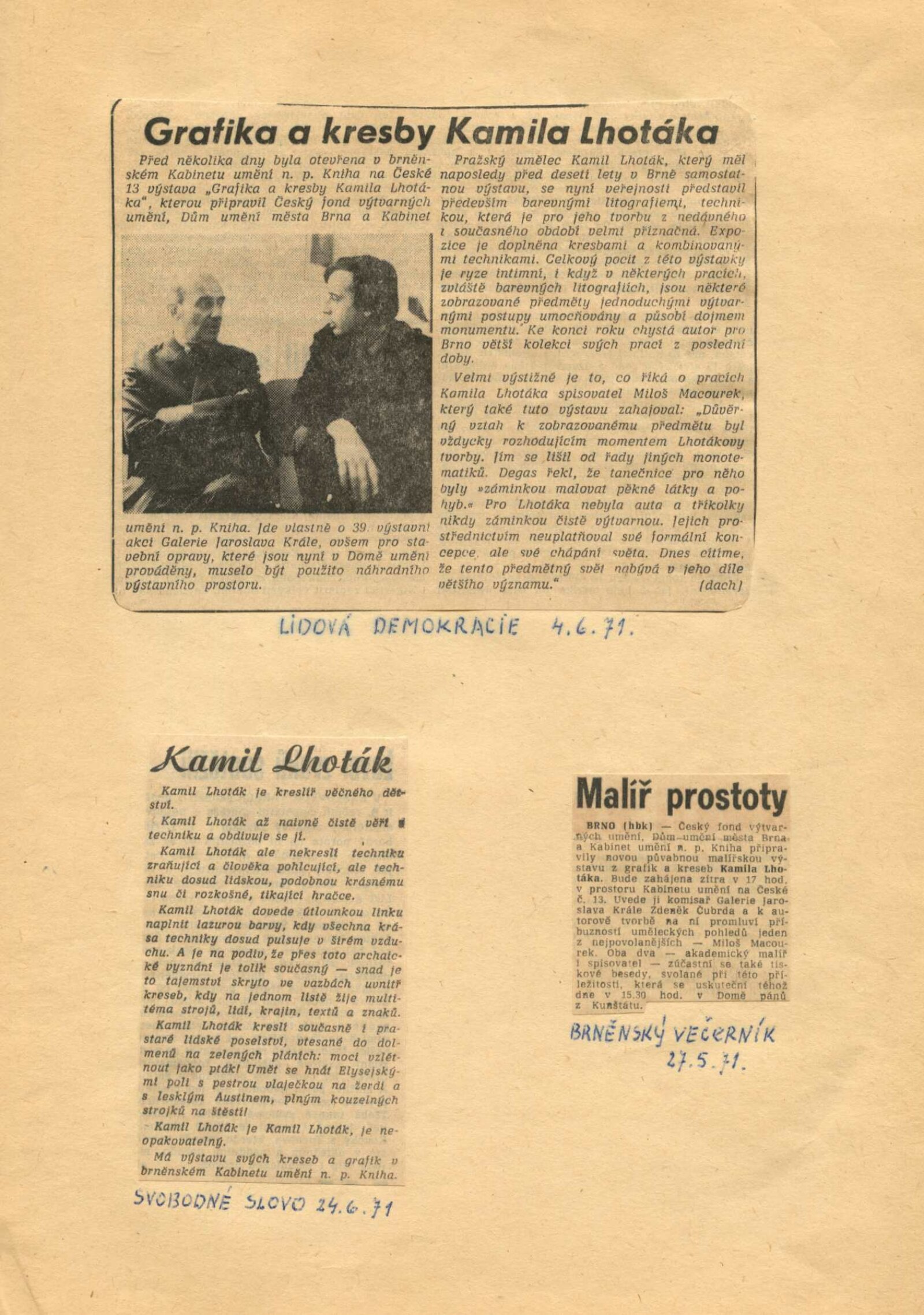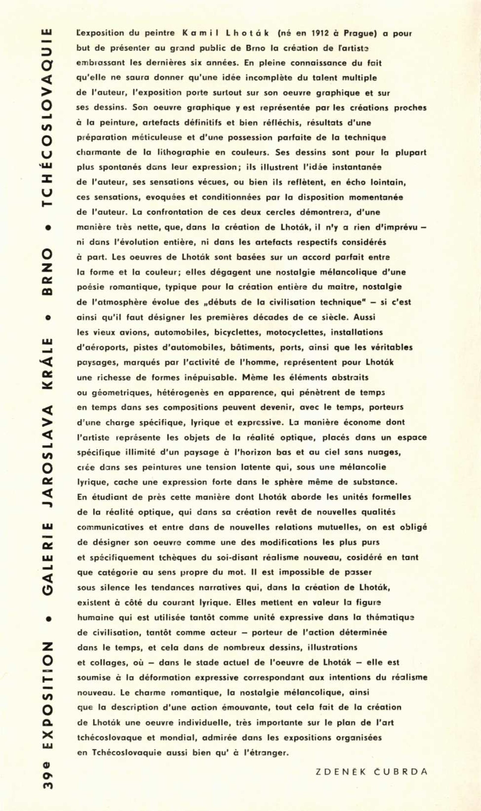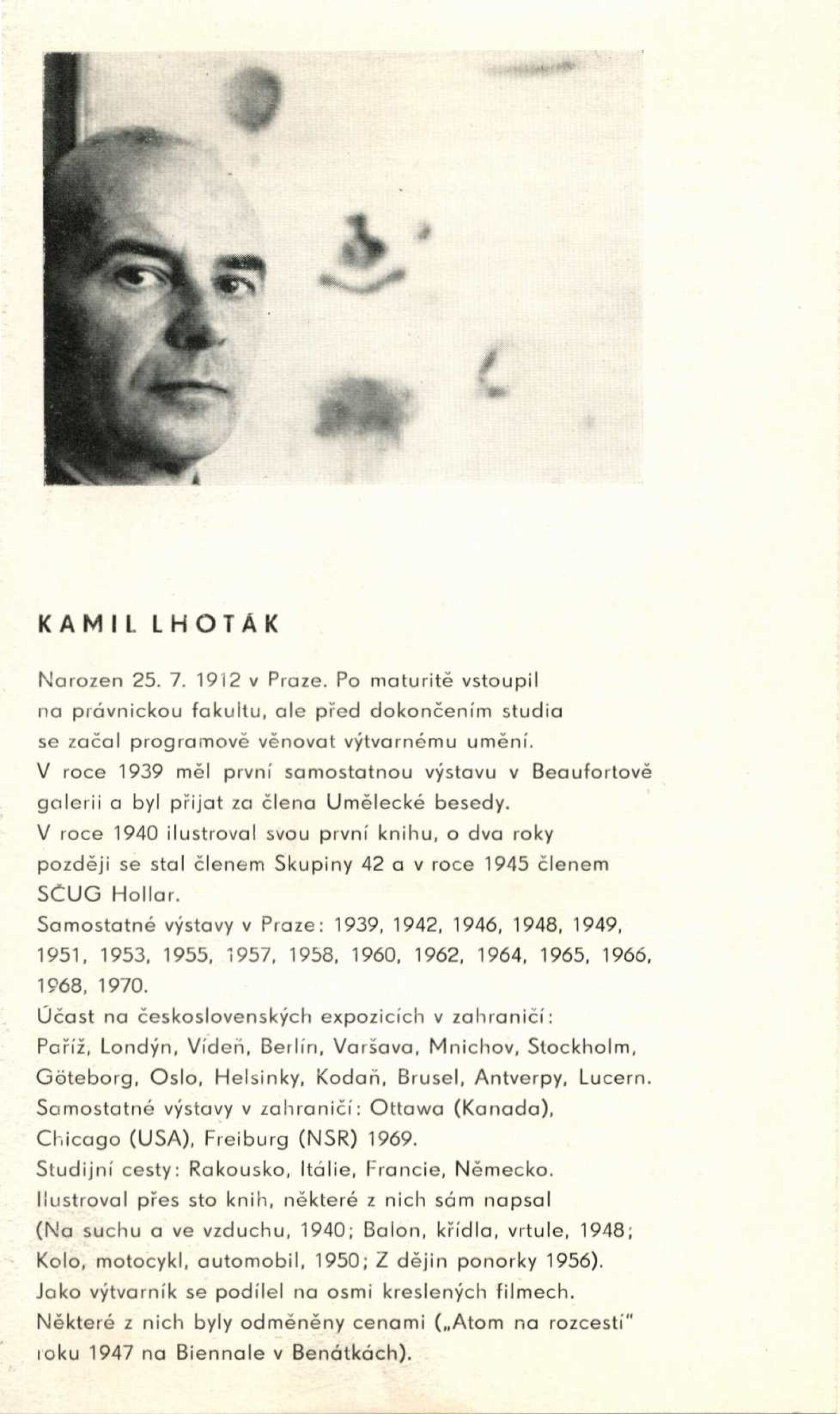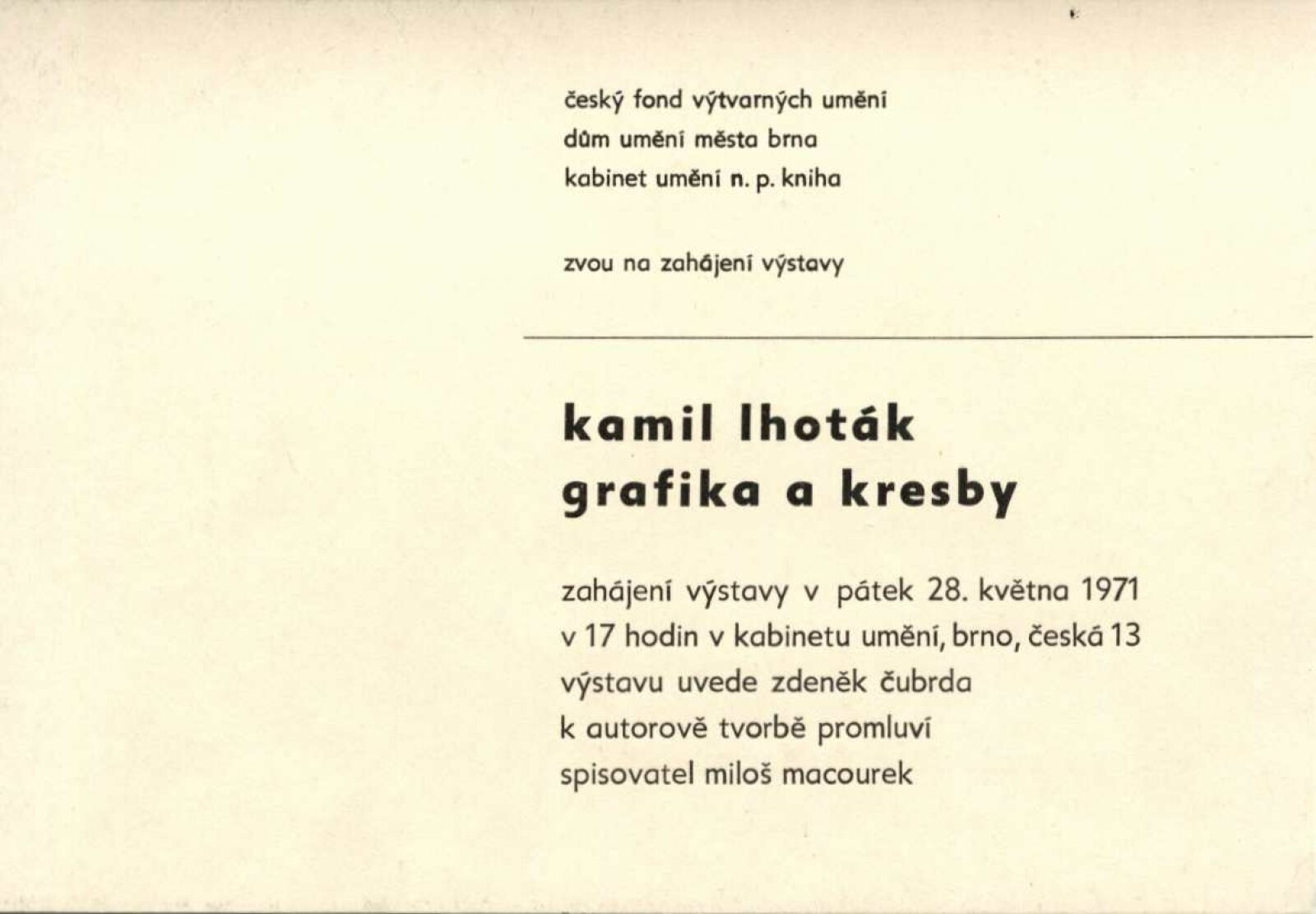 Kamil Lhoták. Kresby a grafika: Dům umění, 39. výstava v Galerii Jaroslava Krále, Kabinet umění n. p. Kniha, Česká 13, 28. 5. – 4. 7. 1971 / Texty: Miloš Macourek a autor. – Brno: ČFVU, 1971. – 10 s., obr., portrét, životopis. – MZK; MG; MMB