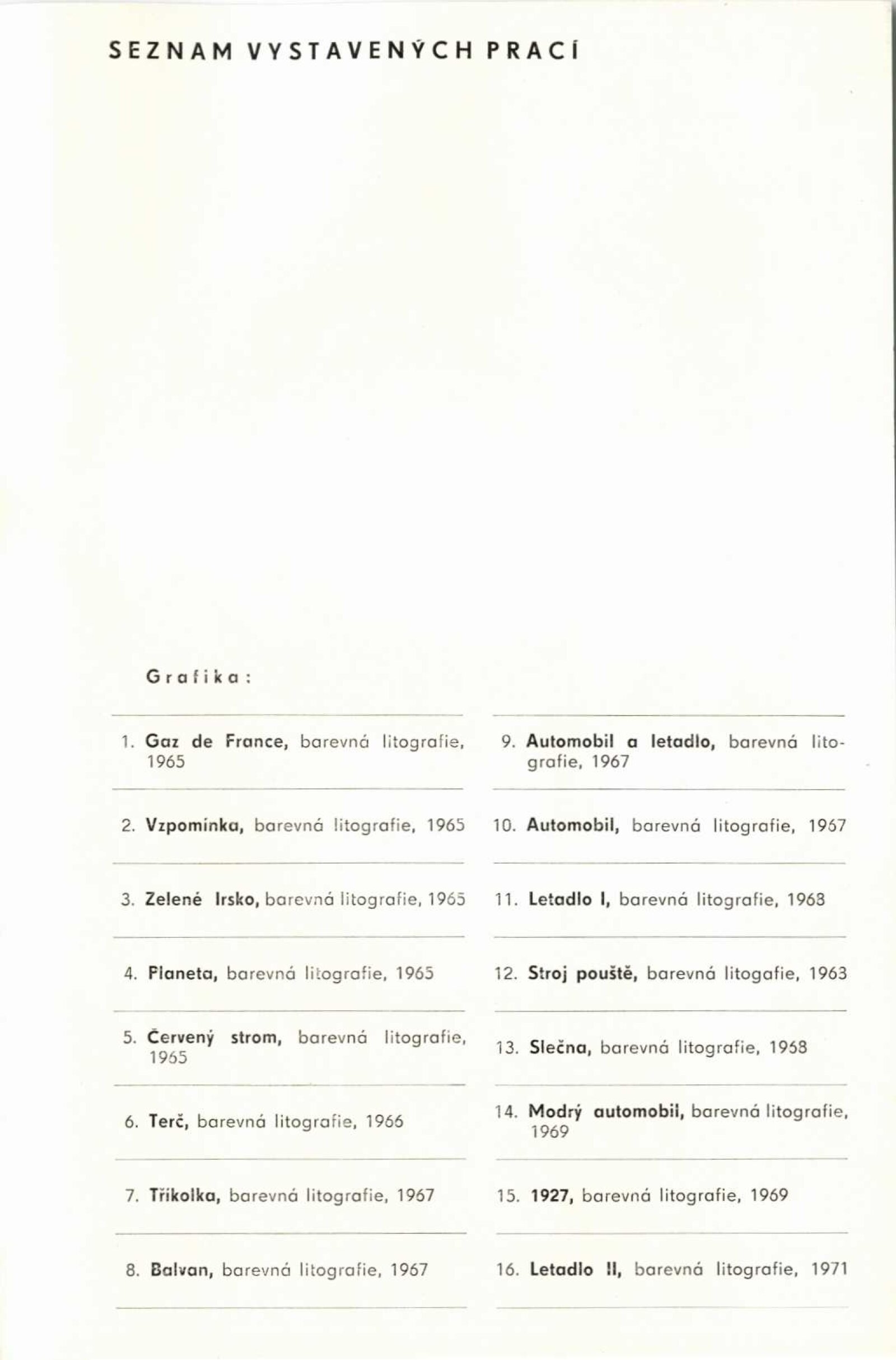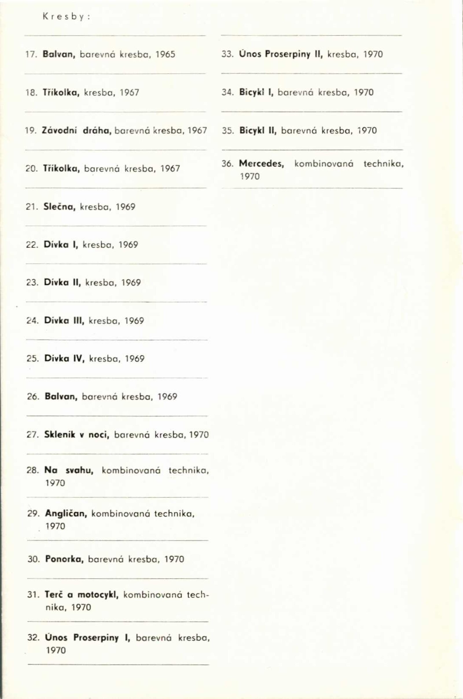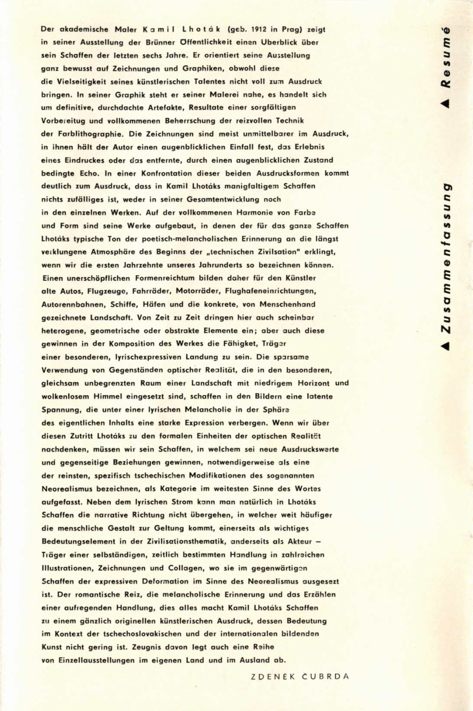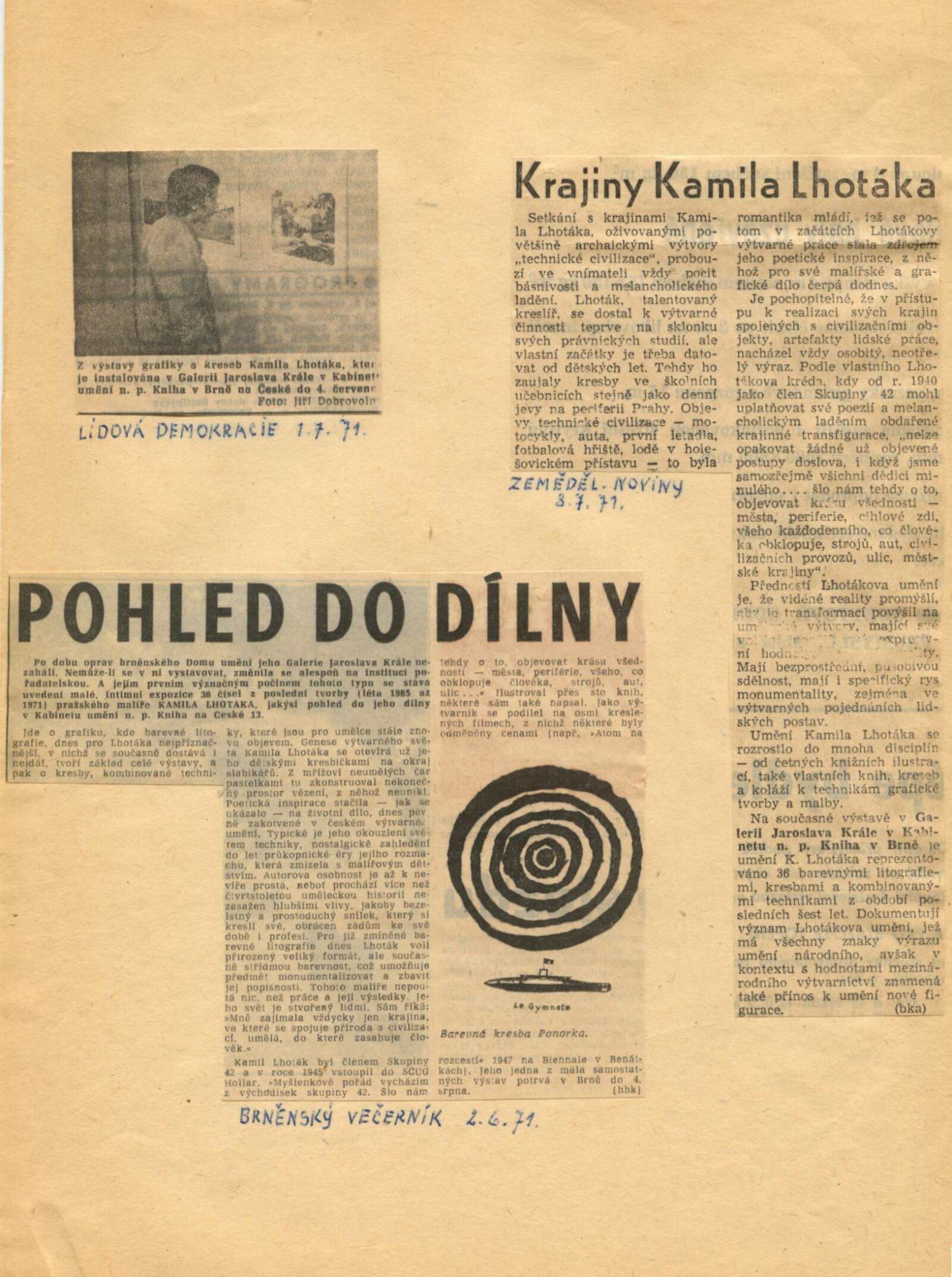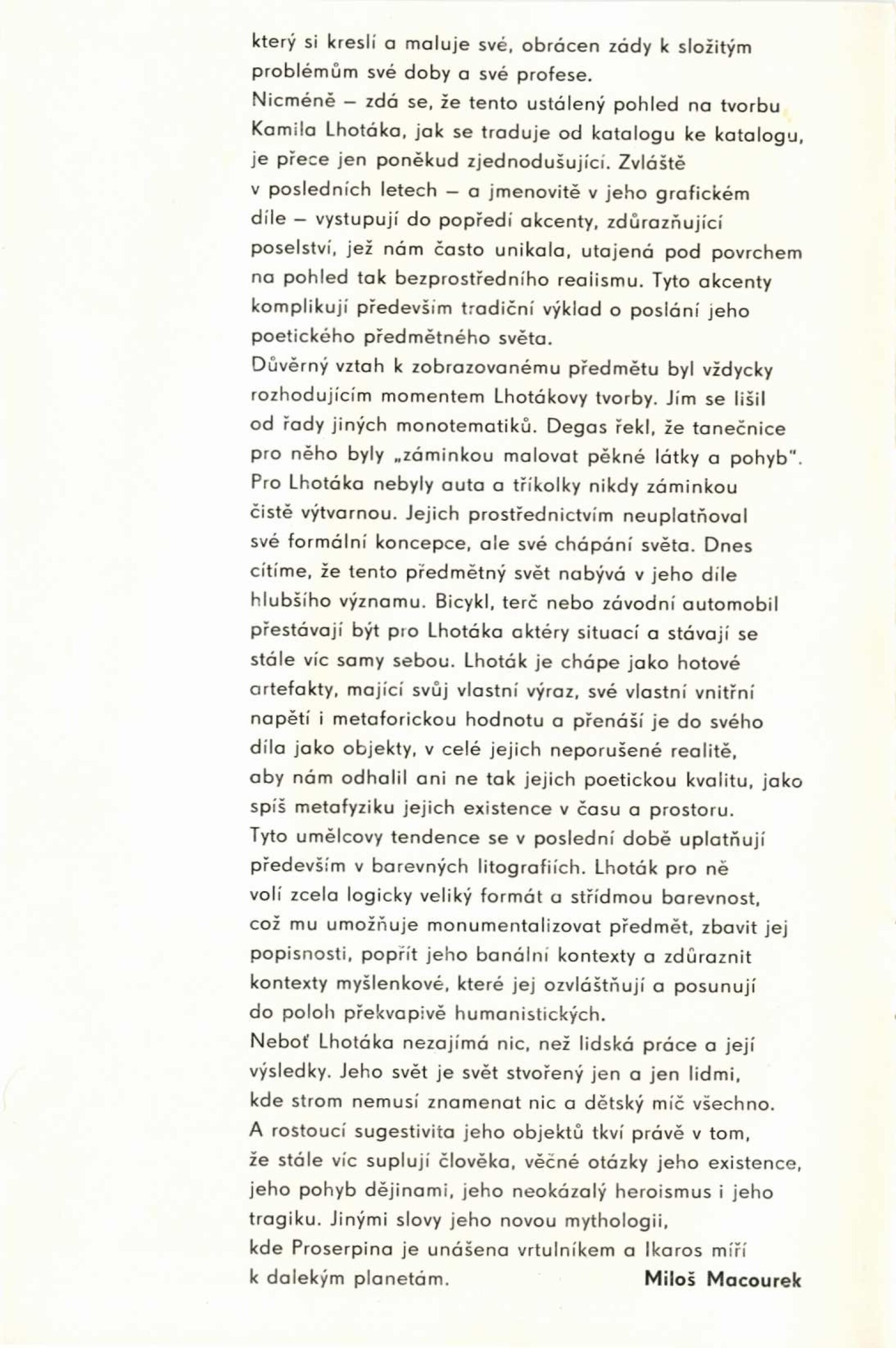 Kamil Lhoták. Kresby a grafika: Dům umění, 39. výstava v Galerii Jaroslava Krále, Kabinet umění n. p. Kniha, Česká 13, 28. 5. – 4. 7. 1971 / Texty: Miloš Macourek a autor. – Brno: ČFVU, 1971. – 10 s., obr., portrét, životopis. – MZK; MG; MMB