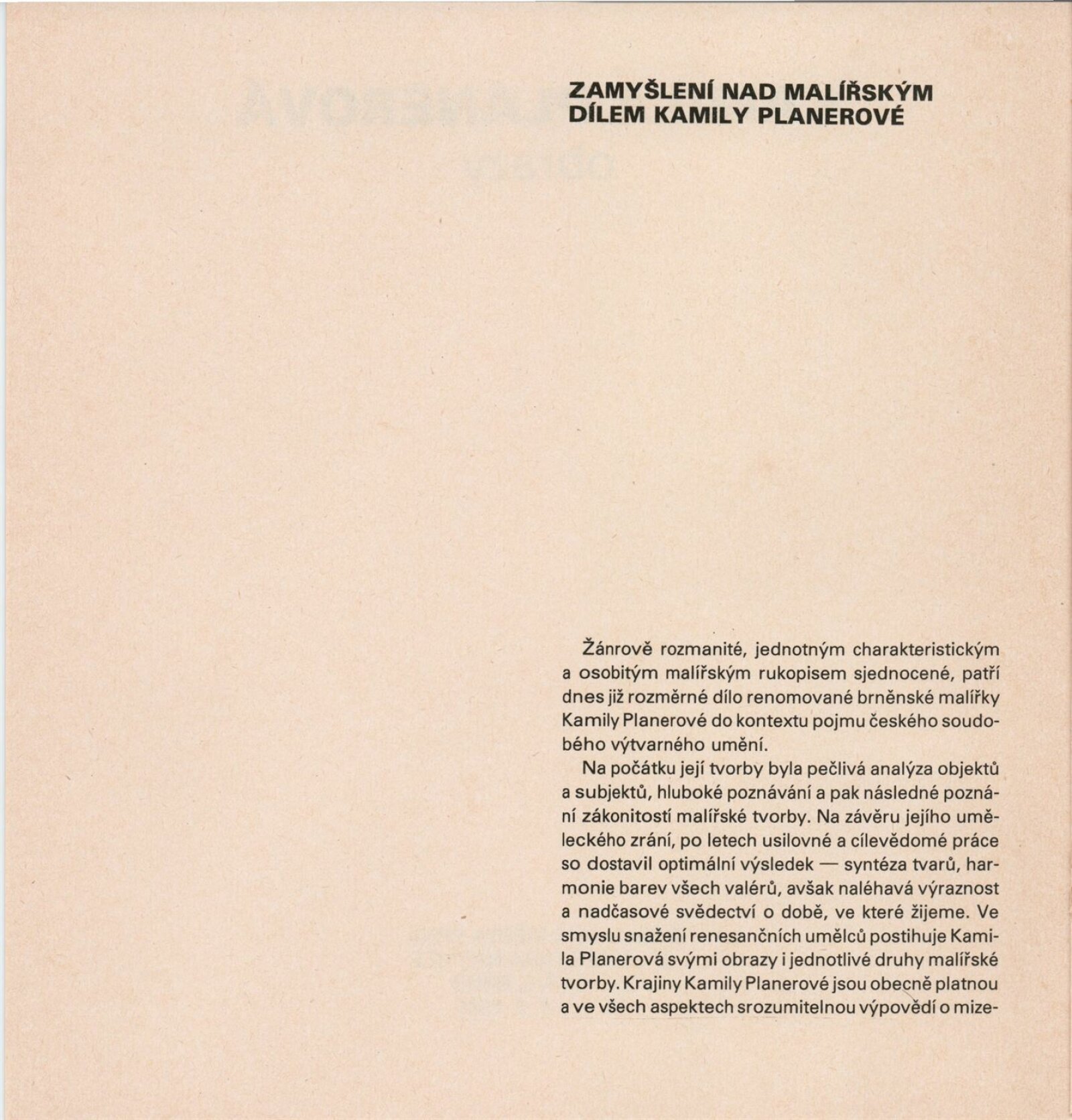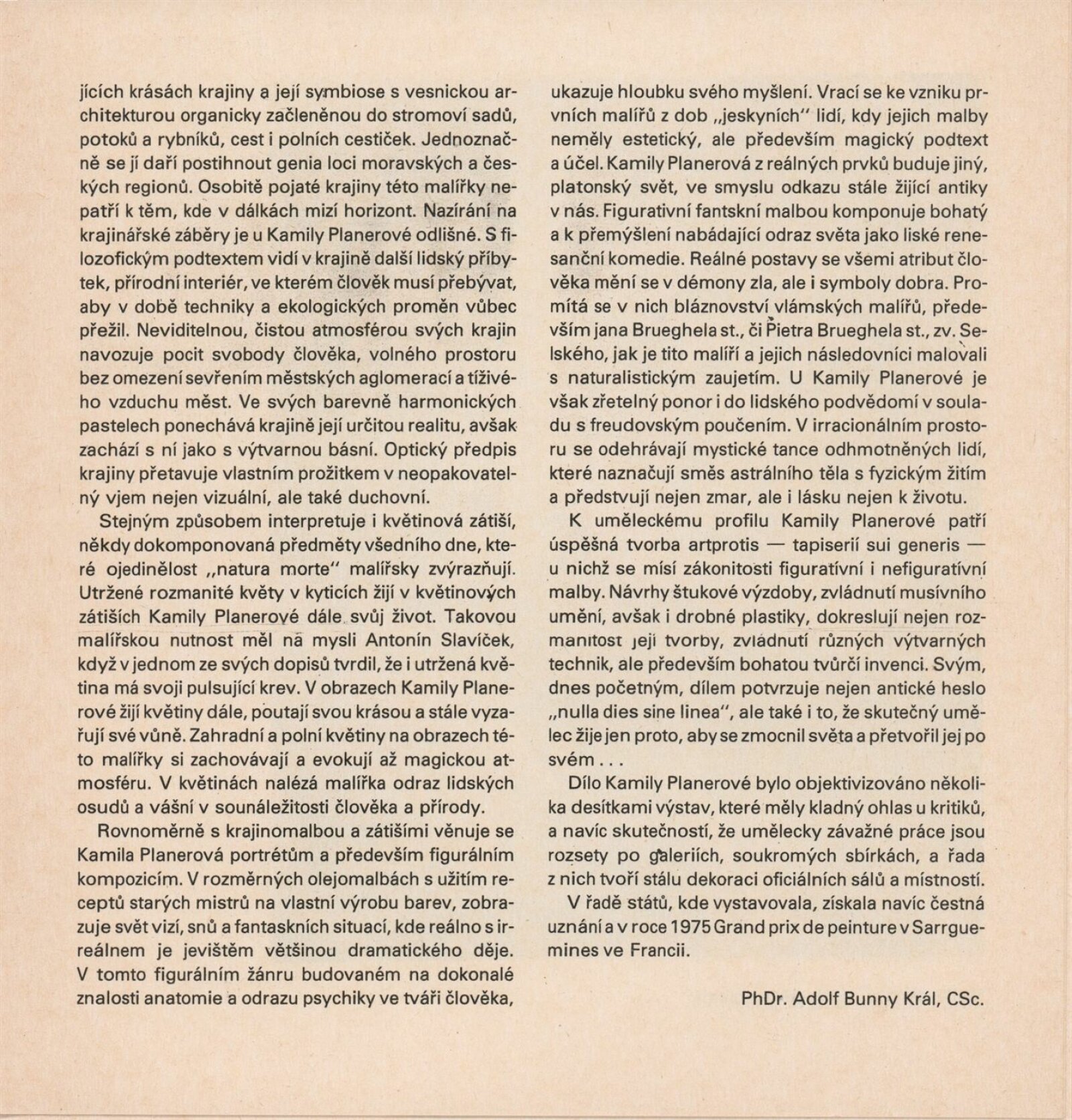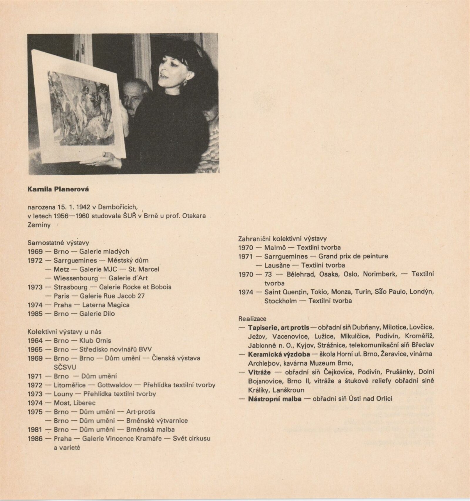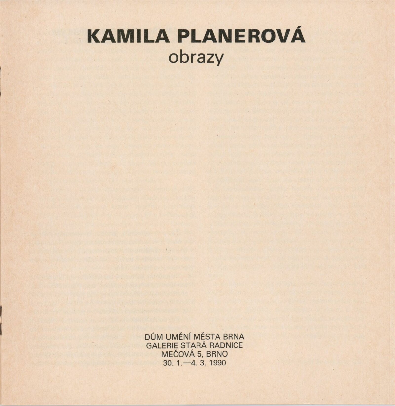 Kamila Planerová. Obrazy: Galerie Stará radnice, Síň Víncence Makovského, přízemí, 30. 1. – 4. 3. 1990 / Text: Adolf Bunny Kral. – Brno: DUmB, 1990. – [13] s., obr., portrét, životní data, výstavy, realizace, GSR 65. – MZK; MG; MMB