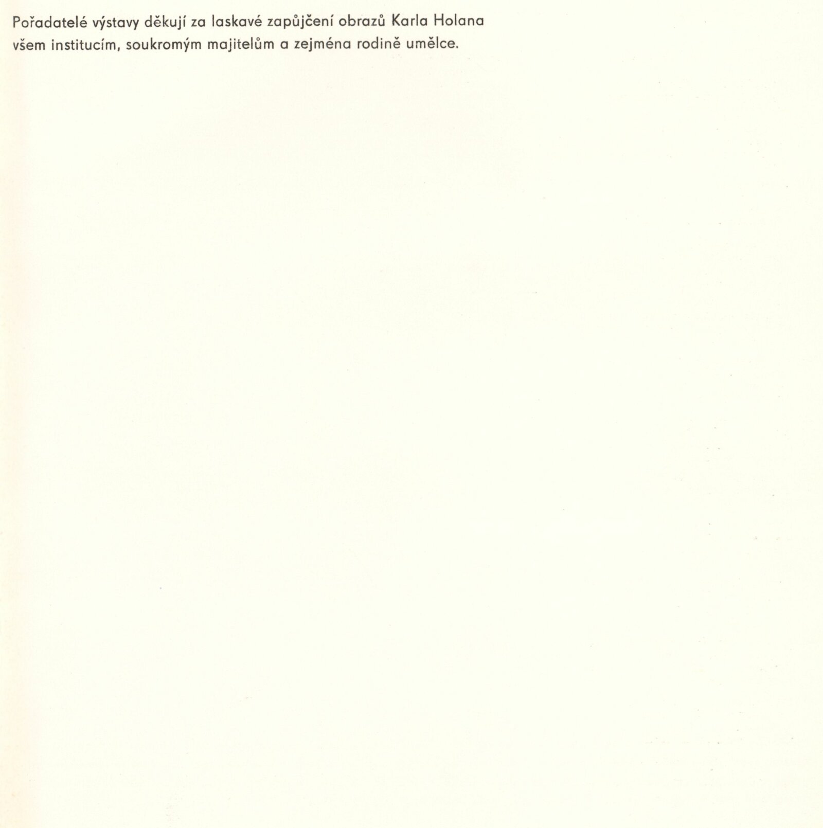 Karel Holan. Výstava k 90. výročí narození a 30. výročí úmrtí: Dům umění / Dům pánů z Kunštátu, 18. 10. – 20. 11. 1983 / Text: Jiřina Hockeová. – Brno: DUmB, 1983. – 20 s., obr., životní data, DPK 808. – MZK; MG; MMB