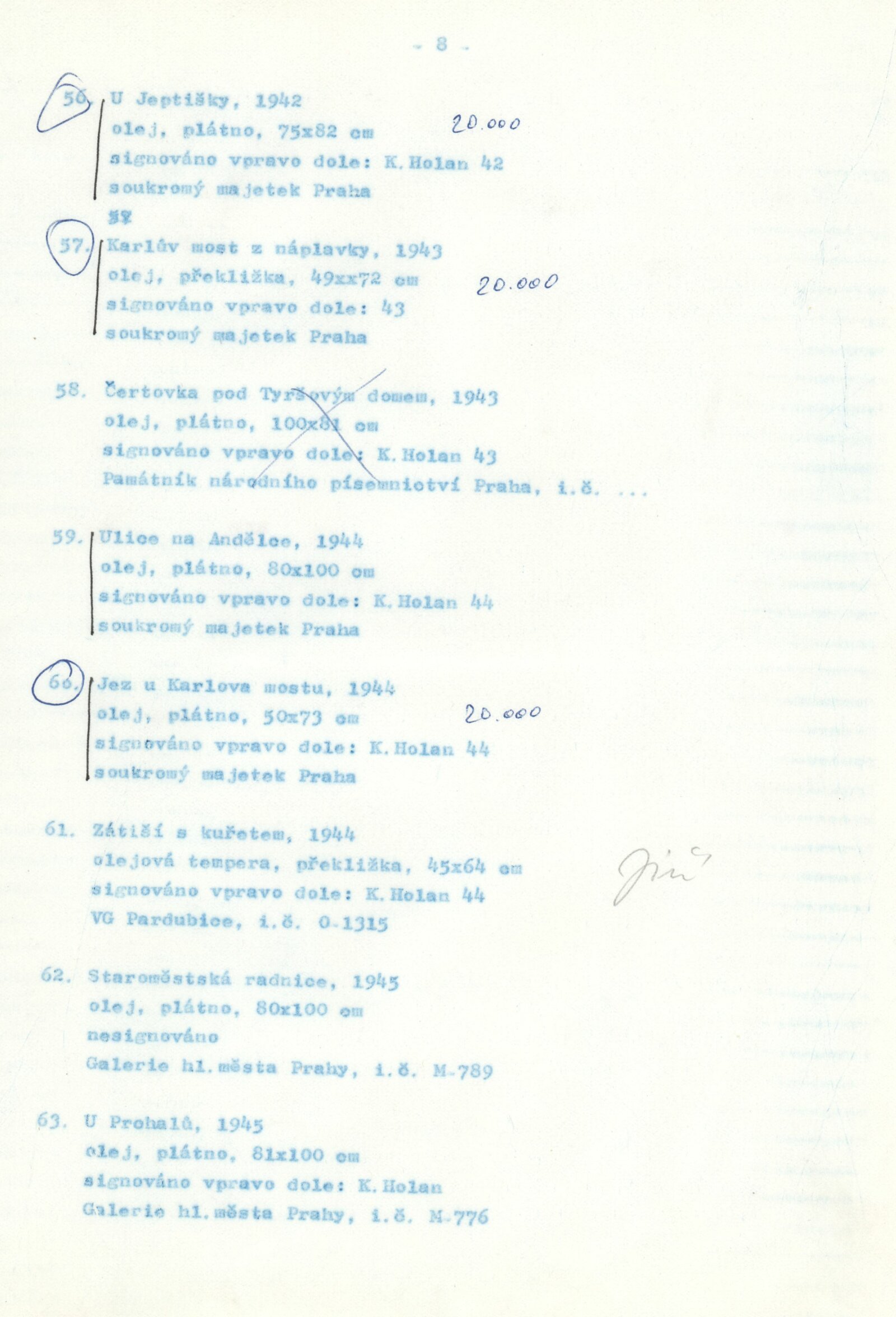 katalog, strojopis, seznam vystavených děl, pojistný seznam děl, provozní korespondence (výpůjčky – Roudnice, Praha, Ostrava, předání výstavy do Horácké galerie v Novém městě na Moravě – repríza výstavy), žádostí o zápůjčku, žádost o povolení výstavy, závěrečná zpráva o průběhu výstavy, recenze v tisku, dokumenty ručně psané