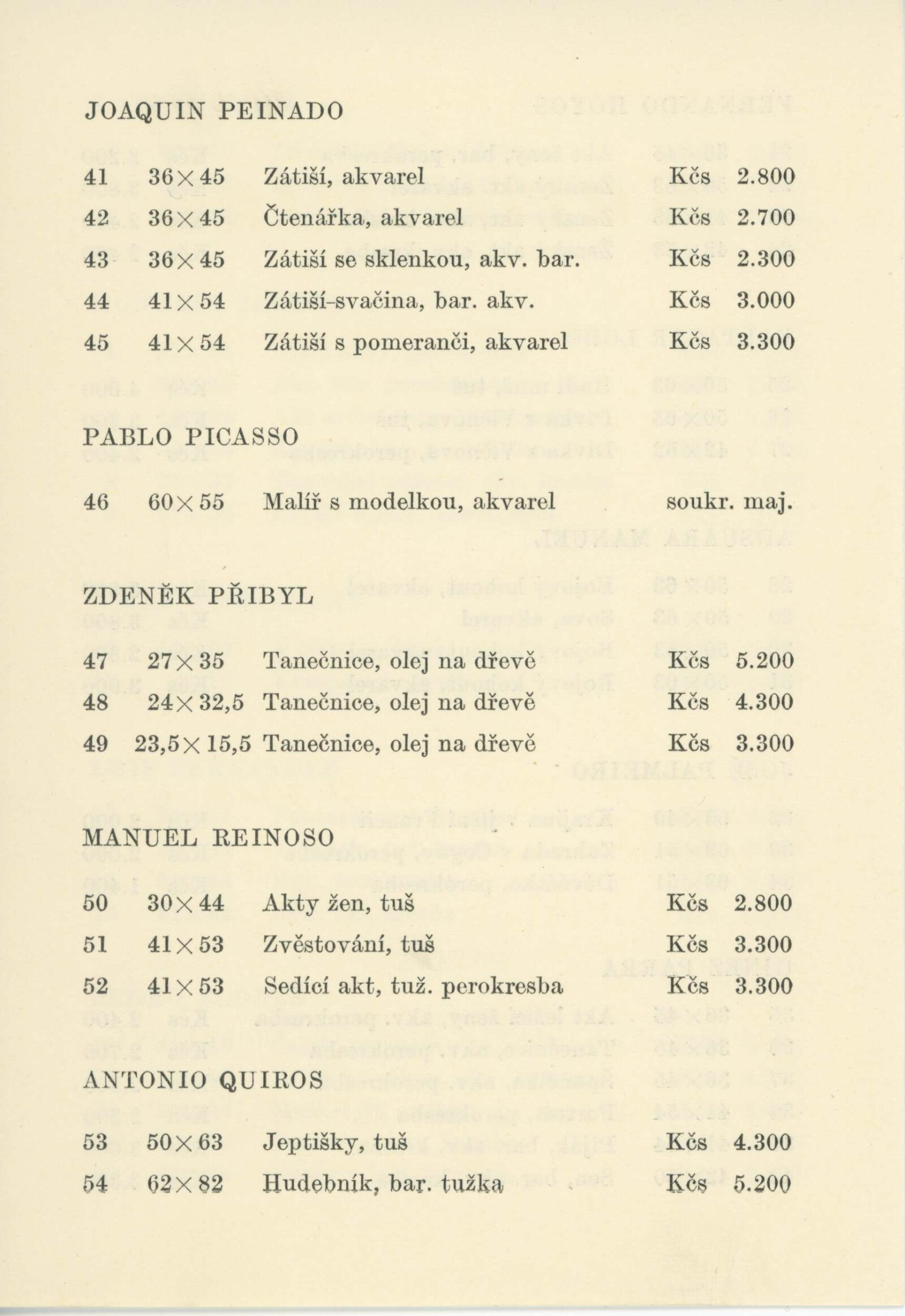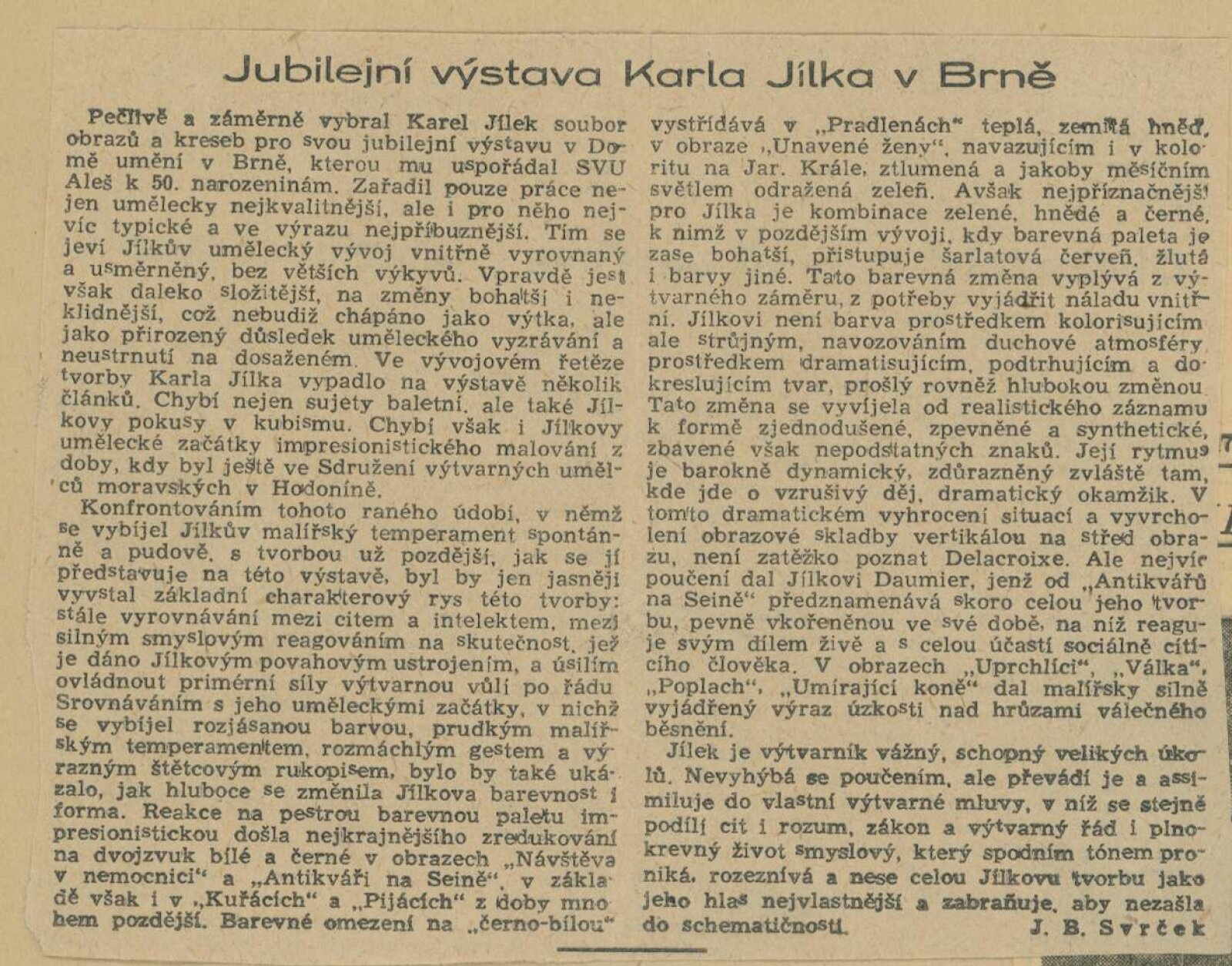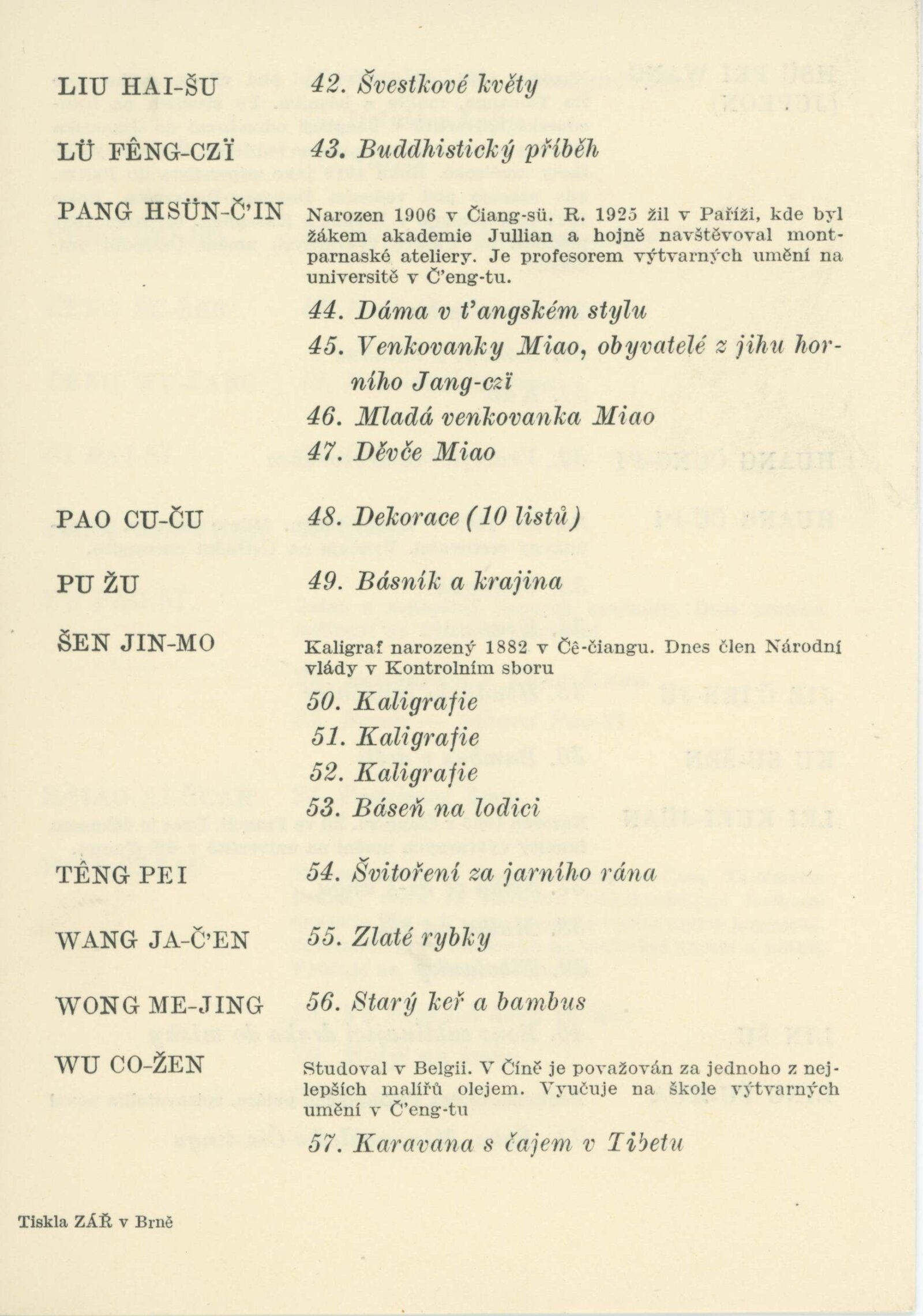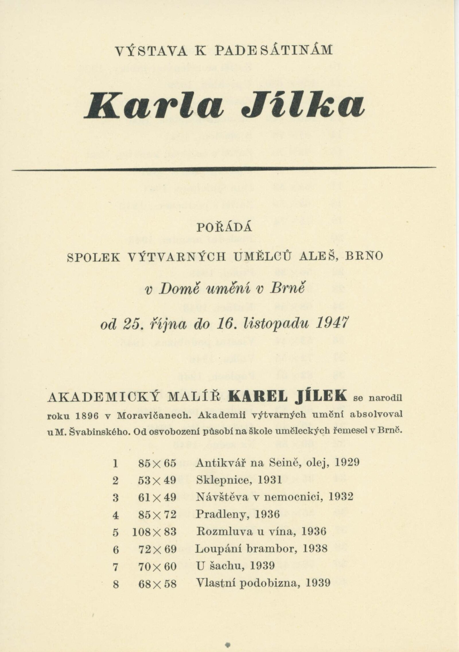 Katalog výstav Domu umění, pořádaných 25. 10. – 16. 11. 1947 / Obsahuje výstavy: Jubilejní soubor obrazů k padesátinám akad. malíře prof. Karla Jílka. 46. výstava, Soubor obrazů akademického malíře Bohumíra Matala a plastik sochaře Ladislava Zívra. 47. výstava, Nové umění staré Číny. 48. výstava, Kresby malířů demokratického Španělska. 49. výstava, Grafika Petra Dillingera. 51. výstava, Soutěžní návrhy na reliéf Domu umění. 52. výstava. – Brno: Blok, SVU Aleš, Čínská společnost, Klub přátel umění v Brně, 1947. – 18 s., obr., životopisy seznam vystavených děl, DU 48–52. – Kubíček 7802; MZK; MG; AMB