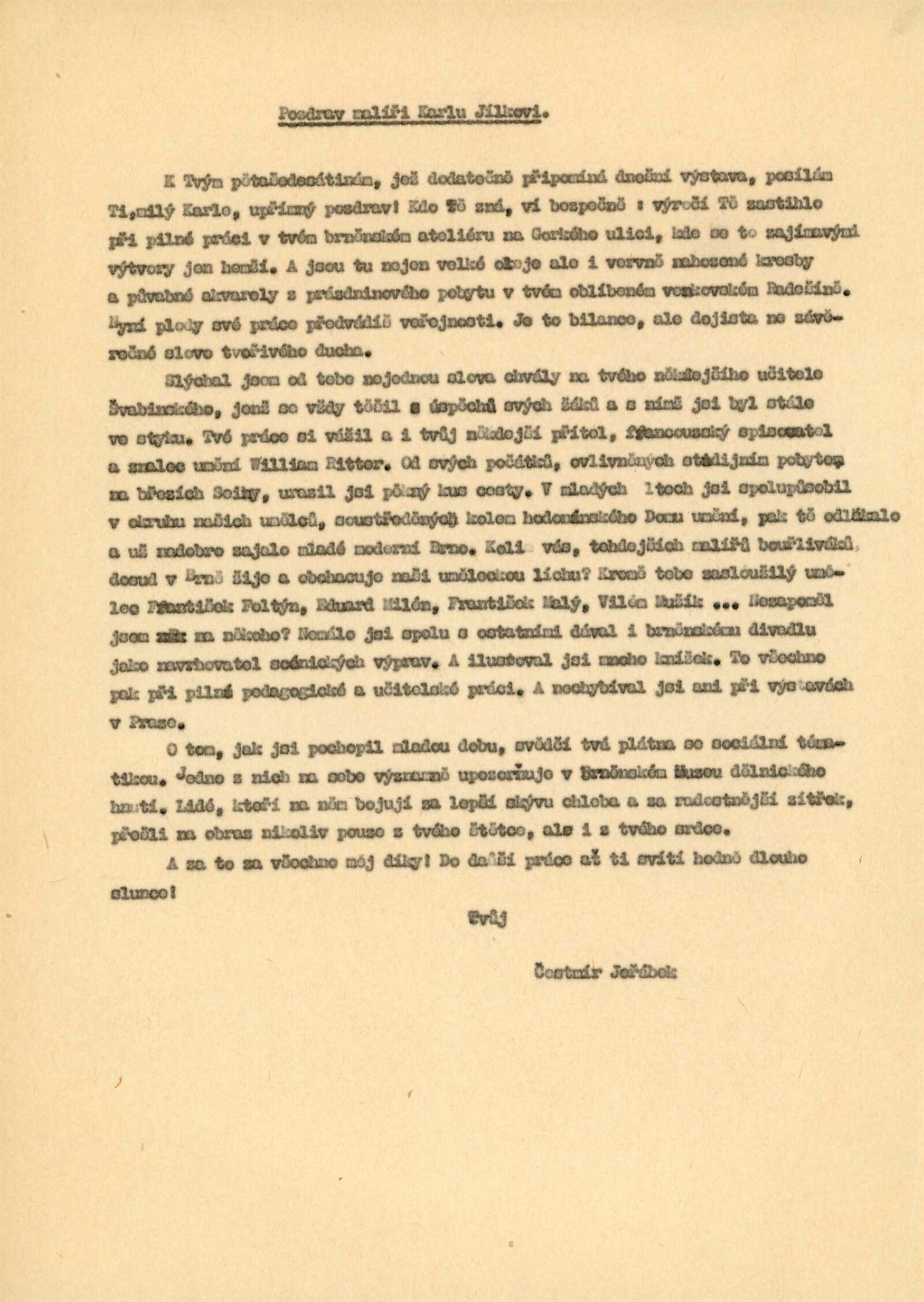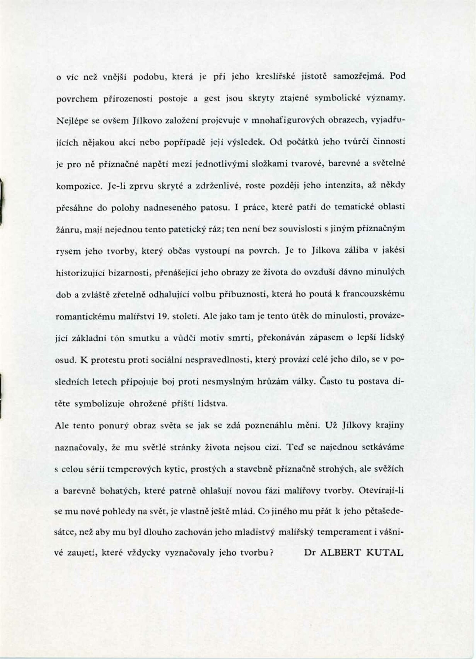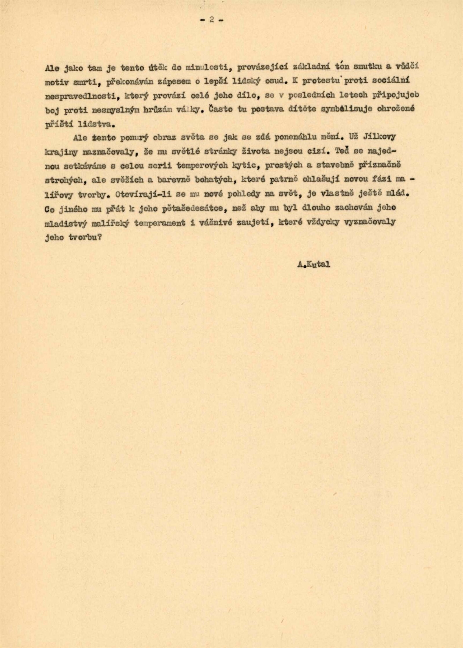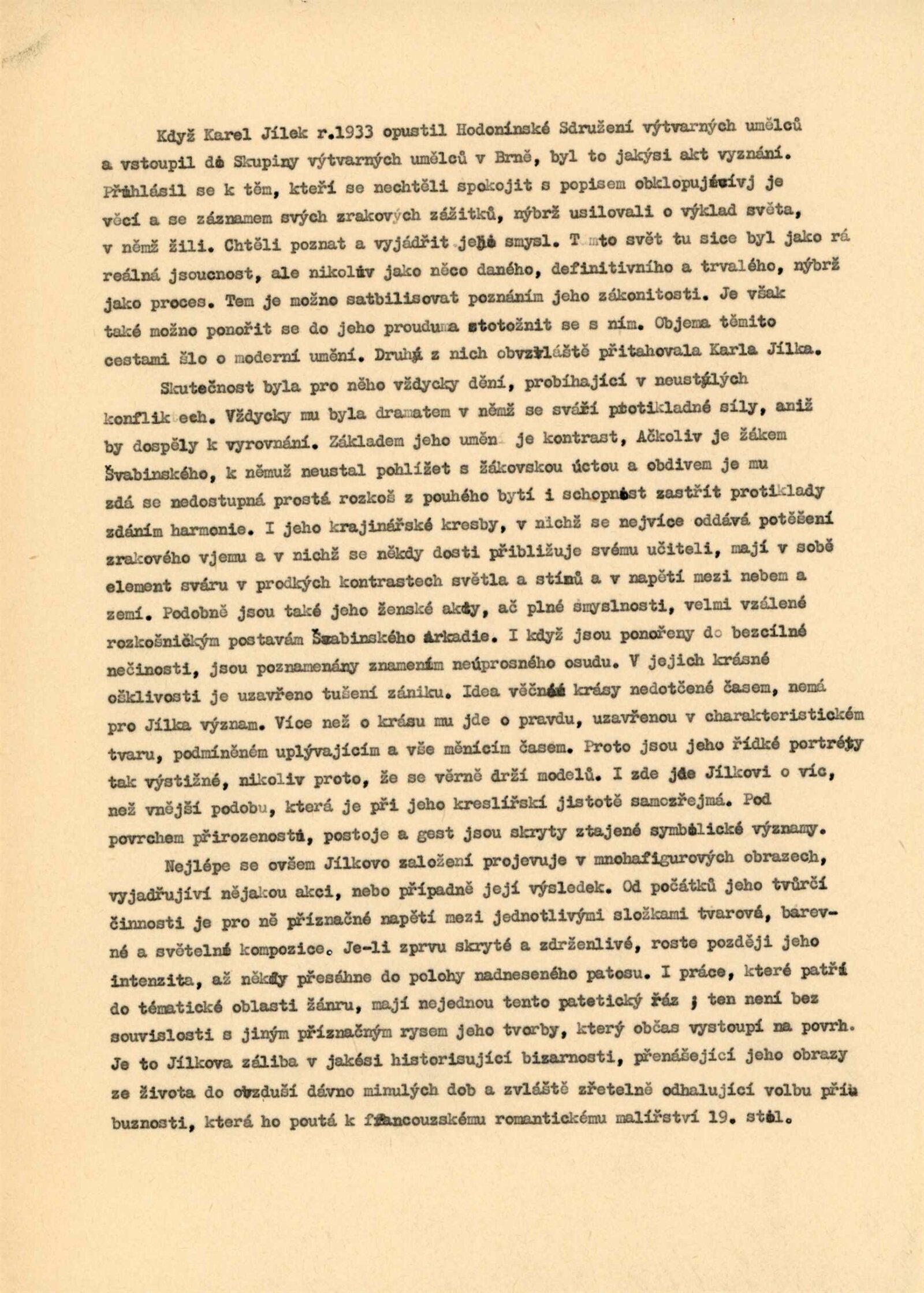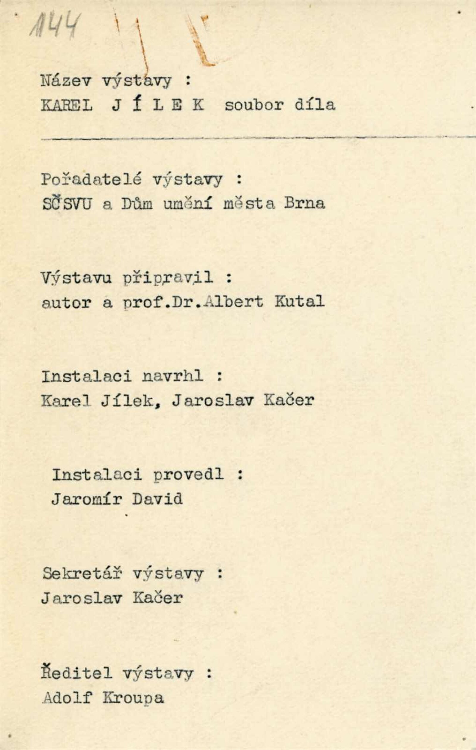 pozvánka, katalog, karta k výstavě, fotografie uměleckých děl, strojopisy textů katalogu, úvodní slovo (Albert Kutal), pozdrav malíři (Čestmír Jeřábek), rukopis životopisu (Karel Jílek), podmínky pro uspořádání výstavy, korespondence (žádost o uspořádání výstavy, příprava výstavy – Karel Jílek), rukopisy, výpůjční reverz, recenze v tisku