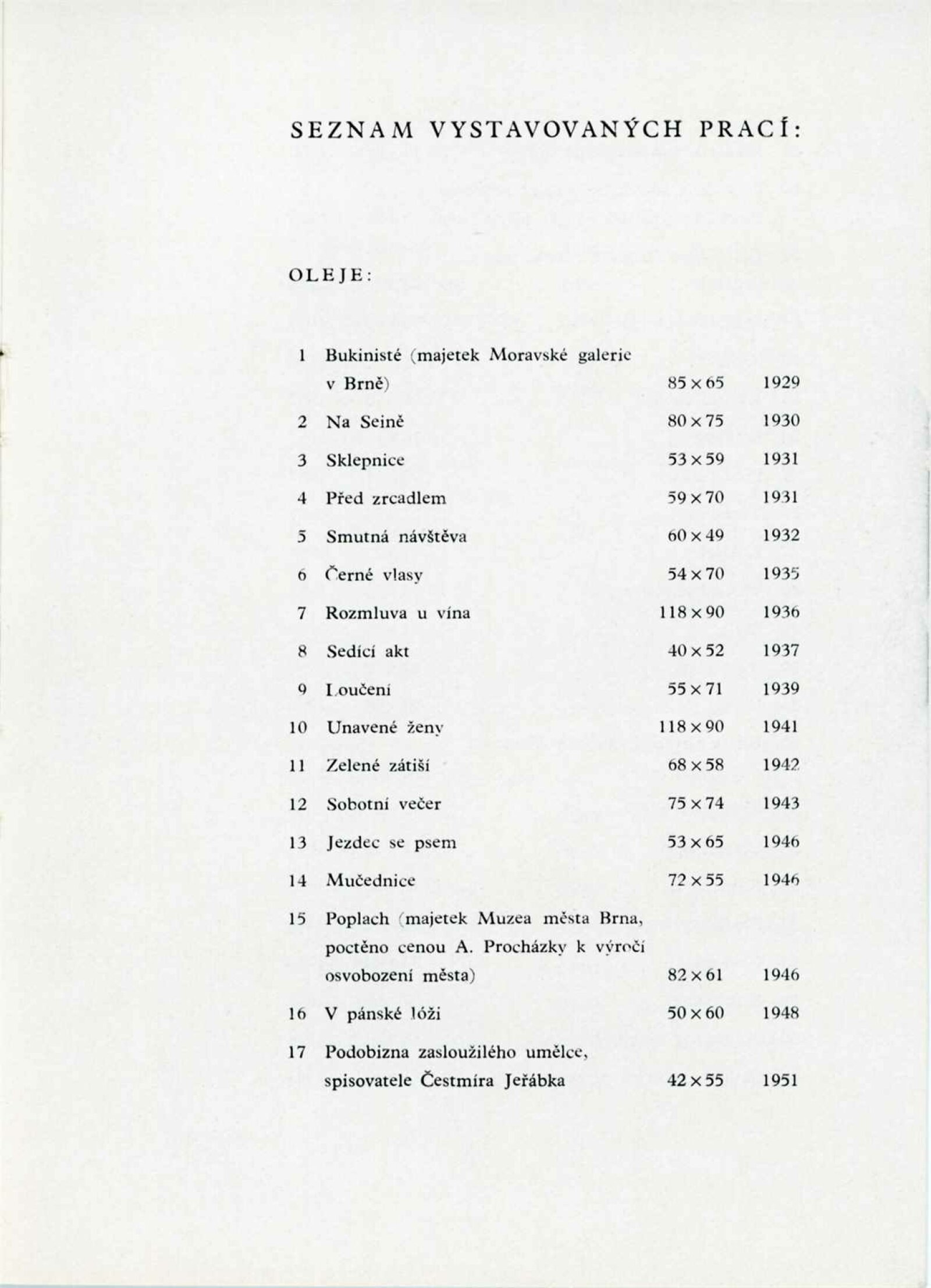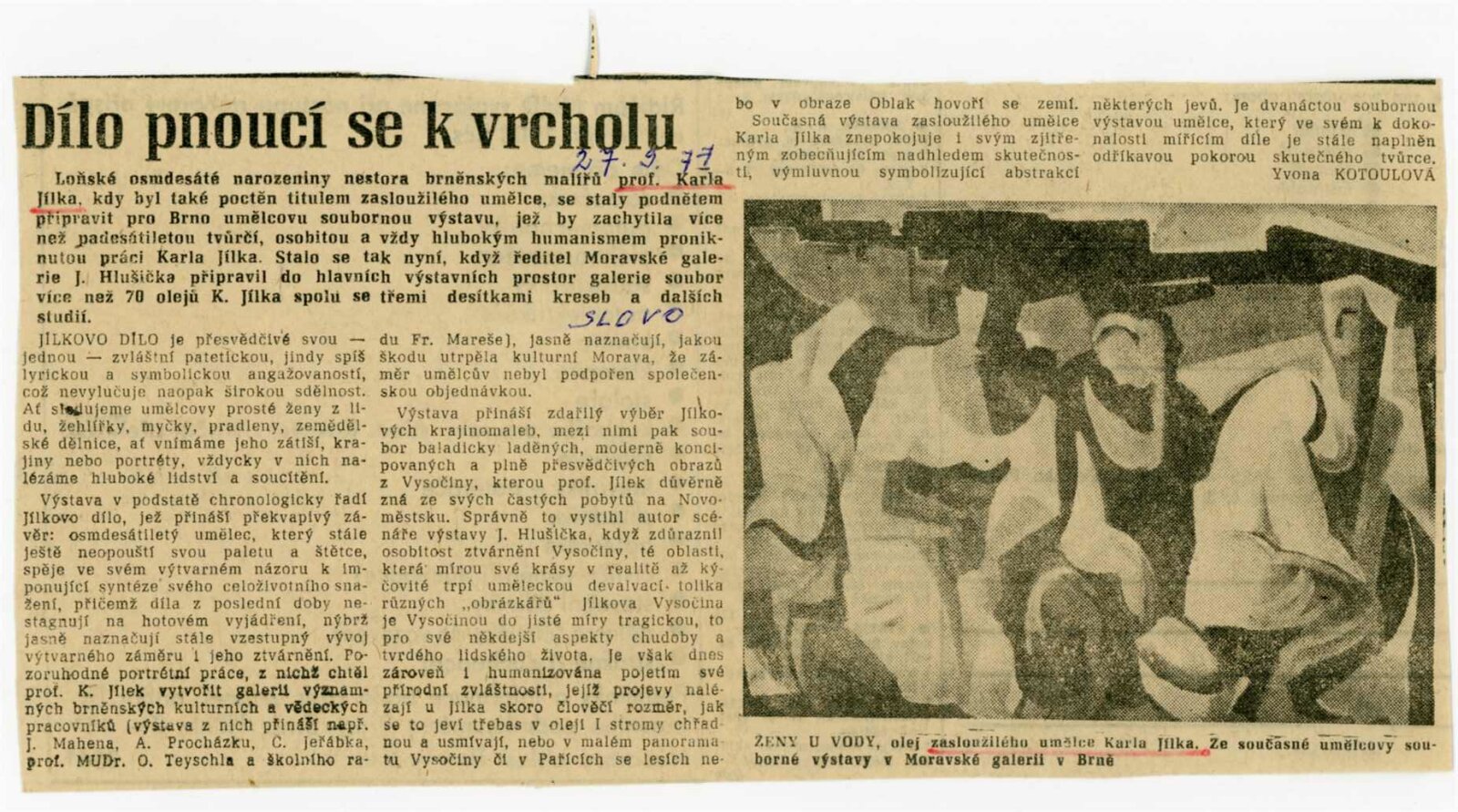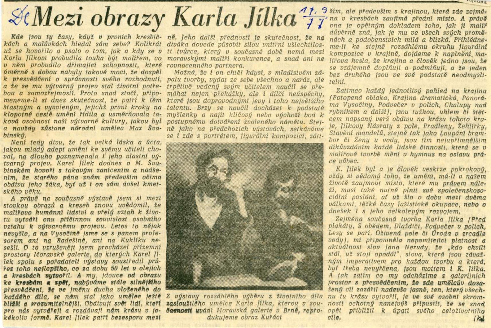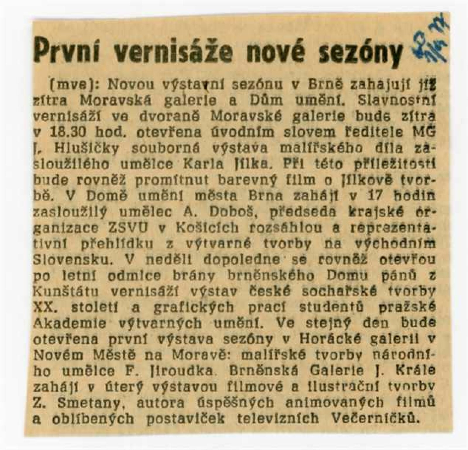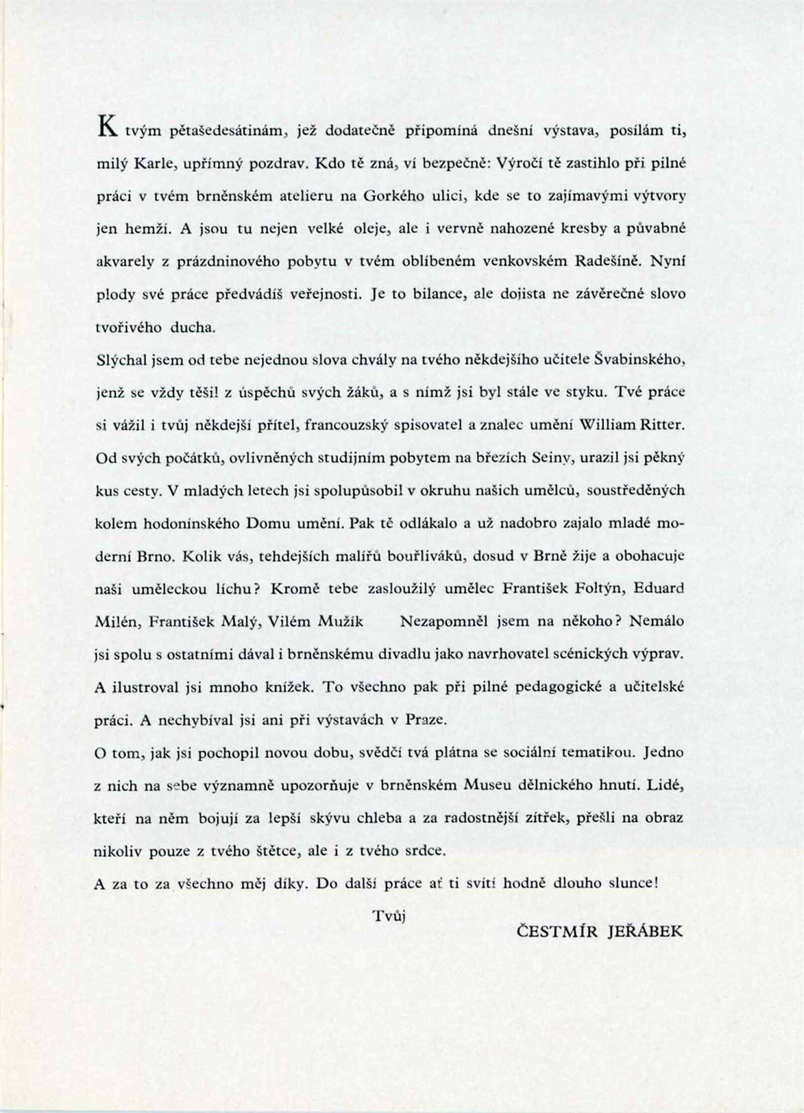 pozvánka, katalog, karta k výstavě, fotografie uměleckých děl, strojopisy textů katalogu, úvodní slovo (Albert Kutal), pozdrav malíři (Čestmír Jeřábek), rukopis životopisu (Karel Jílek), podmínky pro uspořádání výstavy, korespondence (žádost o uspořádání výstavy, příprava výstavy – Karel Jílek), rukopisy, výpůjční reverz, recenze v tisku