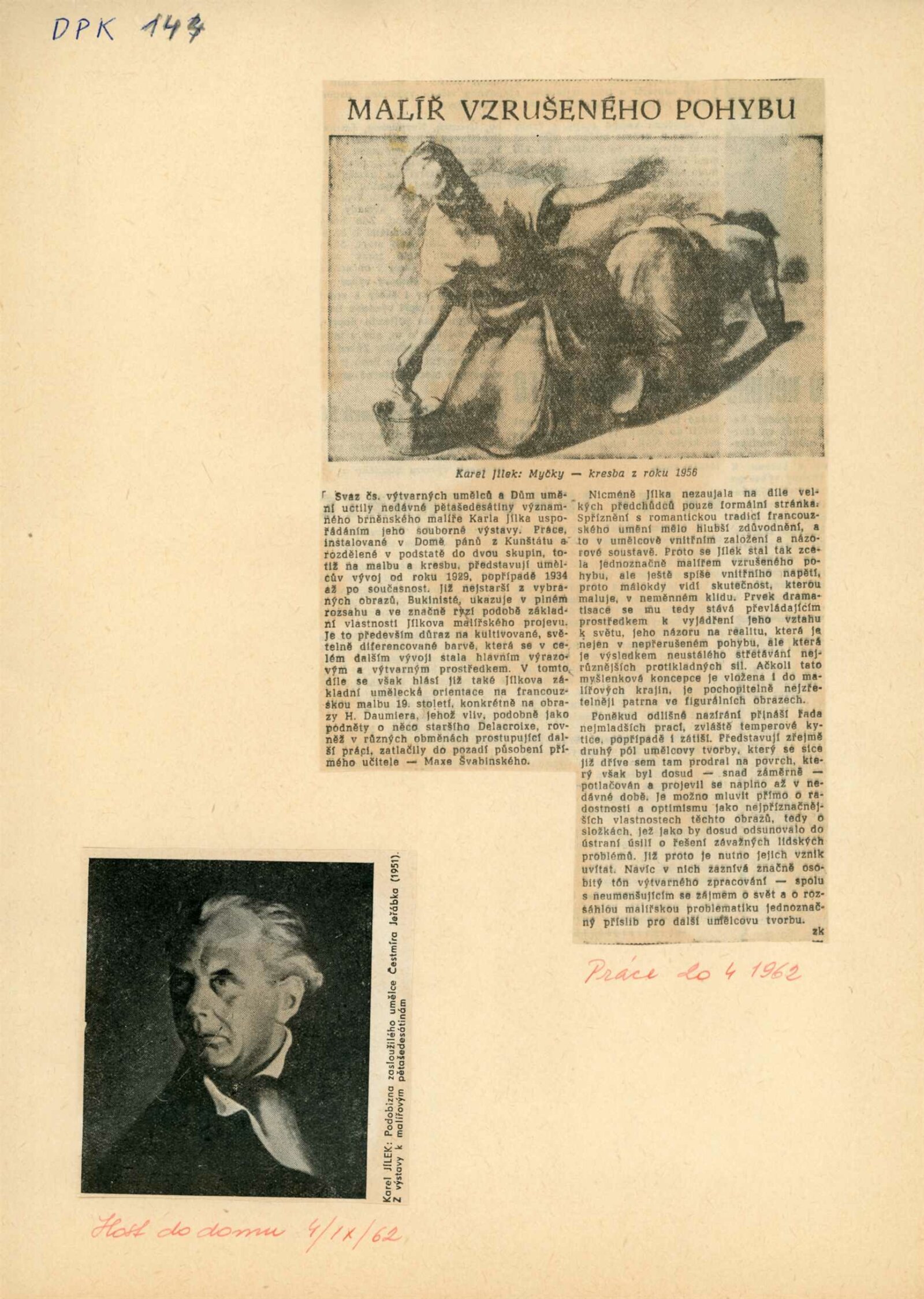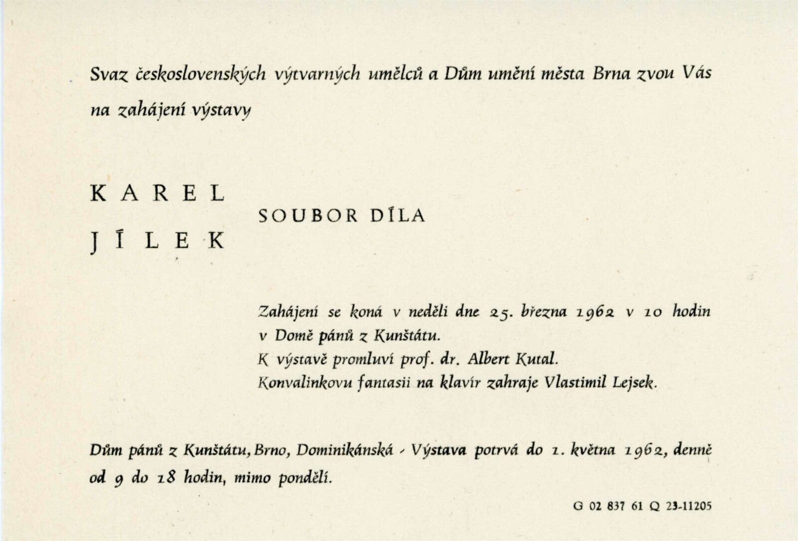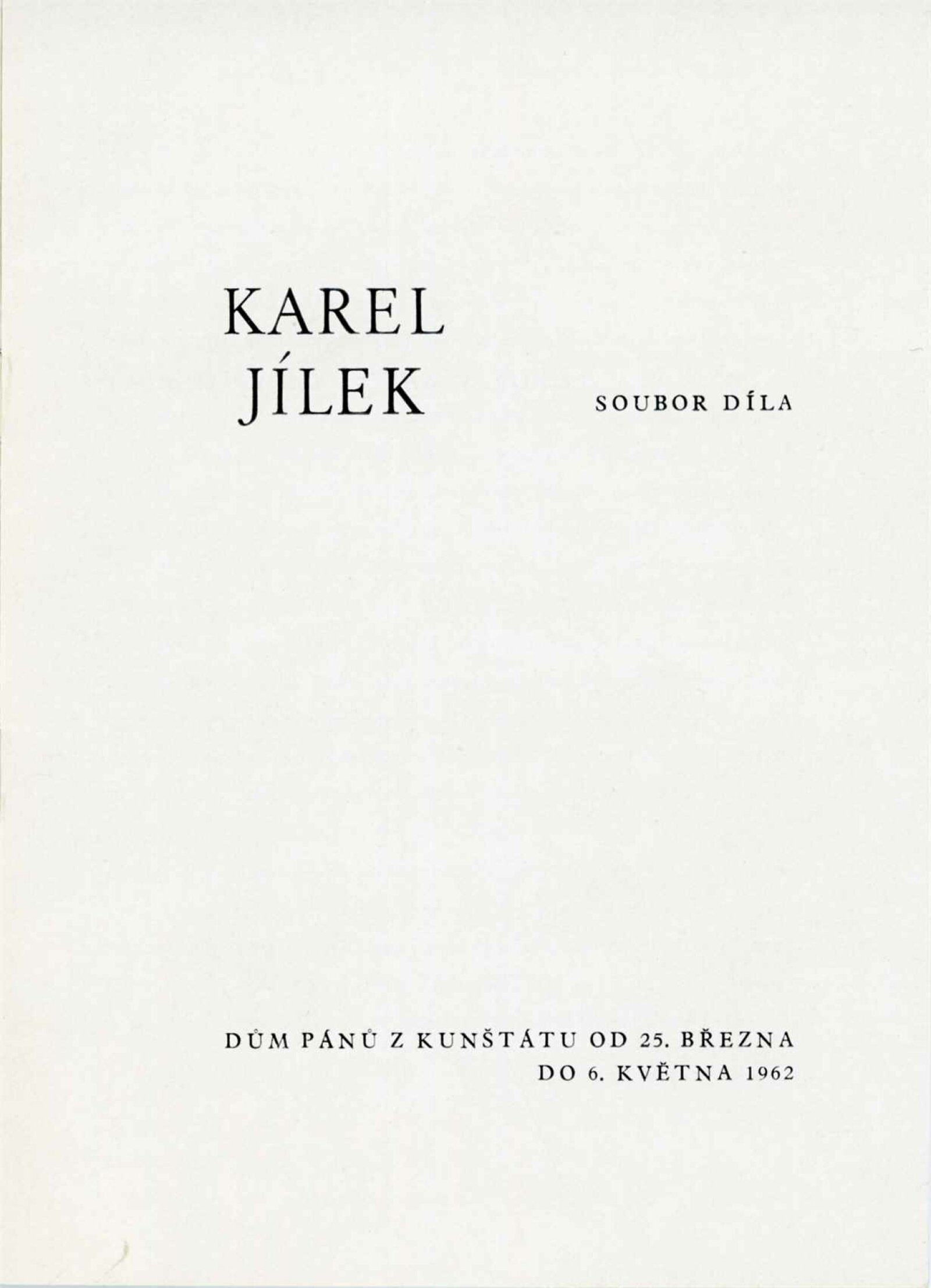 Karel Jílek. Soubor díla: Dům umění města Brna / Dům pánů z Kunštátu, 1. patro, 25. 3. – 6. 5. 1962 / Texty: Čestmír Jeřábek, Albert Kutal. – Brno: DUmB, 1962. – 13 s., obr., DPK 144. – MZK; MG; MMB