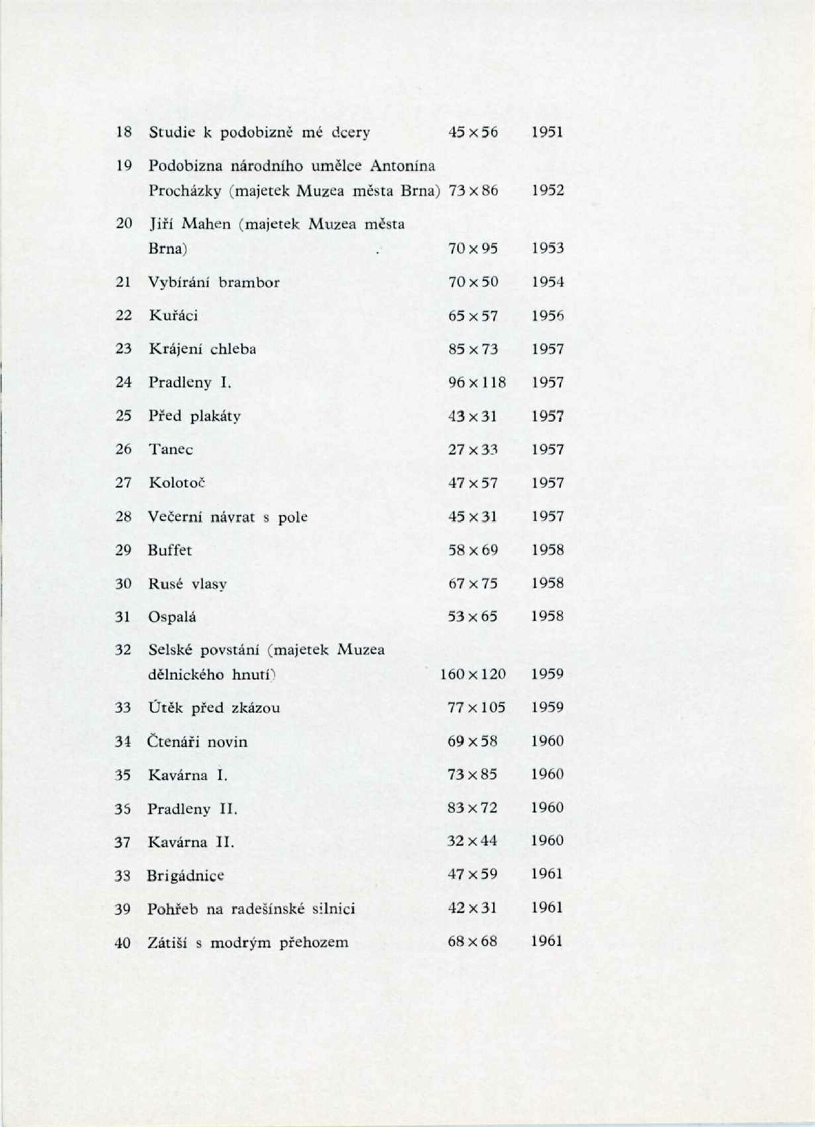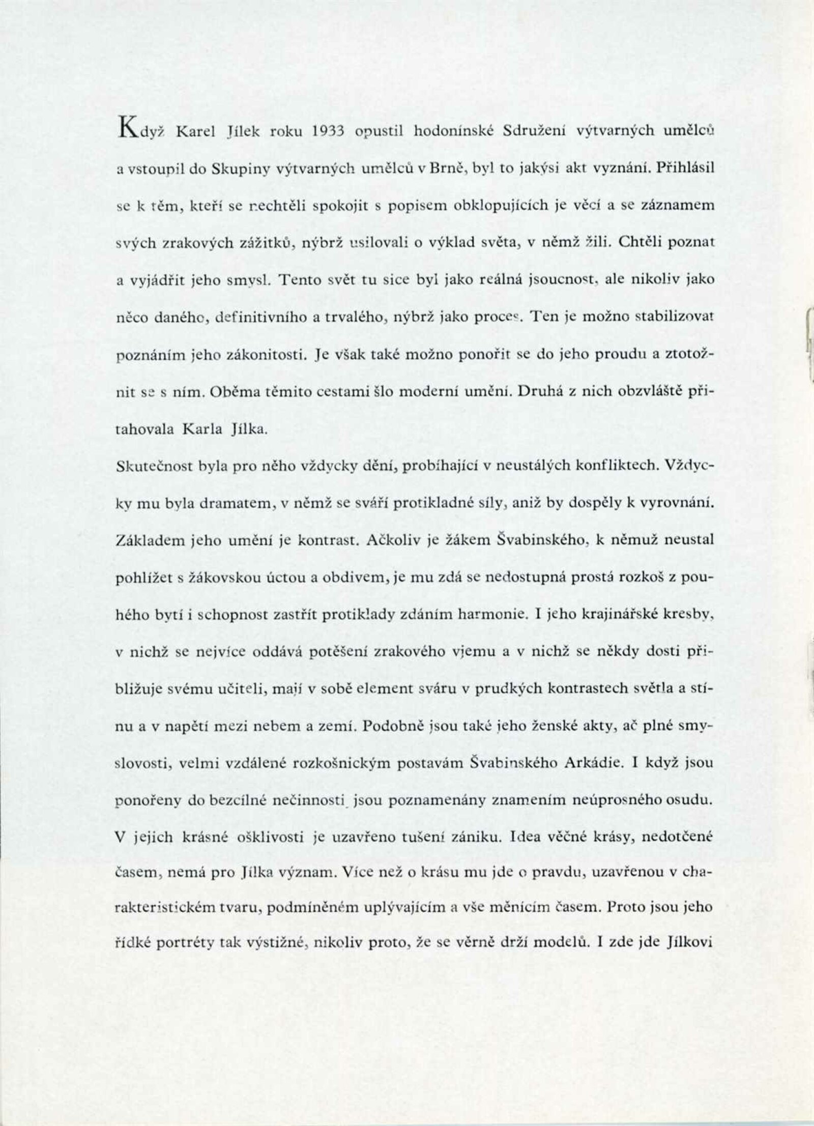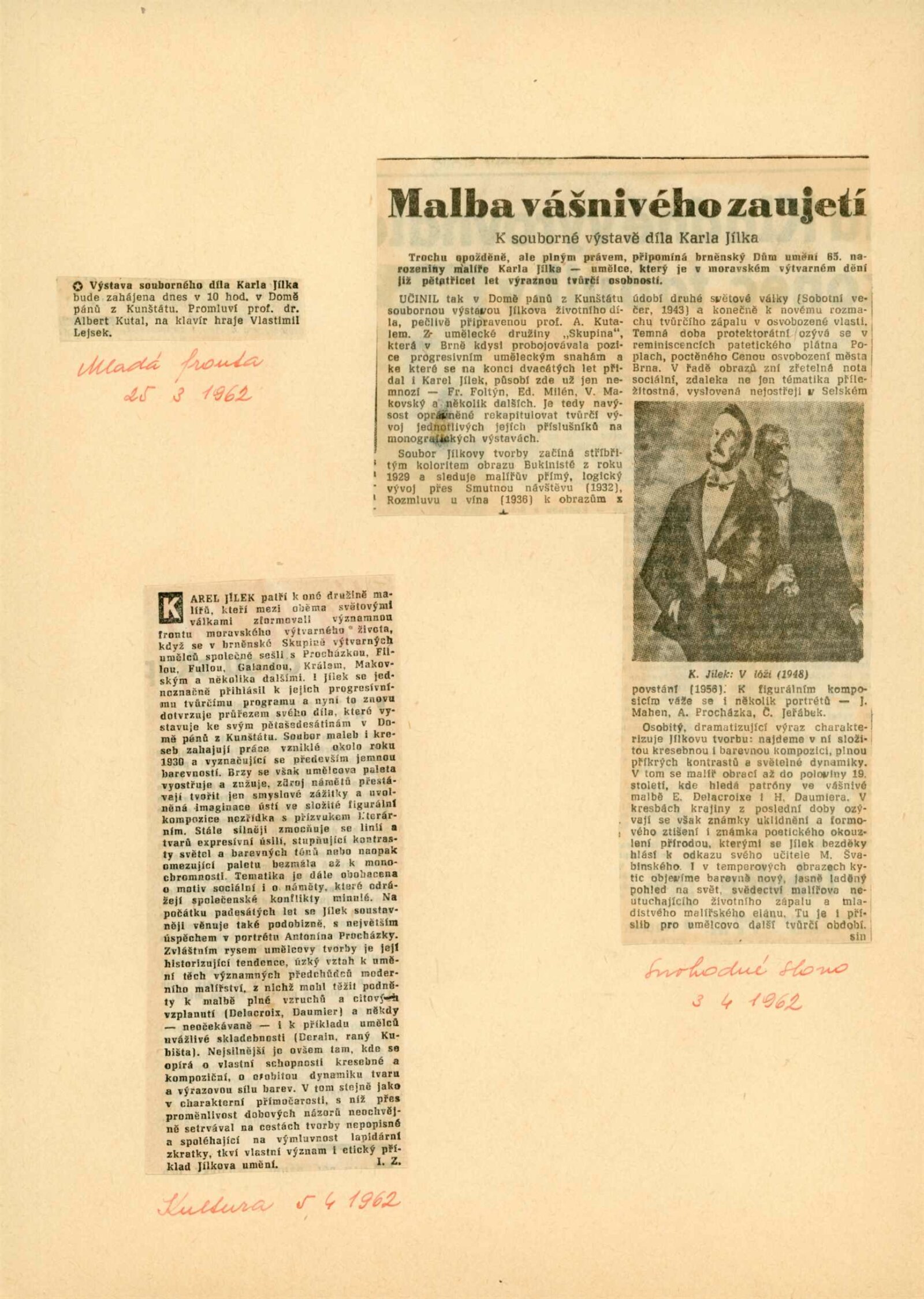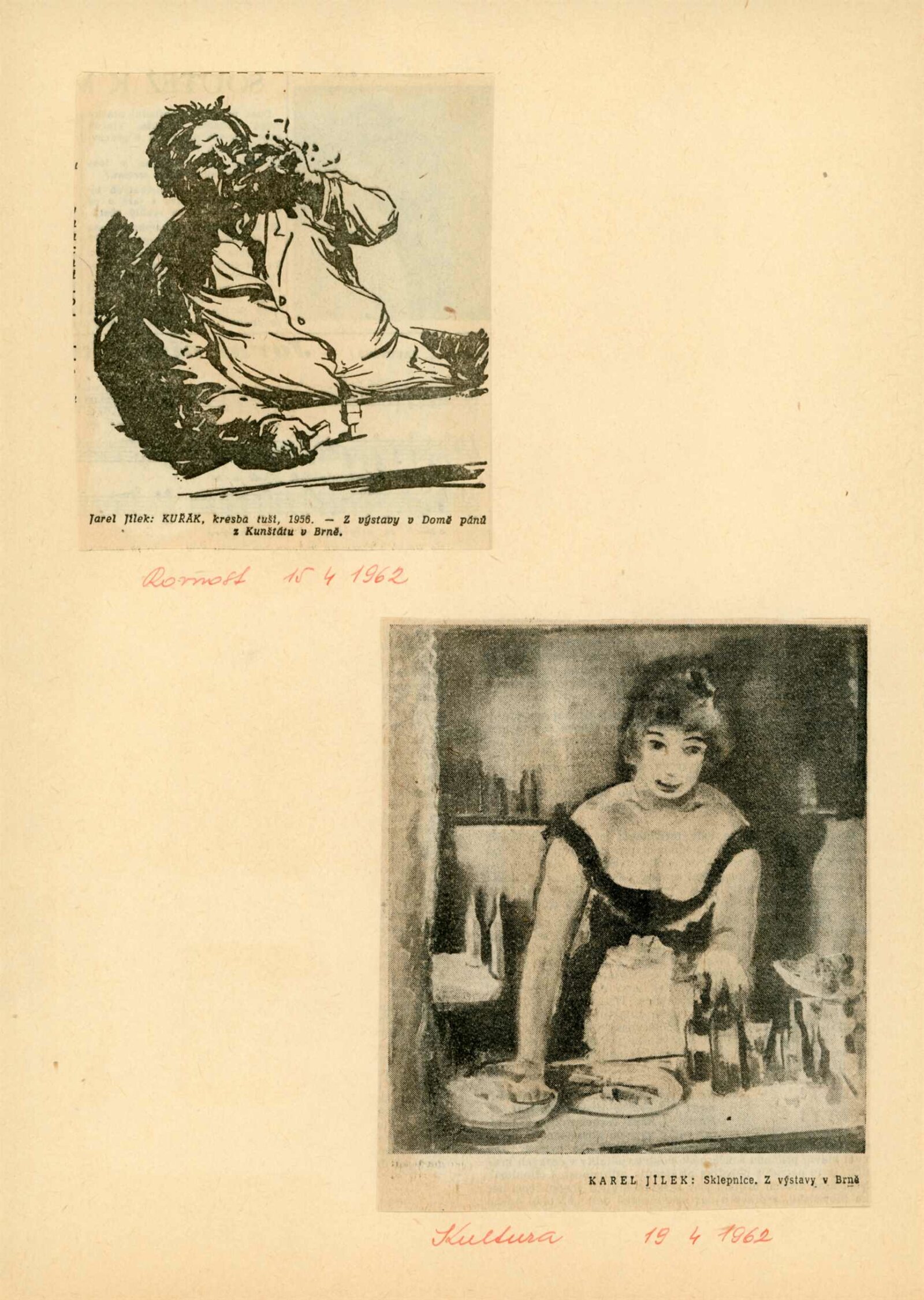 Karel Jílek. Soubor díla: Dům umění města Brna / Dům pánů z Kunštátu, 1. patro, 25. 3. – 6. 5. 1962 / Texty: Čestmír Jeřábek, Albert Kutal. – Brno: DUmB, 1962. – 13 s., obr., DPK 144. – MZK; MG; MMB