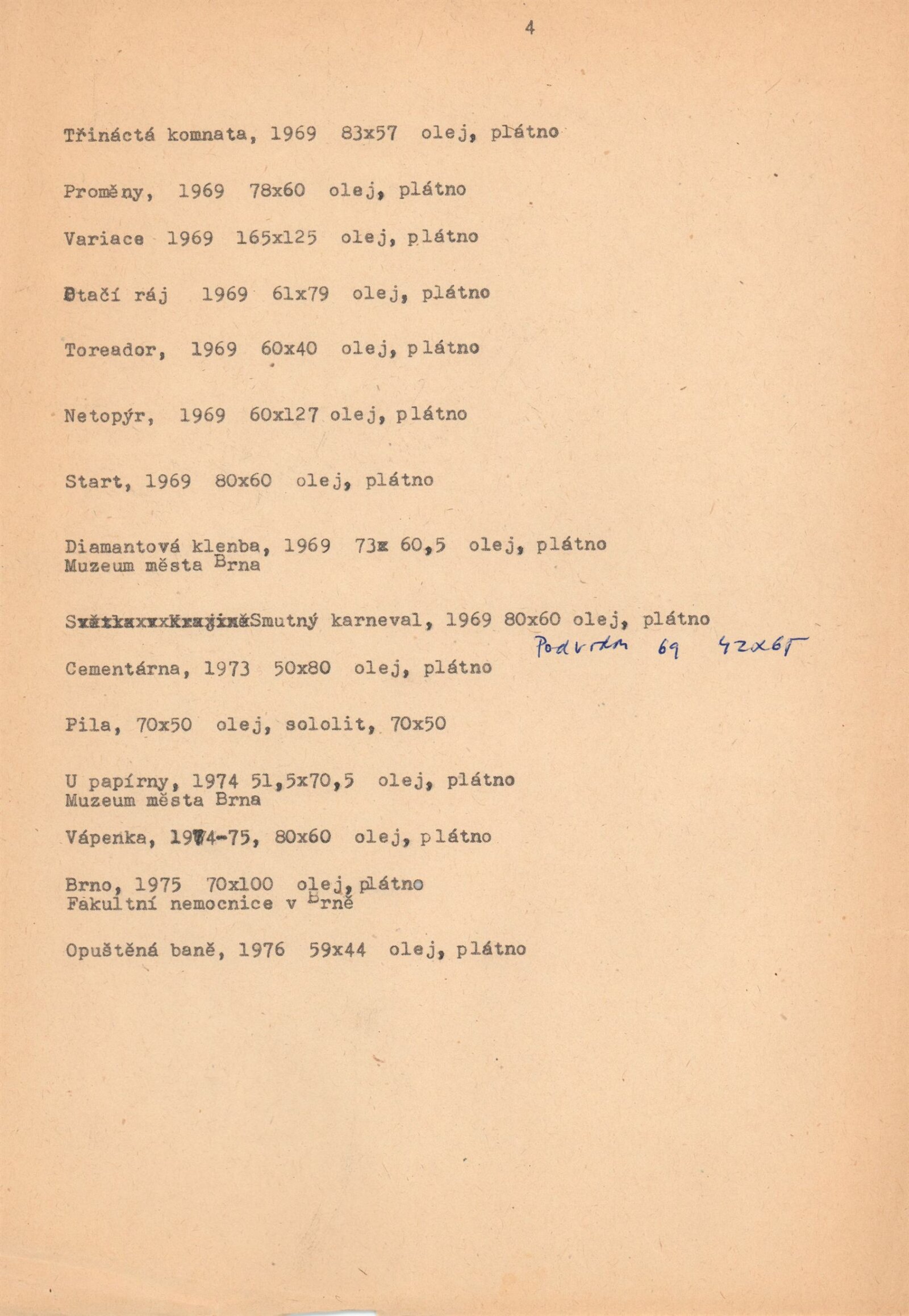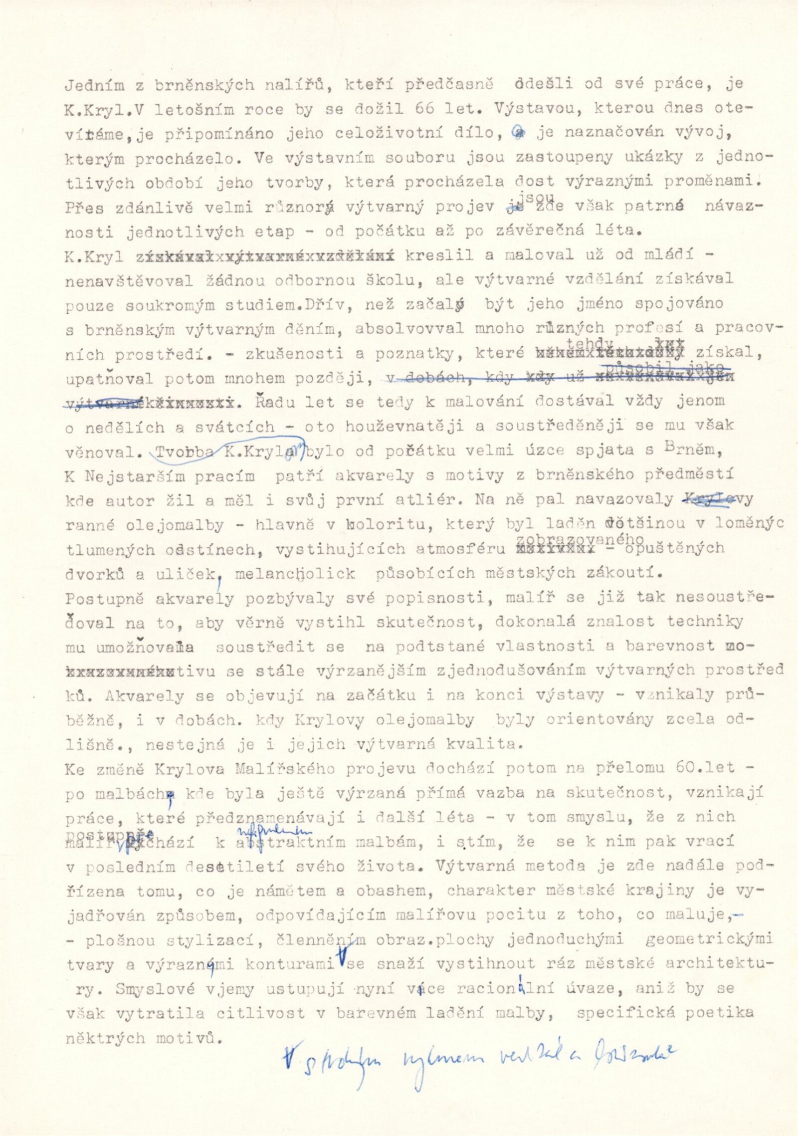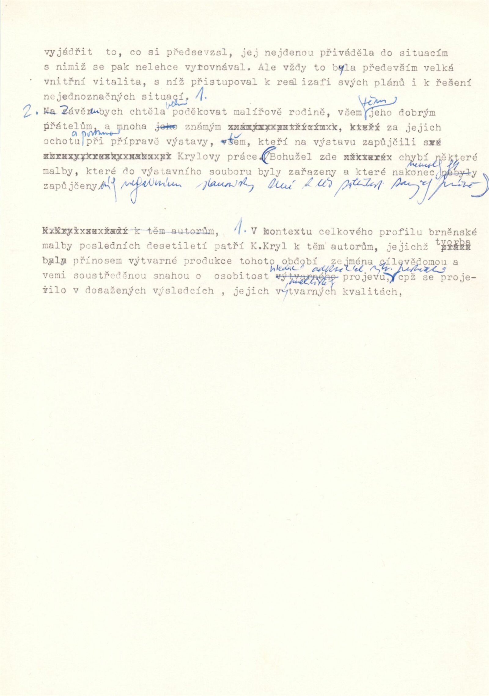 pozvánka, katalog, strojopis a fotografie ke katalogu, seznam vystavených prací, provozní korespondence, výpůjčky, reversy a převzetí, žádost o povolení výstavy, recenze v tisku, katalog výstavy Karla Kryla v MG Brno (1964), v Blansku (1966), DPK Brno (1970) a v Brně (1974), poznámky