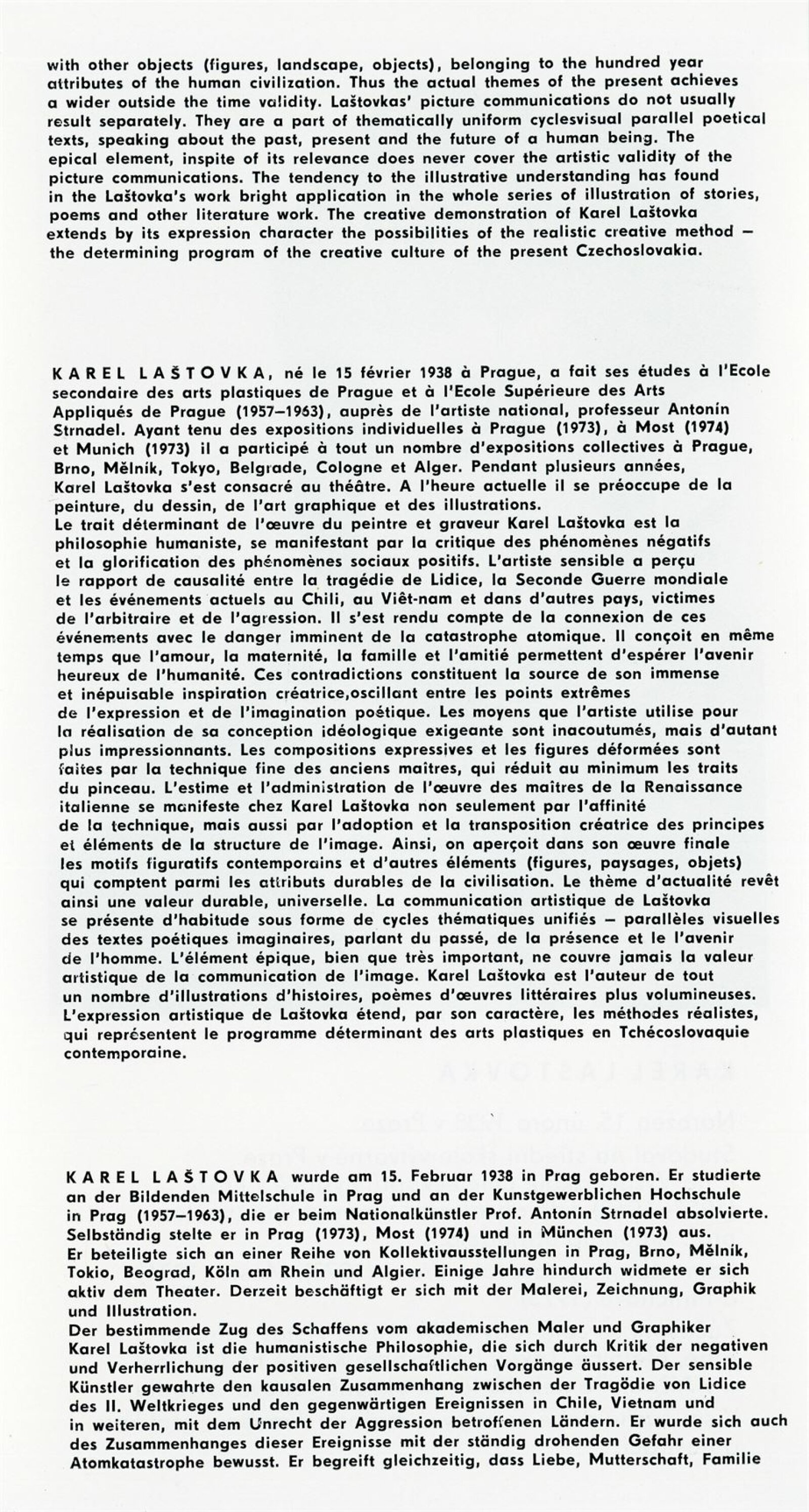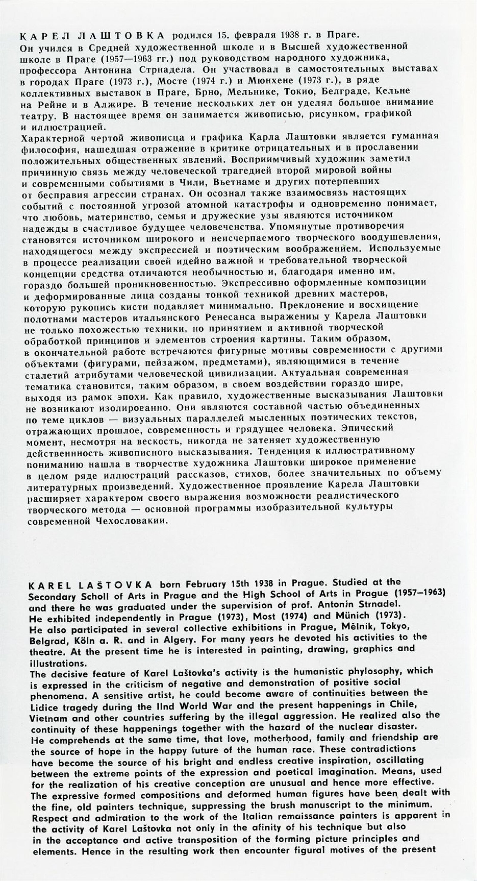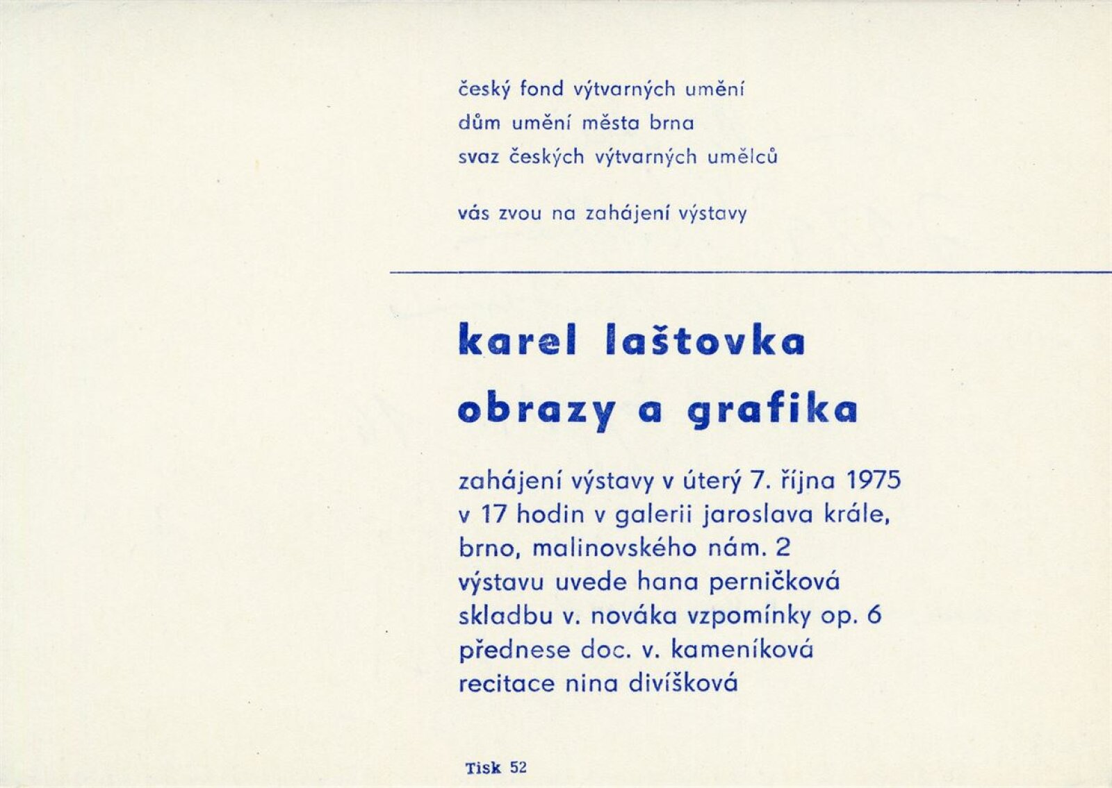 Karel Laštovka. Obrazy a grafika: Dům umění, 68. výstava v Galerii Jaroslava Krále, 7. 10. – 2. 11. 1975 / Text: Zdeněk Čubrda. – Brno: ČFVU, 1975. – 10 s., obr., seznam vystavených prací 2 s., portrét, životopis, DU 627. – MZK; MG; MMB
