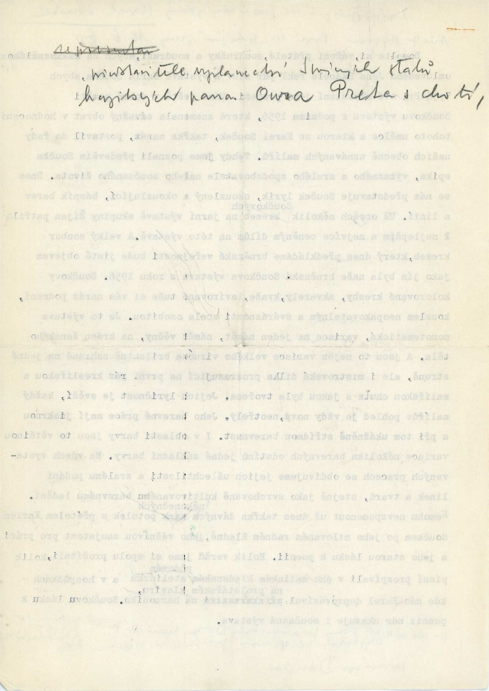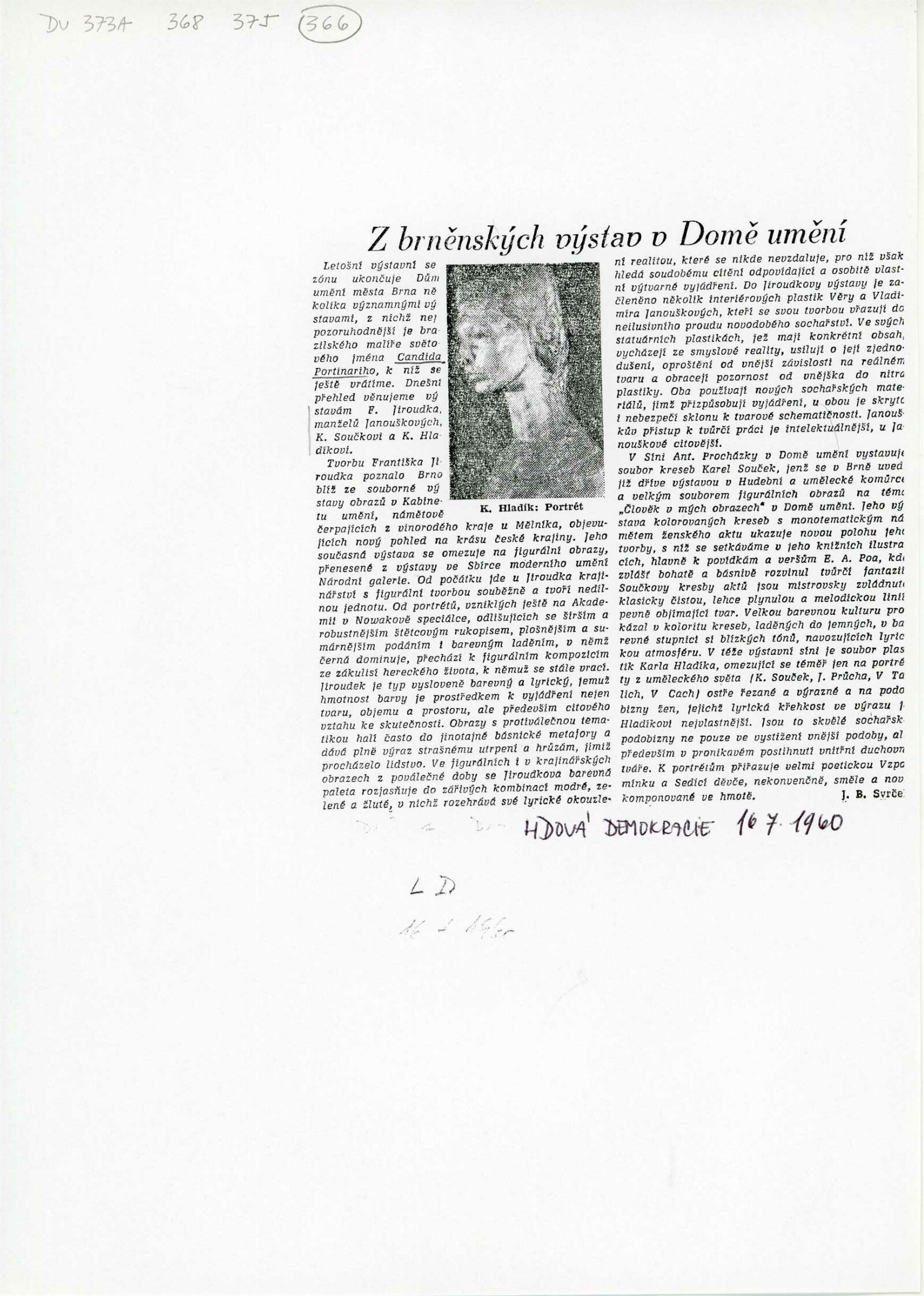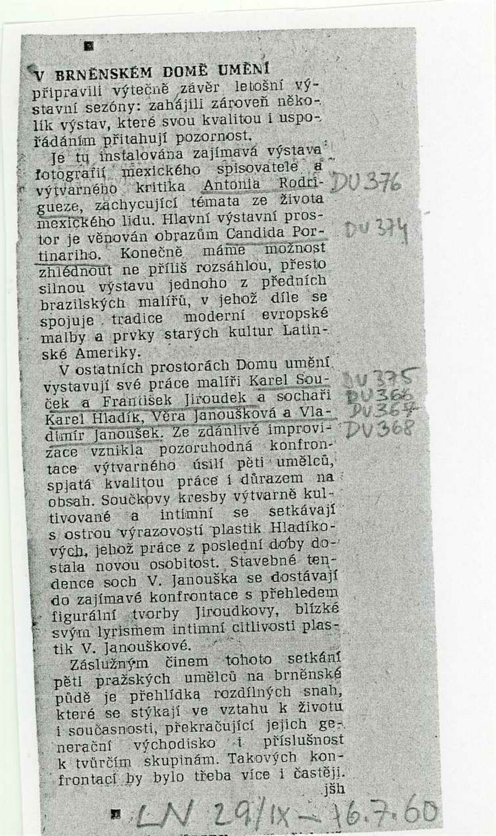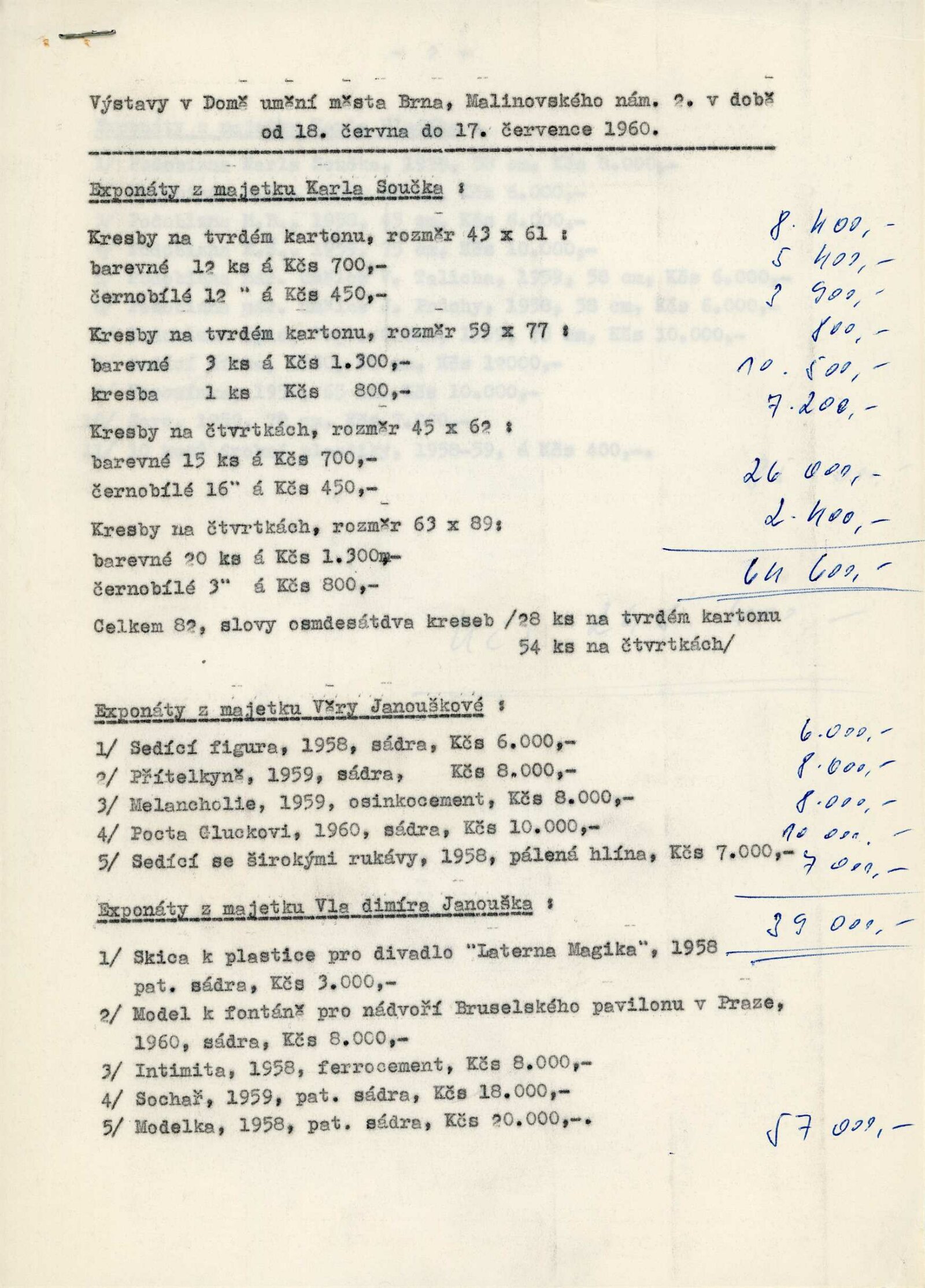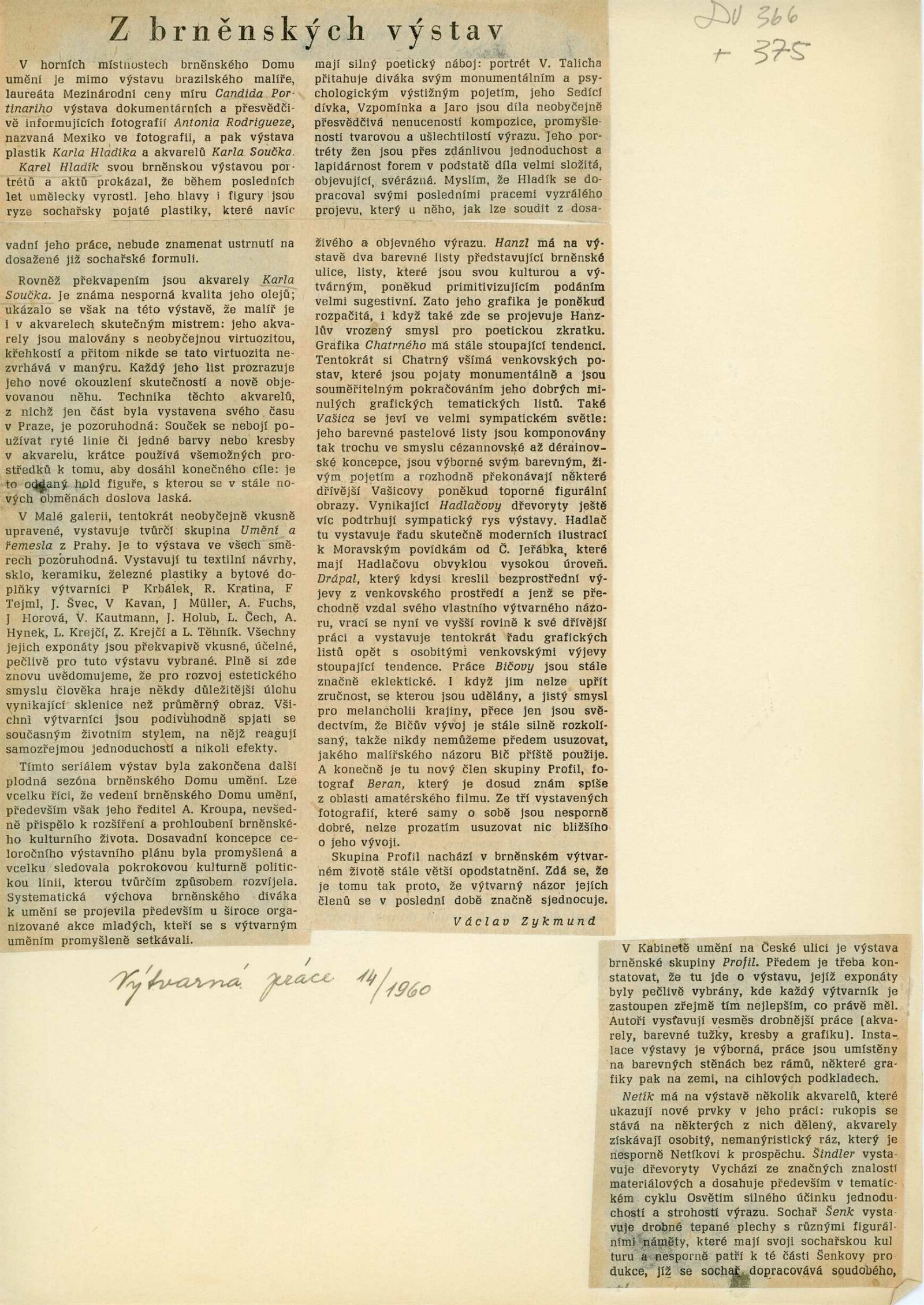 společná pozvánka – Souček, Hladík, Jiroudek, Janouškovi, foto kresby Karla Součka, seznamy prací všech autorů + rukopisy seznamů od vystavujících umělců, soupis exponátů tvůrčí skupiny Umění a řemesla, korespondence (Adolf Kroupa s Karlem Součkem, manželi Janouškovými, Karlem Hladíkem a Františkem Jiroudkem, projev z vernisáže Karla Součka od Adolfa Kroupy, provozní korespondence), reversy, pojištění děl, recenze v tisku (i recenze Václava Zykmunda)
