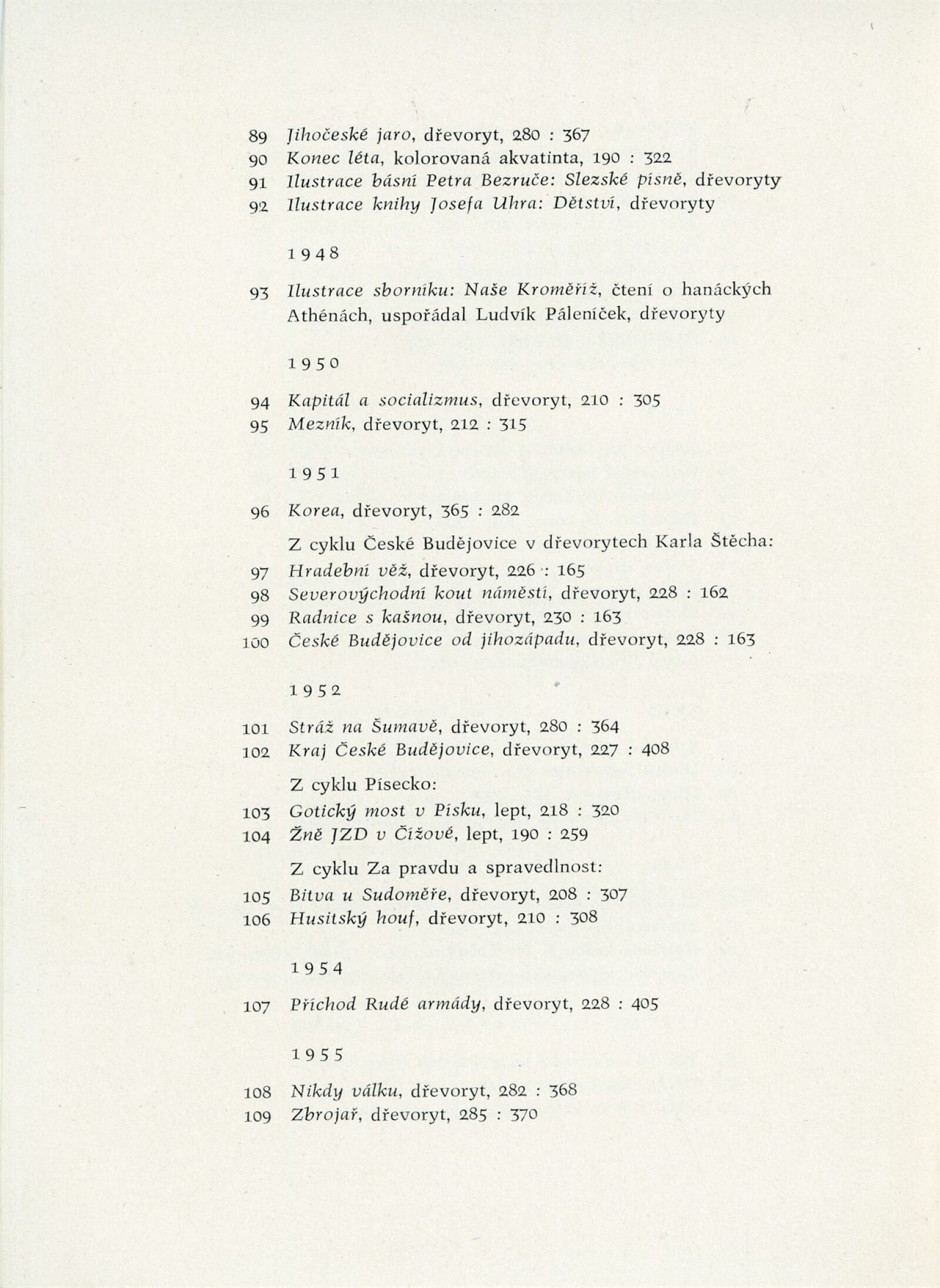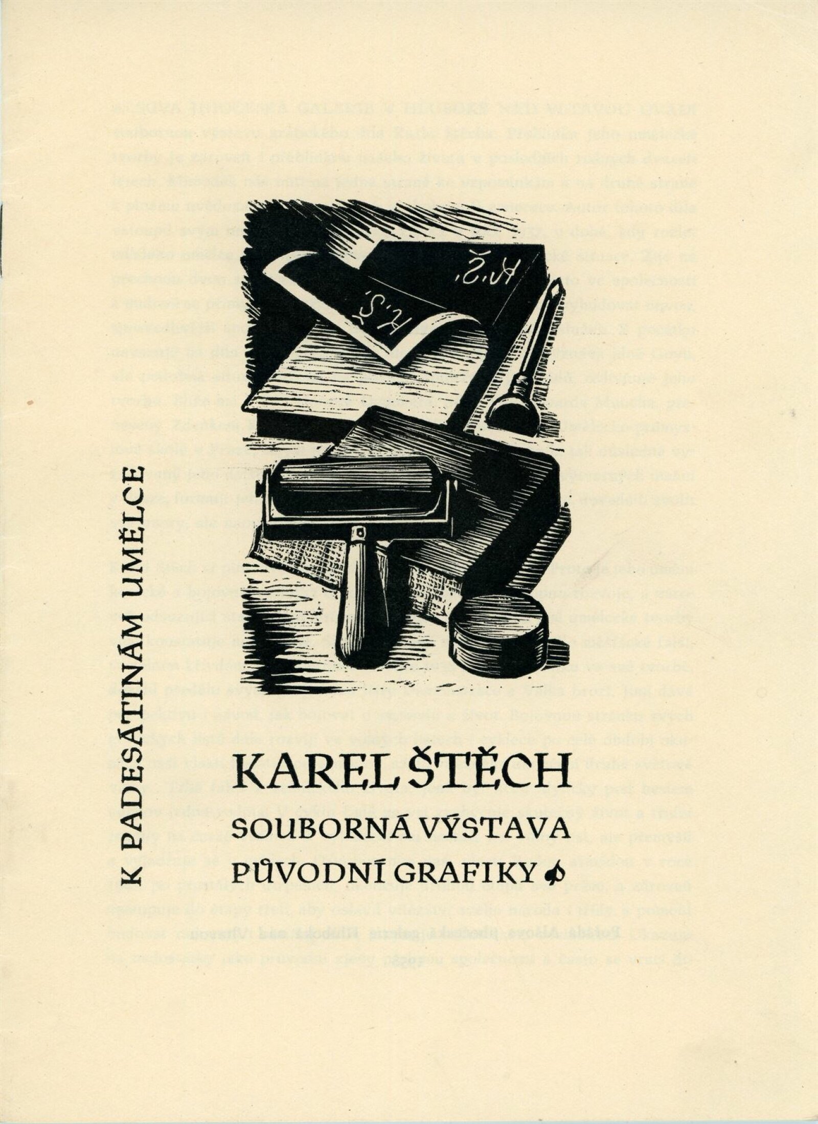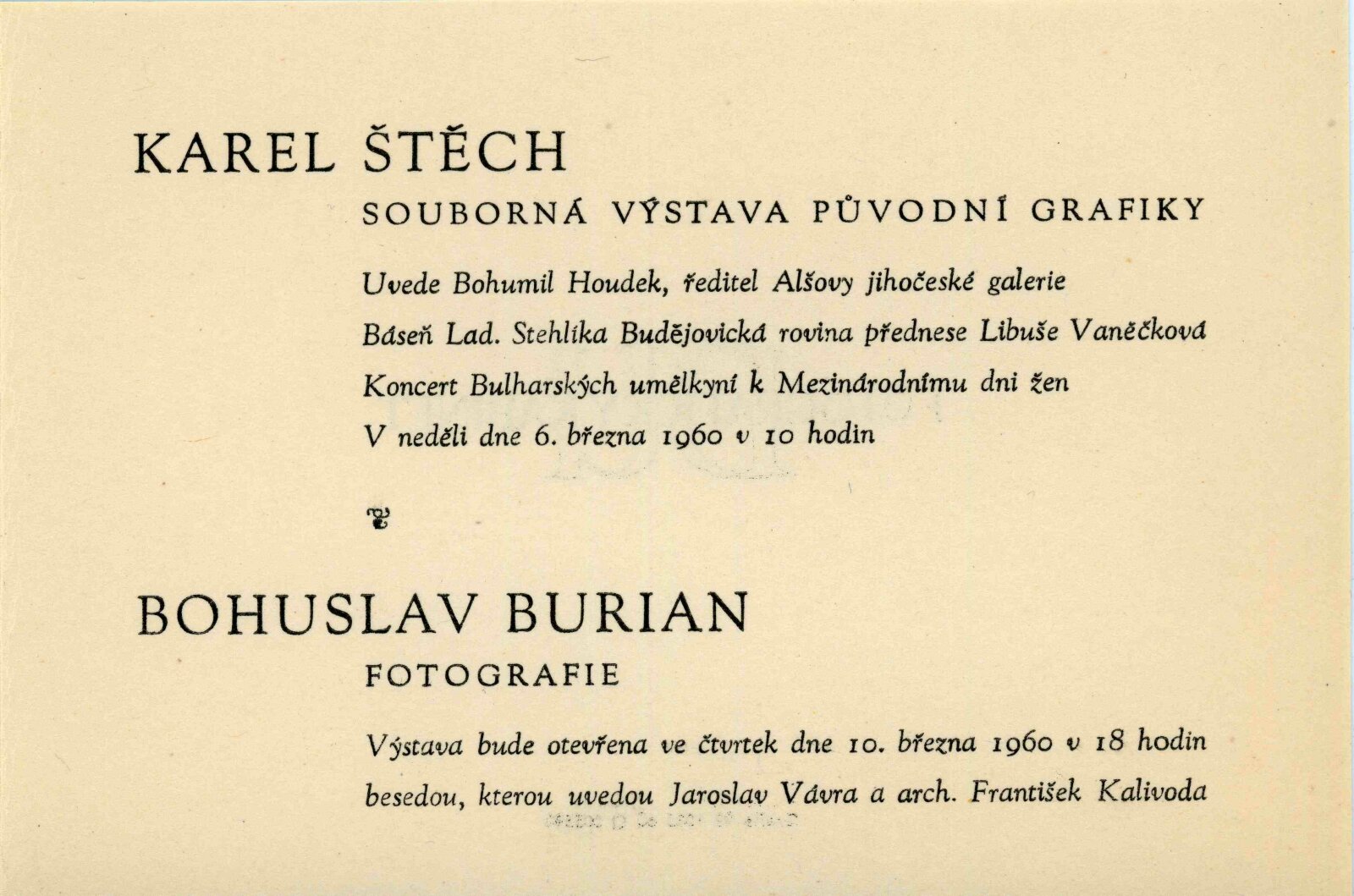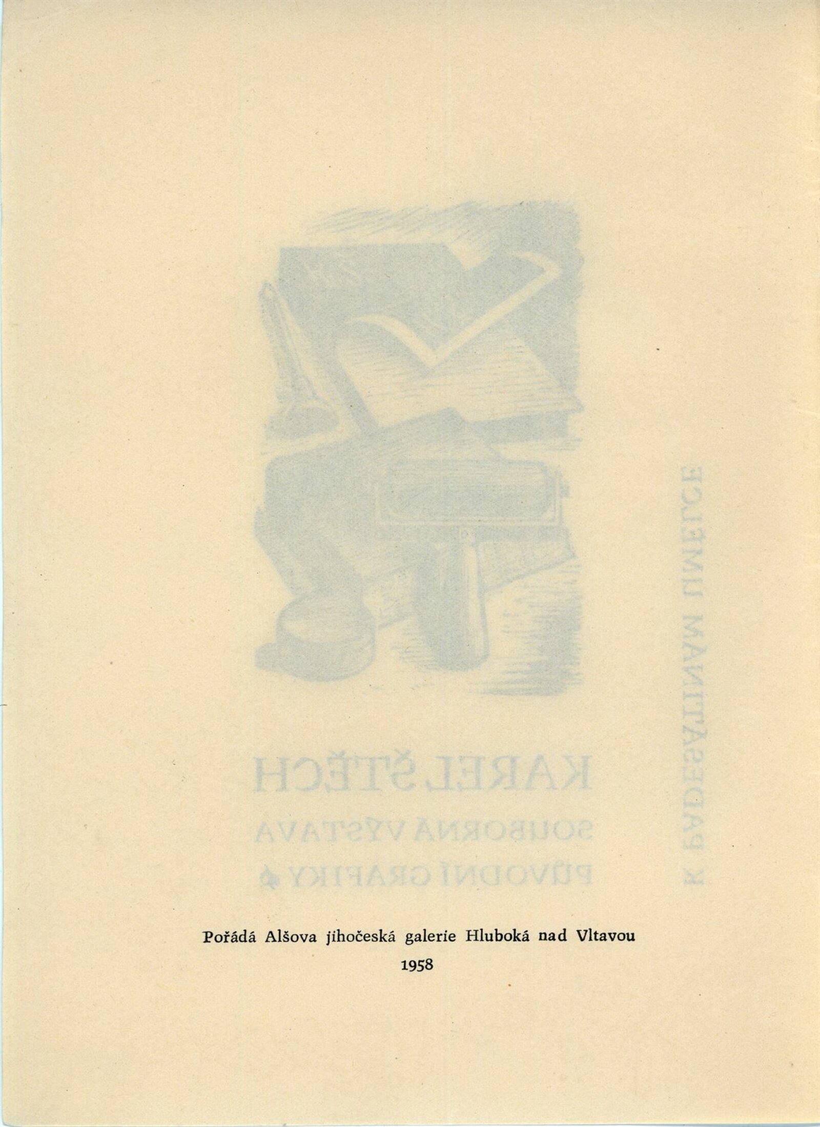 Karel Štěch. Souborná výstava původní grafiky: Dům umění města Brna / Dům pánů z Kunštátu, 11. výstava Kabinetu grafiky, 6. 3. – 3. 4. 1960 / Převzatý katalog. Karel Štěch. Souborná výstava původní grafiky. K padesátinám umělce: Alšova jihočeská galerie Hluboká nad Vltavou, 1958 / Text: Bohumil Houdek. – Hluboká nad Vltavou: AJG, 1958. – 17 s., obr., DPK 59