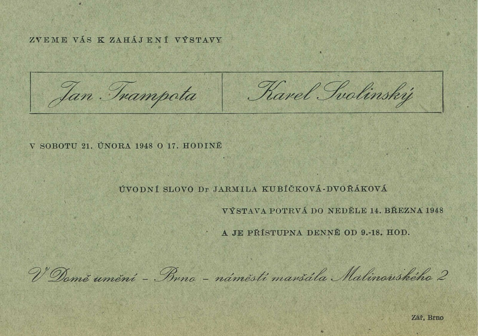 Katalog výstav Domu umění, pořádaných 18. 2. – 7. 3. 1948 / Obsahuje výstavy: Jan Trampota, Karel Svolinský, Ruské lidové tisky z XIX. století, Marc Chagall. – Brno: SVU Aleš, 1948. – 8 s., životopisná data vystavujících, DU 64–67. – AMB