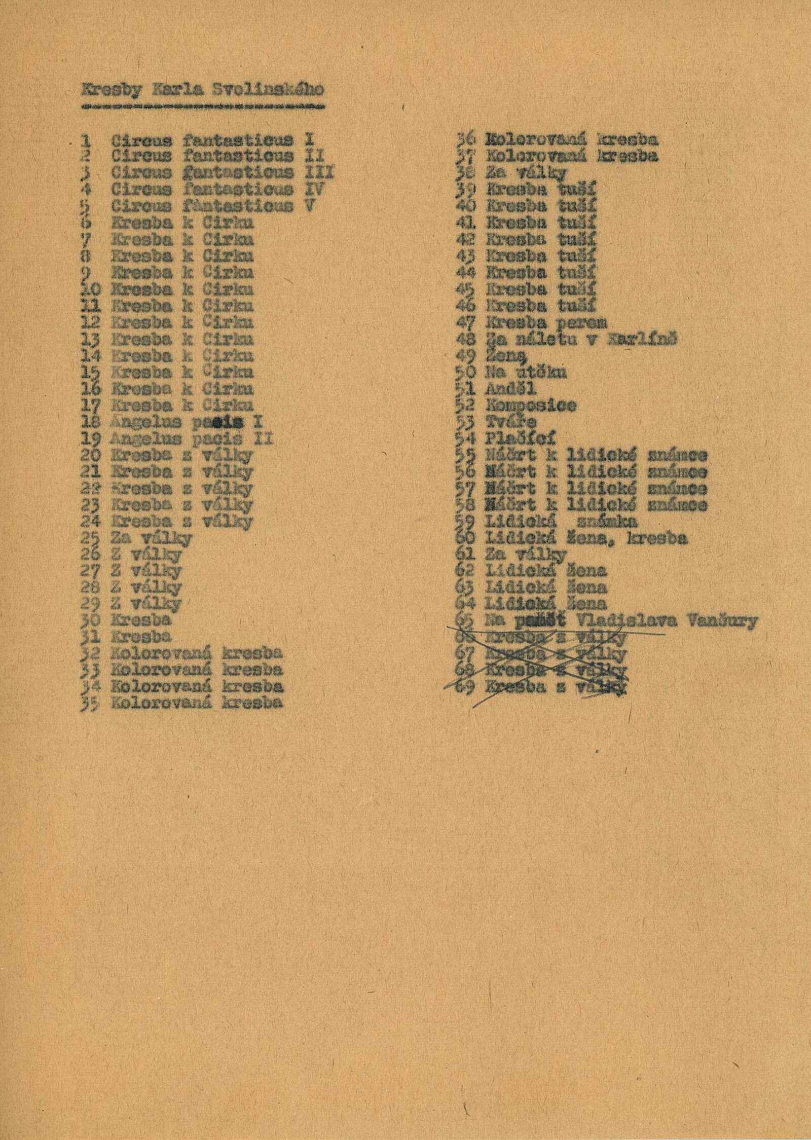 společná pozvánka s DU 66, společný tištěný seznam vystavených prací (K 195, viz DU 64), seznam vystavených prací, fotografie z výstavy, korespondence (o článku v časopisu Blok), kresebný návrh pozvánky (Karel Svolinský, návrh nebyl použit)