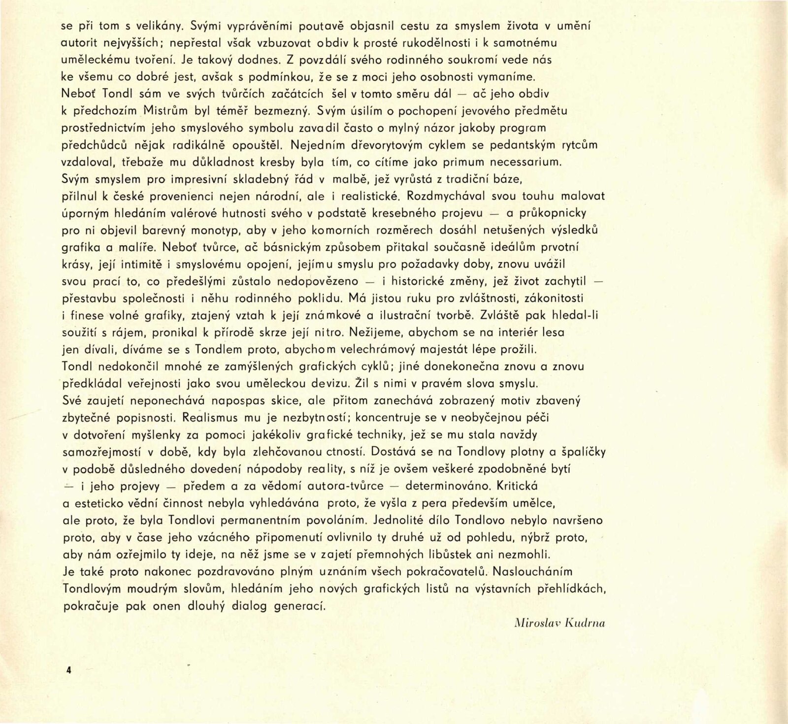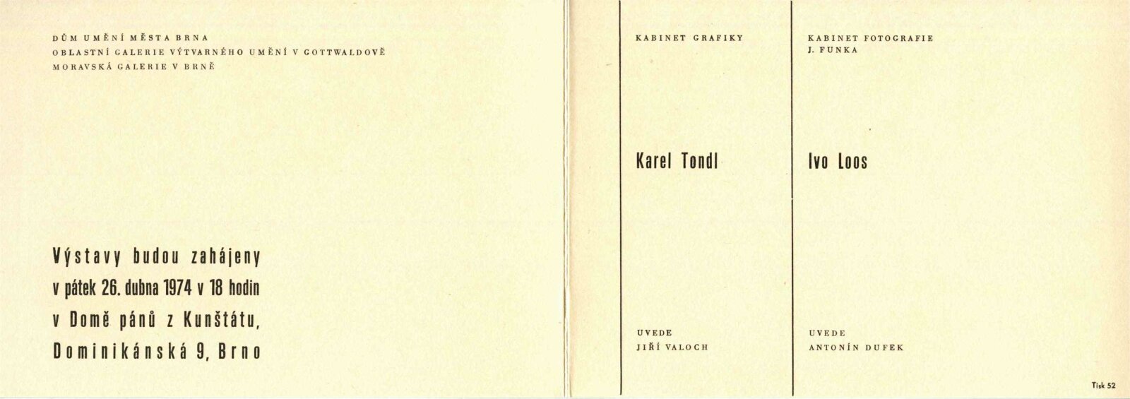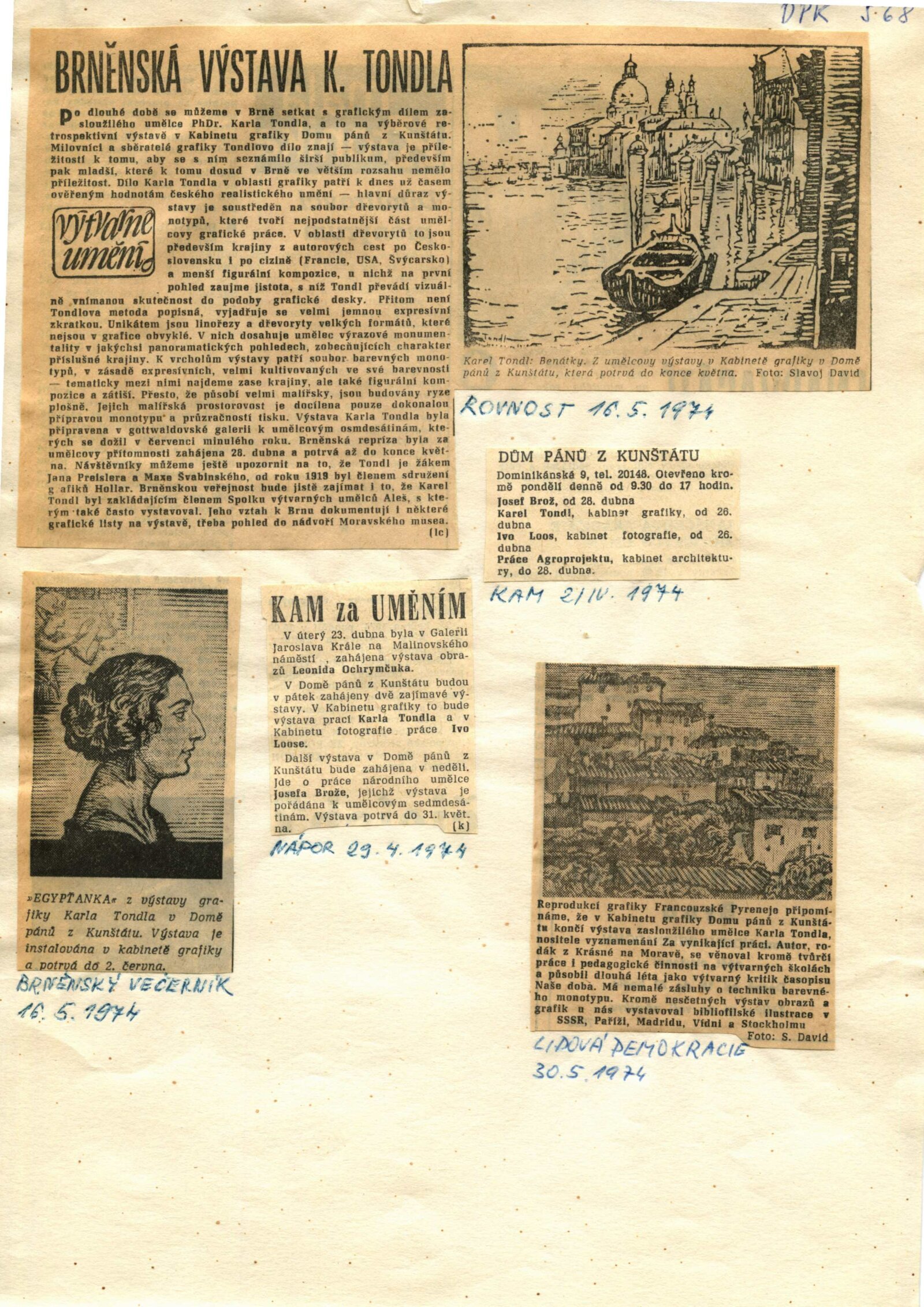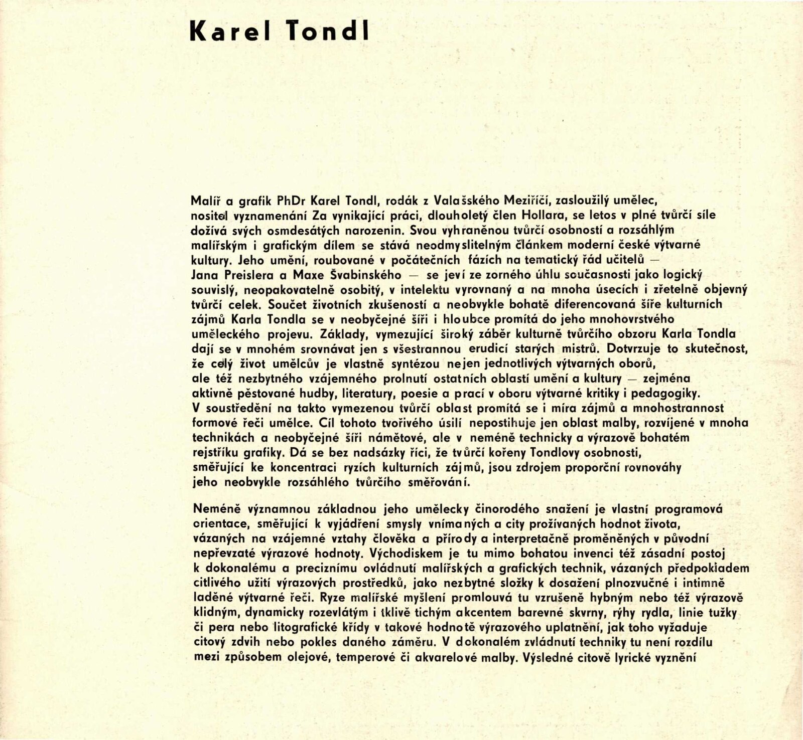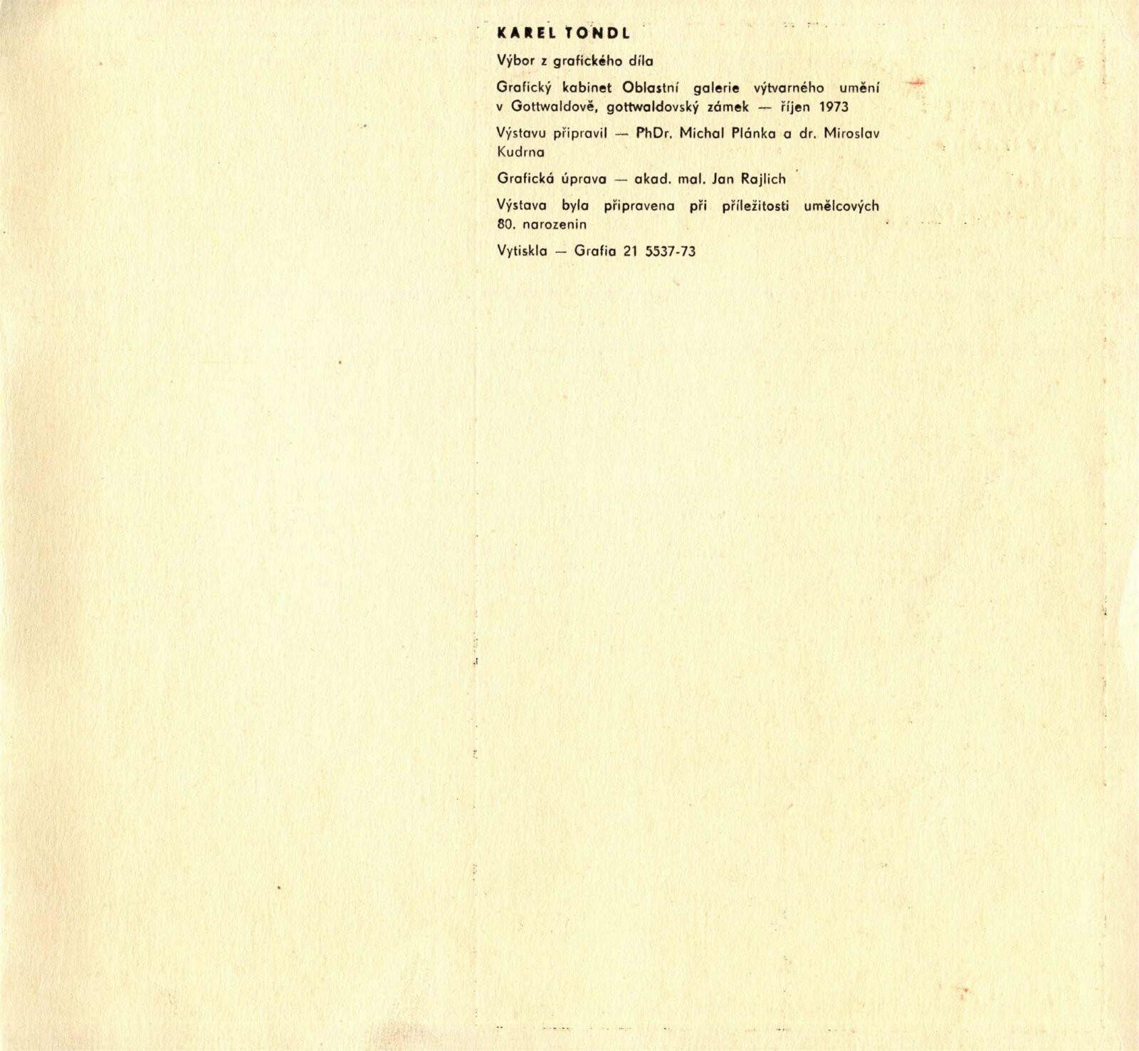 Karel Tondl: Dům umění / Dům pánů z Kunštátu, 142. výstava Kabinetu grafiky, 26. 4. – 2. 6. 1974 / Převzatý katalog. Karel Tondl. Výbor z grafického díla: Grafický kabinet Oblastní galerie výtvarného umění v Gottwaldově, říjen 1973 / Texty: Michal Plánka, Miroslav Kudrna. – Gottwaldov: Oblastní galerie výtvarného umění, 1973. – 15 s., obr., DPK 568. – MZK; MG
