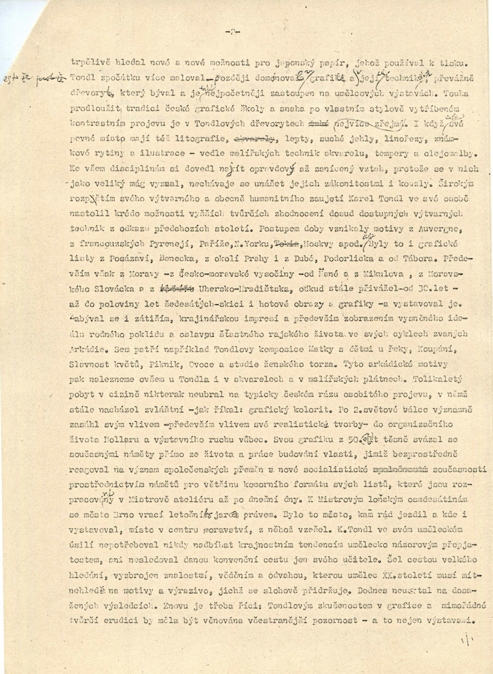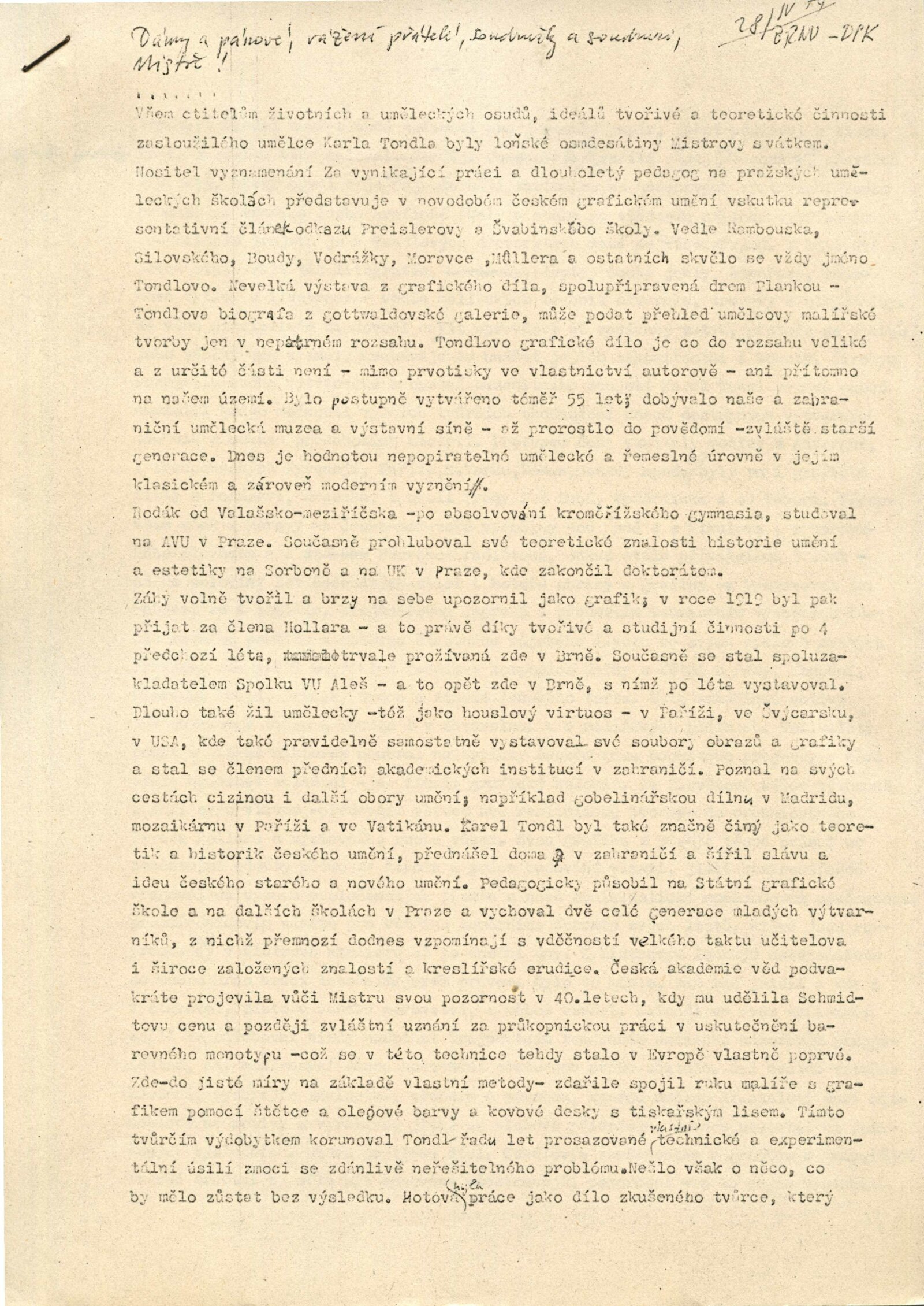 společná pozvánka DPK 568 a 569, katalog, fotografie výstavy v Kabinetu grafiky, strojopis úvodního slova Miroslava Kudrny, informace k výstavě, hlášení o vernisážích v DPK, korespondence (Karel Tondl, Miroslav Kudrna), rukopis Karla Tondla, smlouva, reverz (OG Gottwaldov se seznamem), žádost o povolení výstavy, recenze v tisku