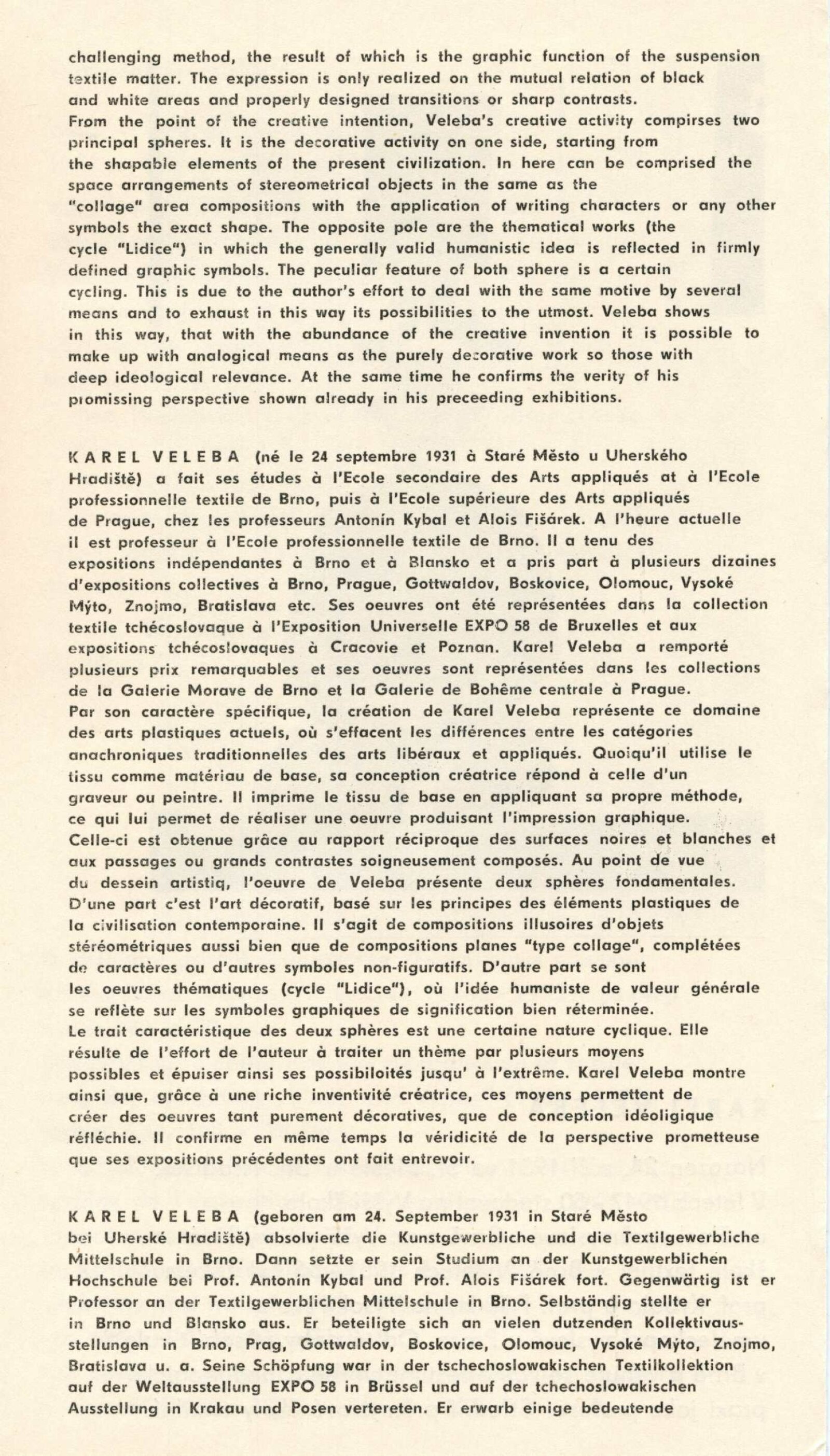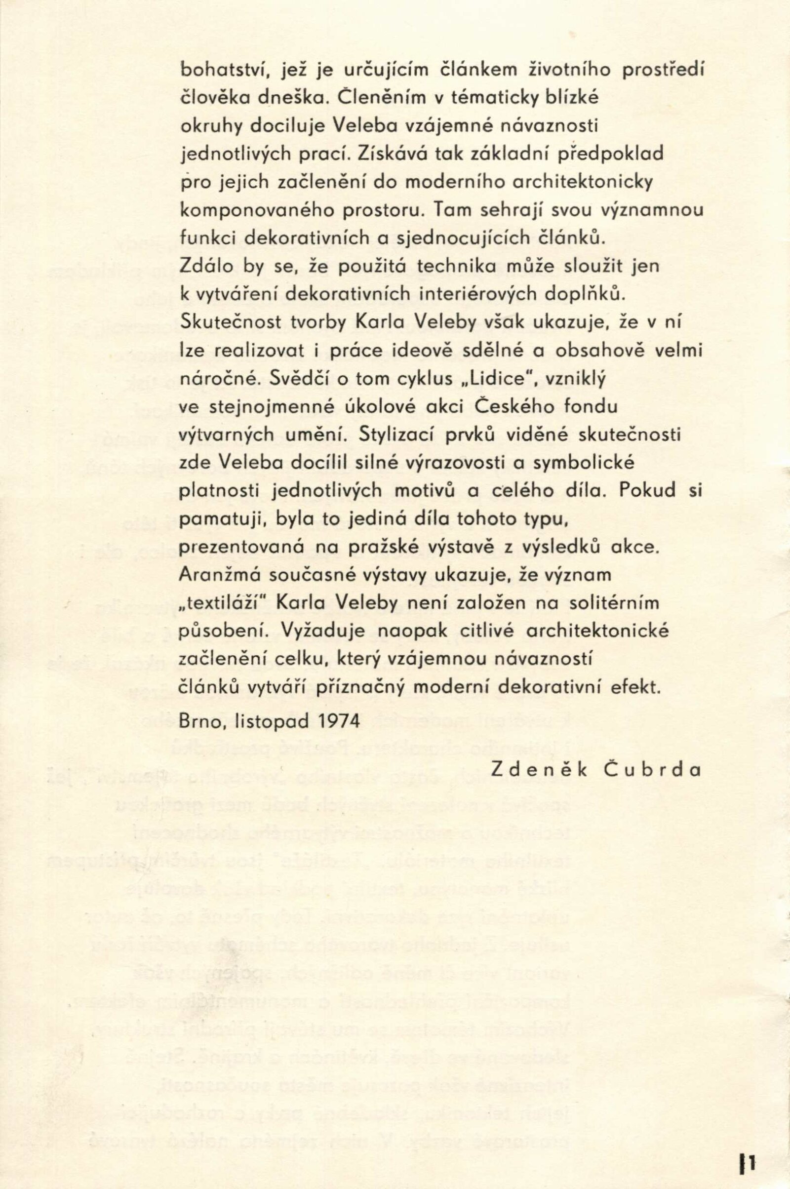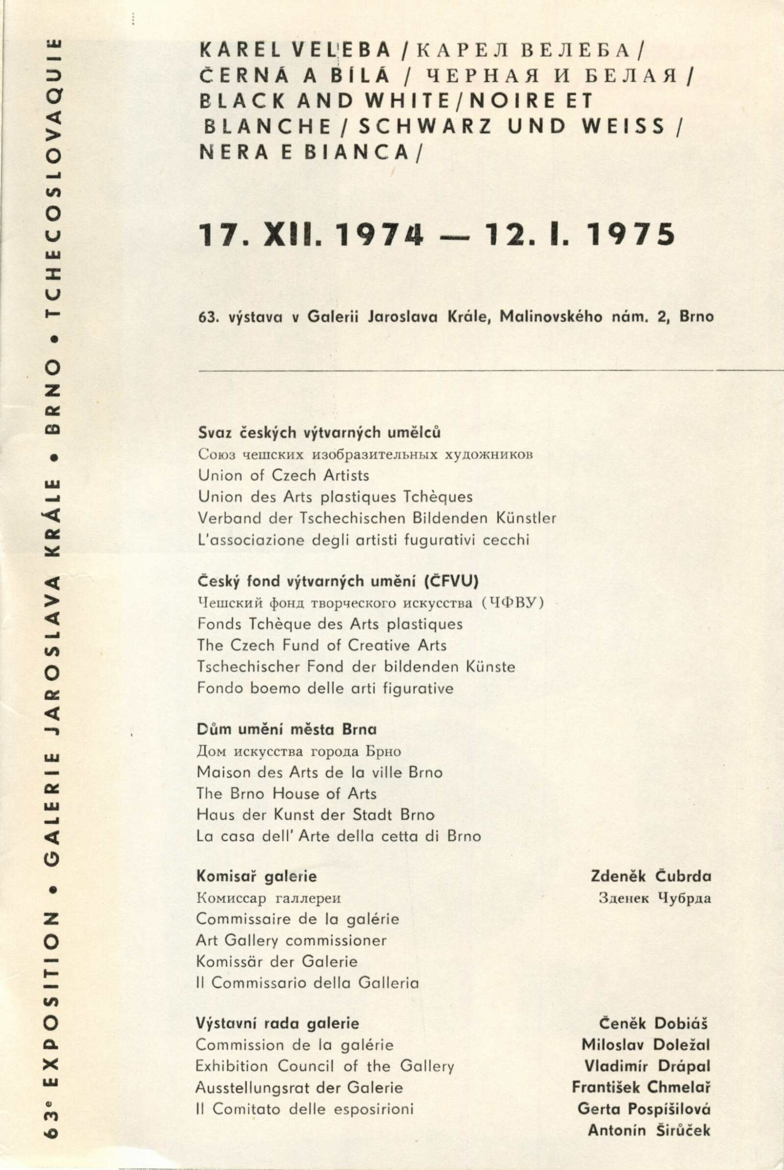 Karel Veleba. Černá a bílá: Dům umění, 63. výstava v Galerii Jaroslava Krále, 17. 12. 1974 – 12. 1. 1975 / Text: Zdeněk Čubrda. – Brno: ČFVU, 1974. – 10 s., obr., seznam vystavených prací 2 s., portrét, životní data, seznam výstav, DU 617. – MZK; MG; MMB