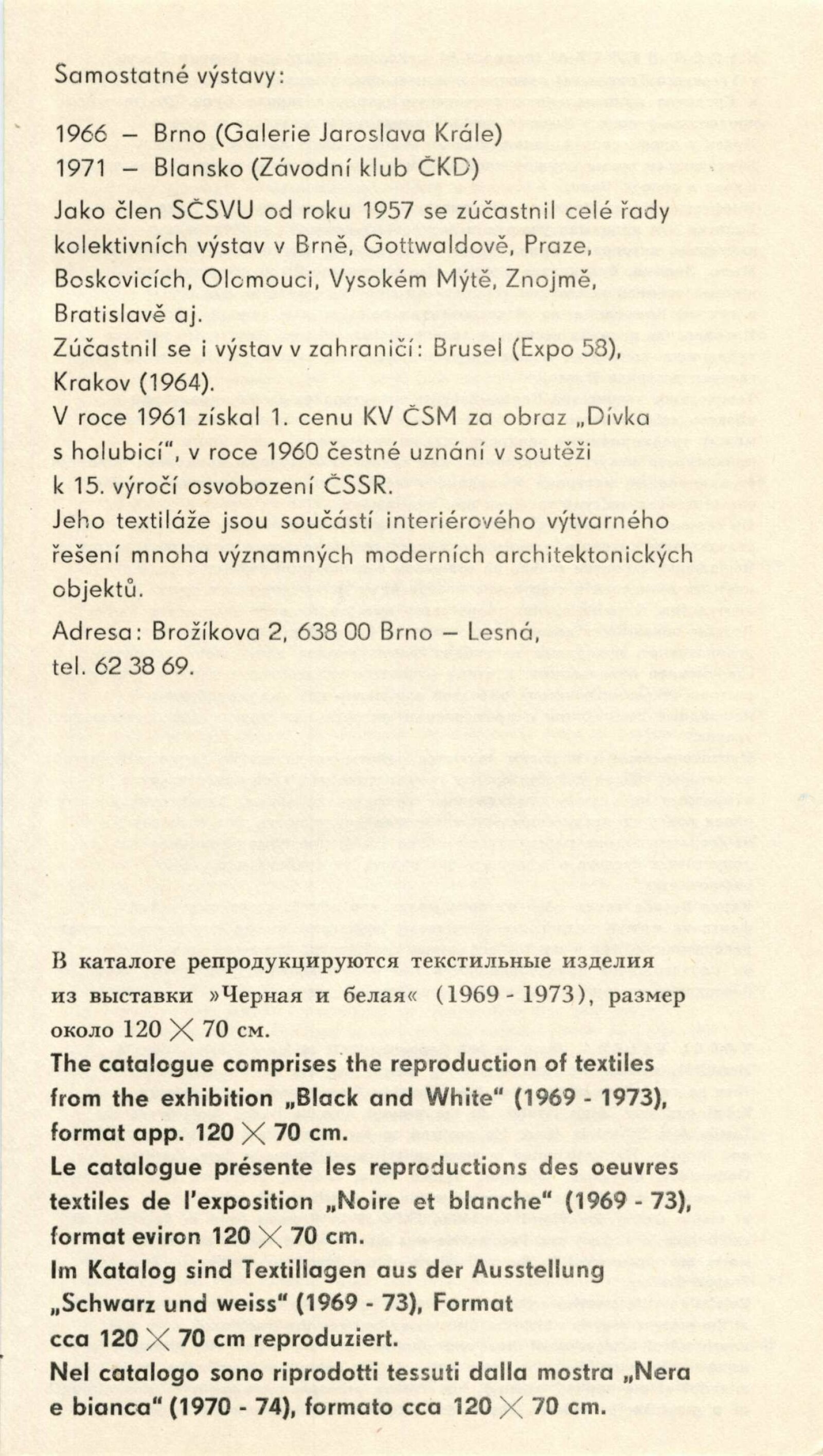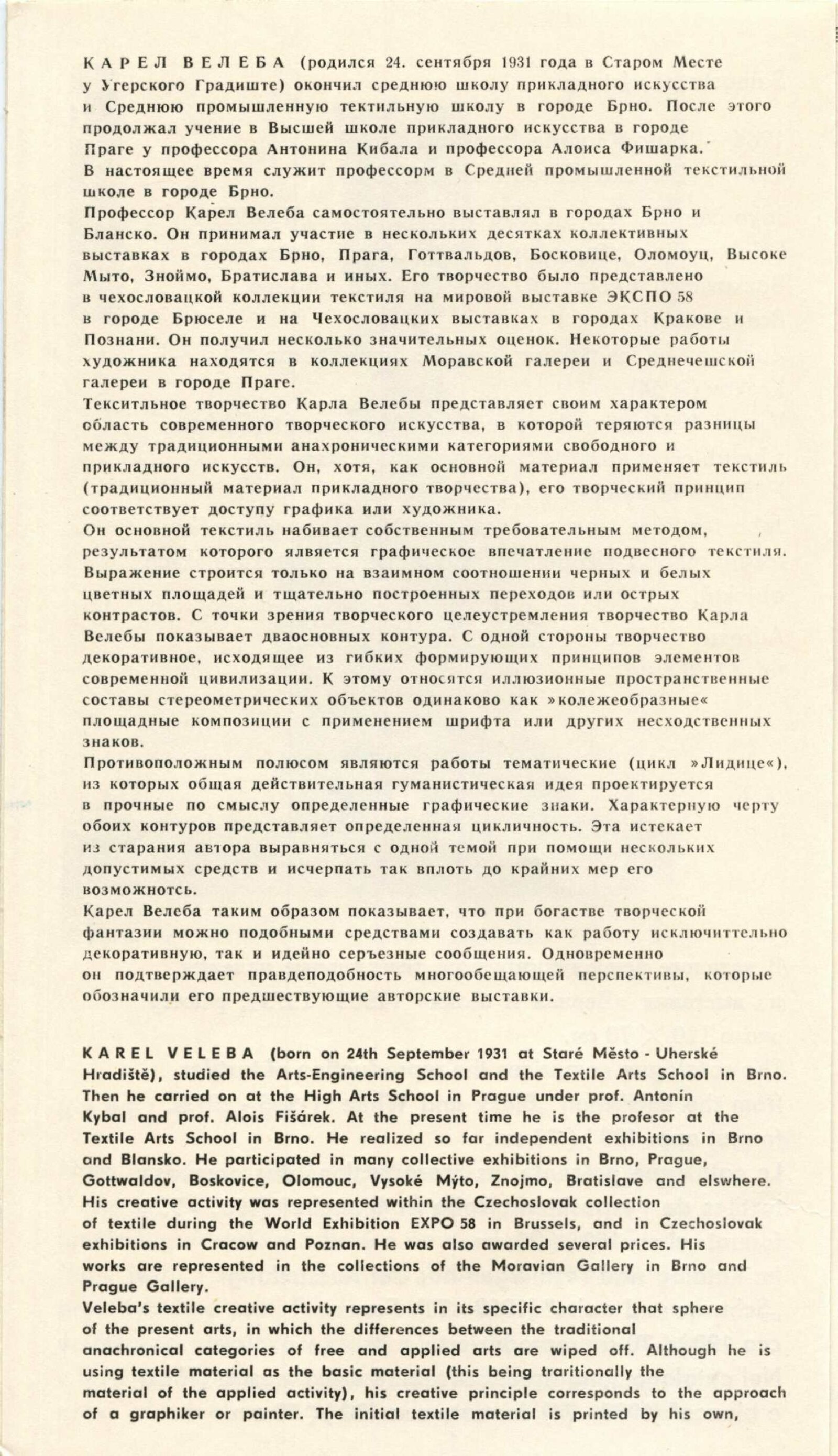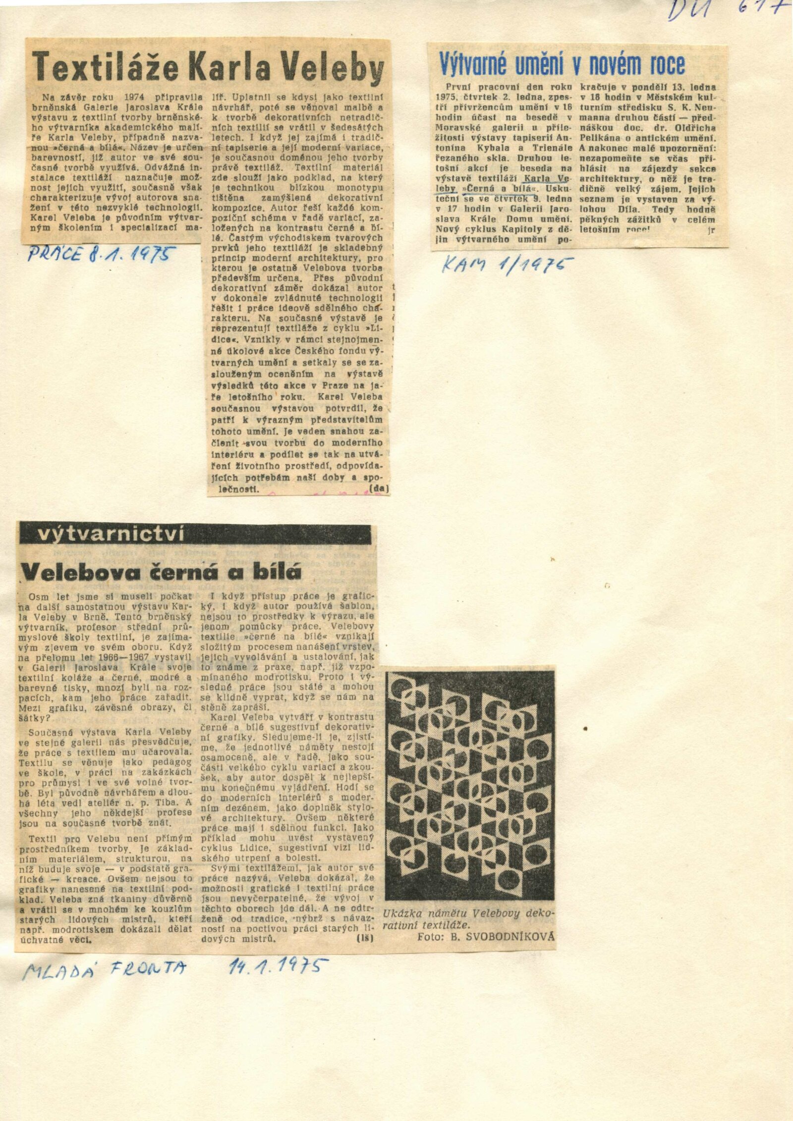 Karel Veleba. Černá a bílá: Dům umění, 63. výstava v Galerii Jaroslava Krále, 17. 12. 1974 – 12. 1. 1975 / Text: Zdeněk Čubrda. – Brno: ČFVU, 1974. – 10 s., obr., seznam vystavených prací 2 s., portrét, životní data, seznam výstav, DU 617. – MZK; MG; MMB