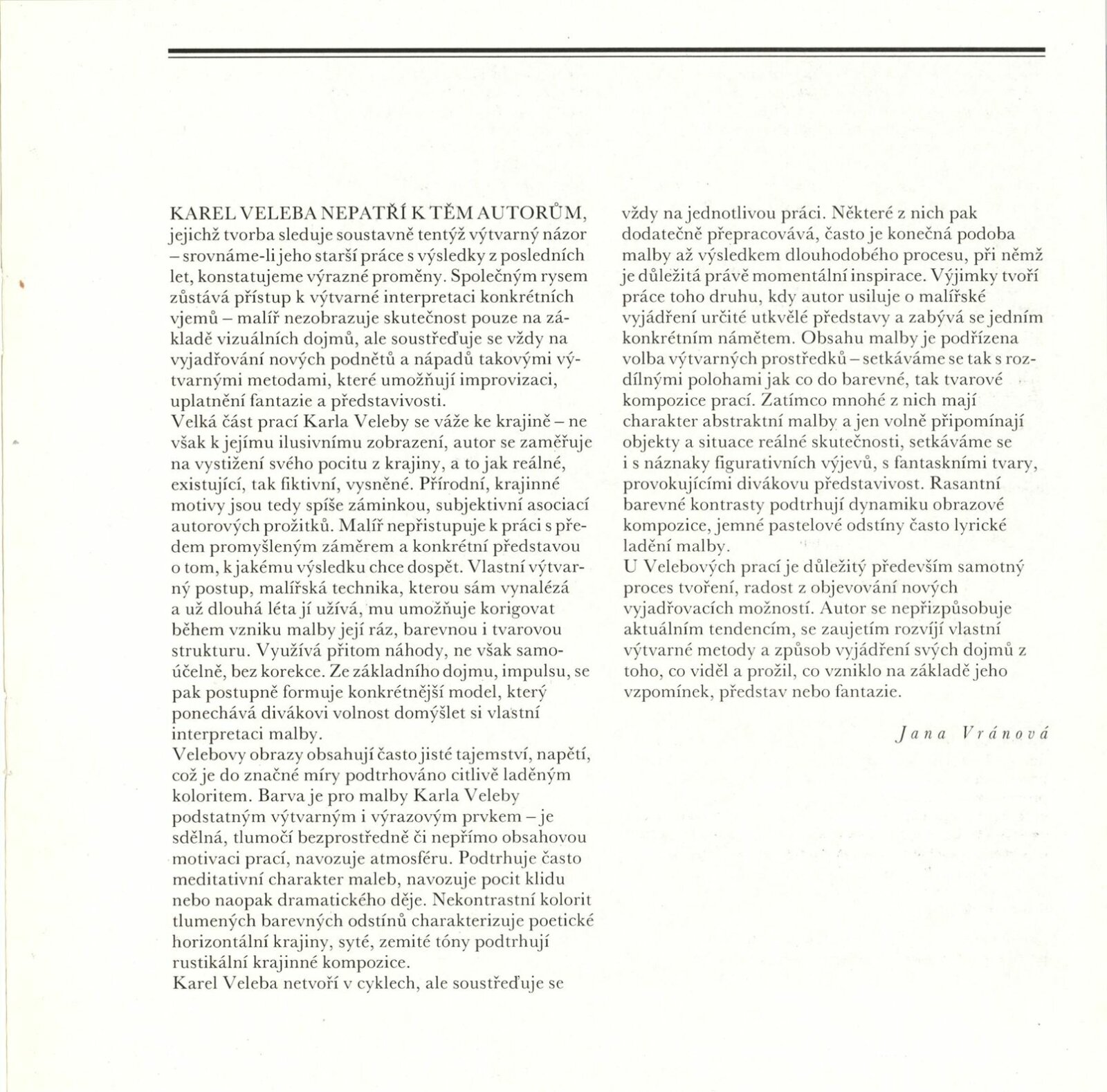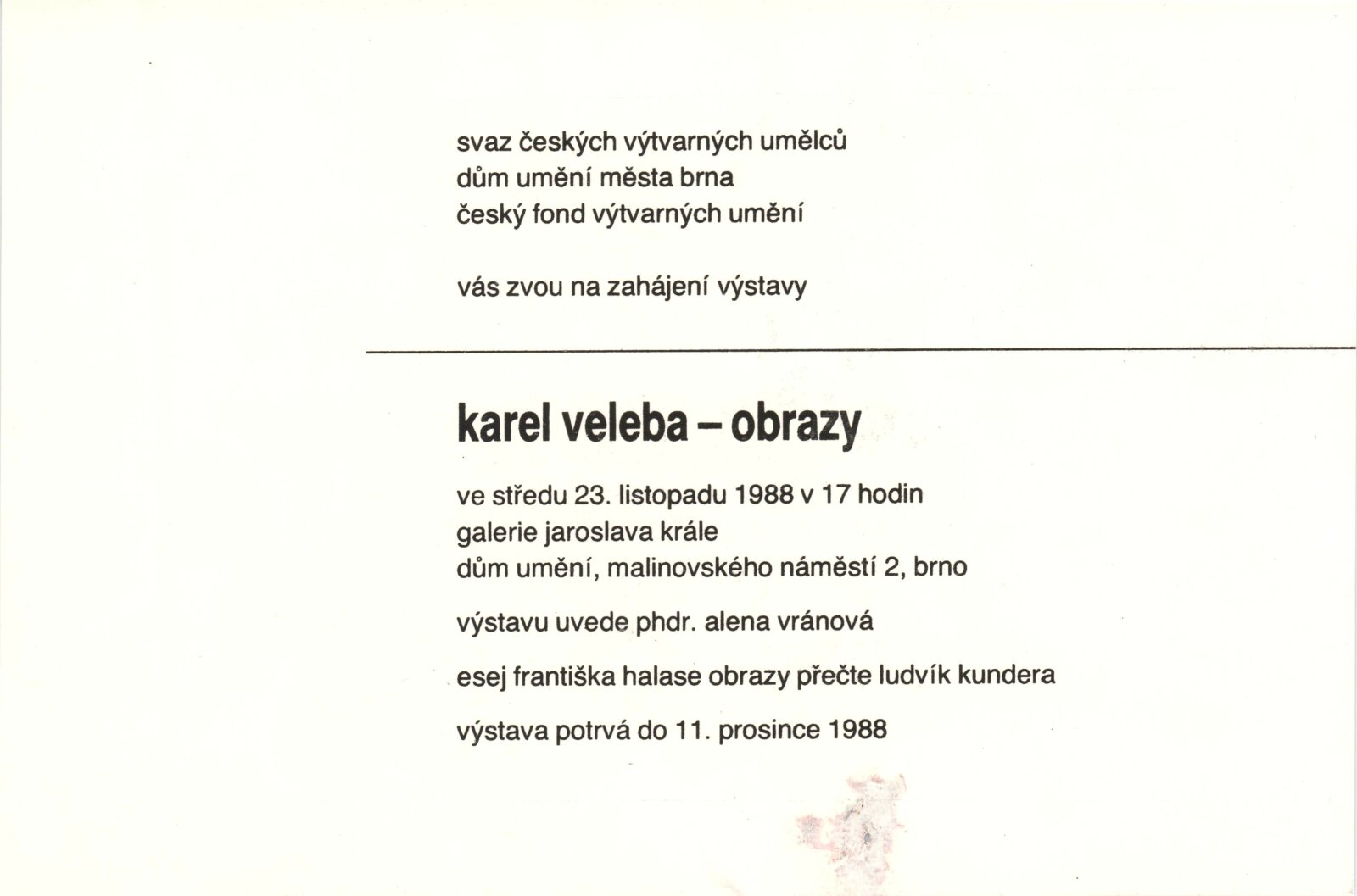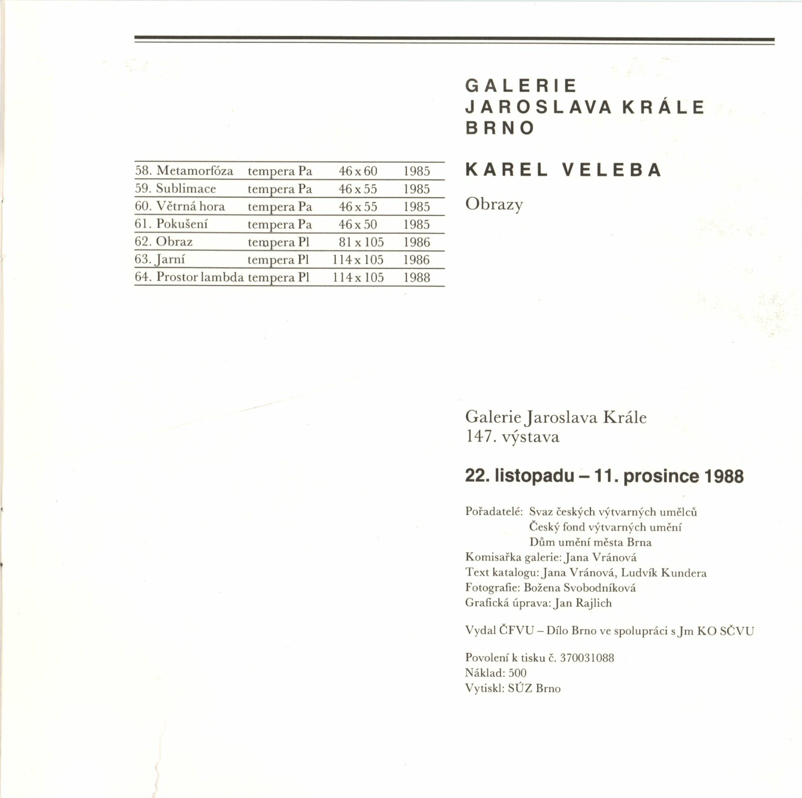 Karel Veleba. Obrazy: Dům umění, 147. výstava v Galerii Jaroslava Krále, 22. 11. – 11. 12. 1988 / Text: Jana Vránová. – Brno: ČFVU-Dílo, 1988. – [12] s., obr., DU 858. – MZK; MG; MMB