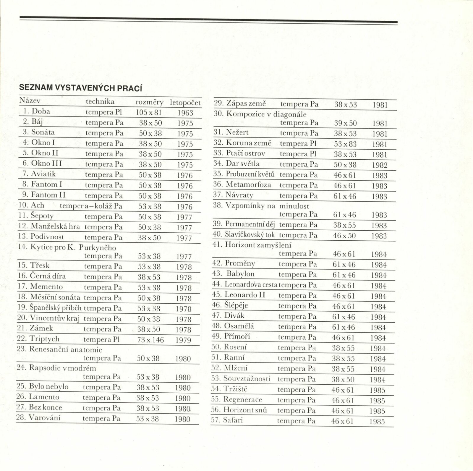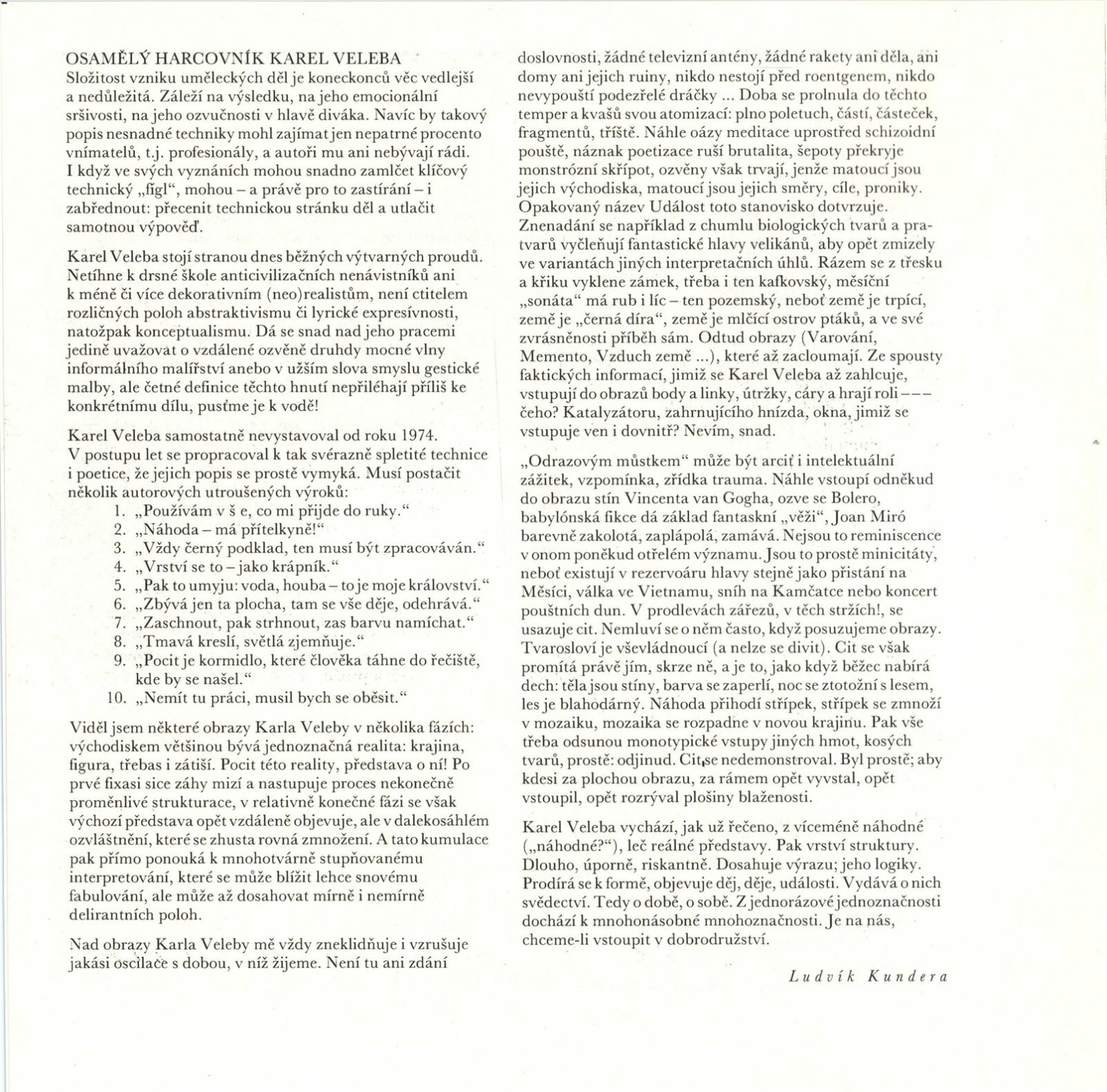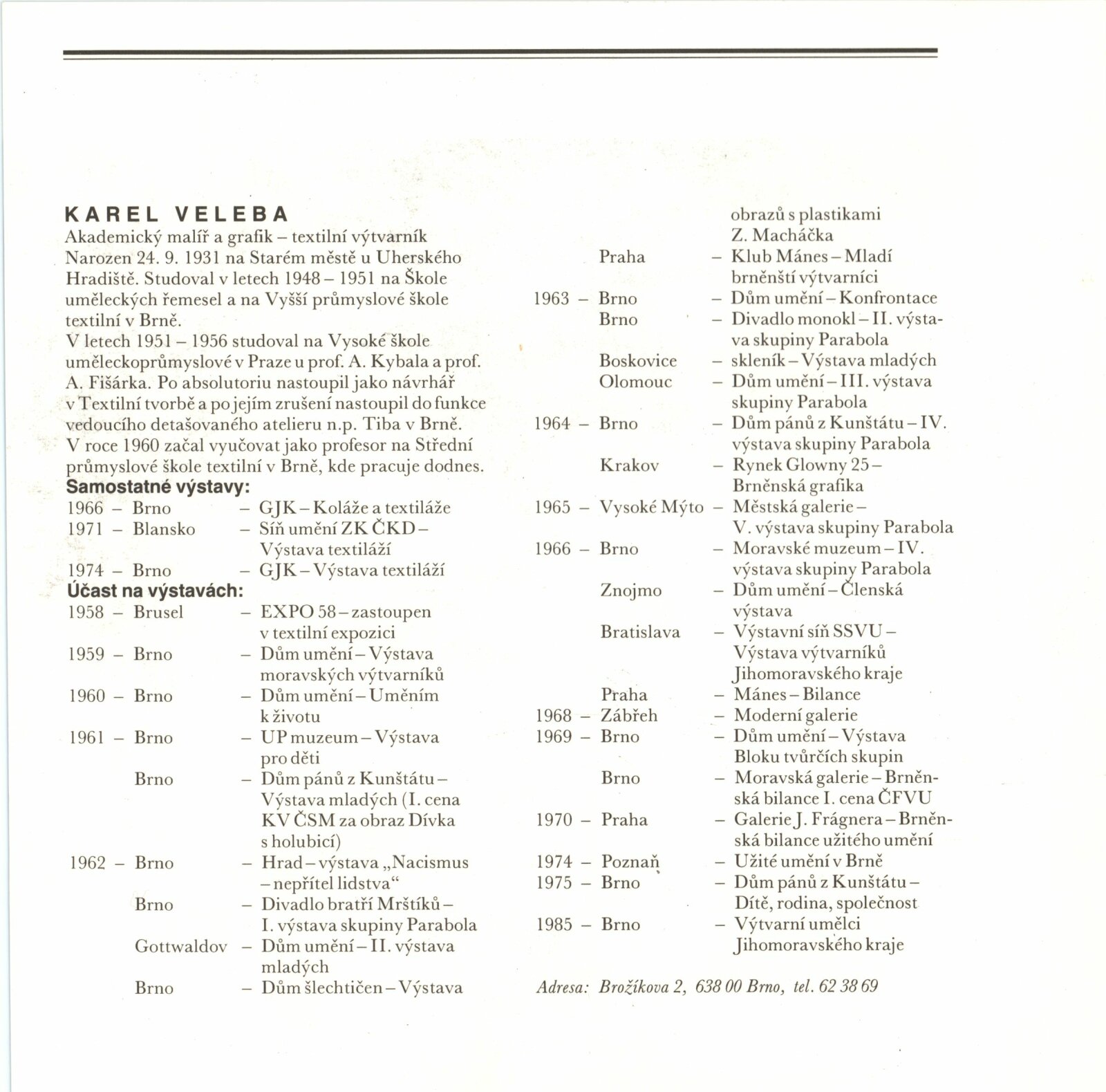 Karel Veleba. Obrazy: Dům umění, 147. výstava v Galerii Jaroslava Krále, 22. 11. – 11. 12. 1988 / Text: Jana Vránová. – Brno: ČFVU-Dílo, 1988. – [12] s., obr., DU 858. – MZK; MG; MMB