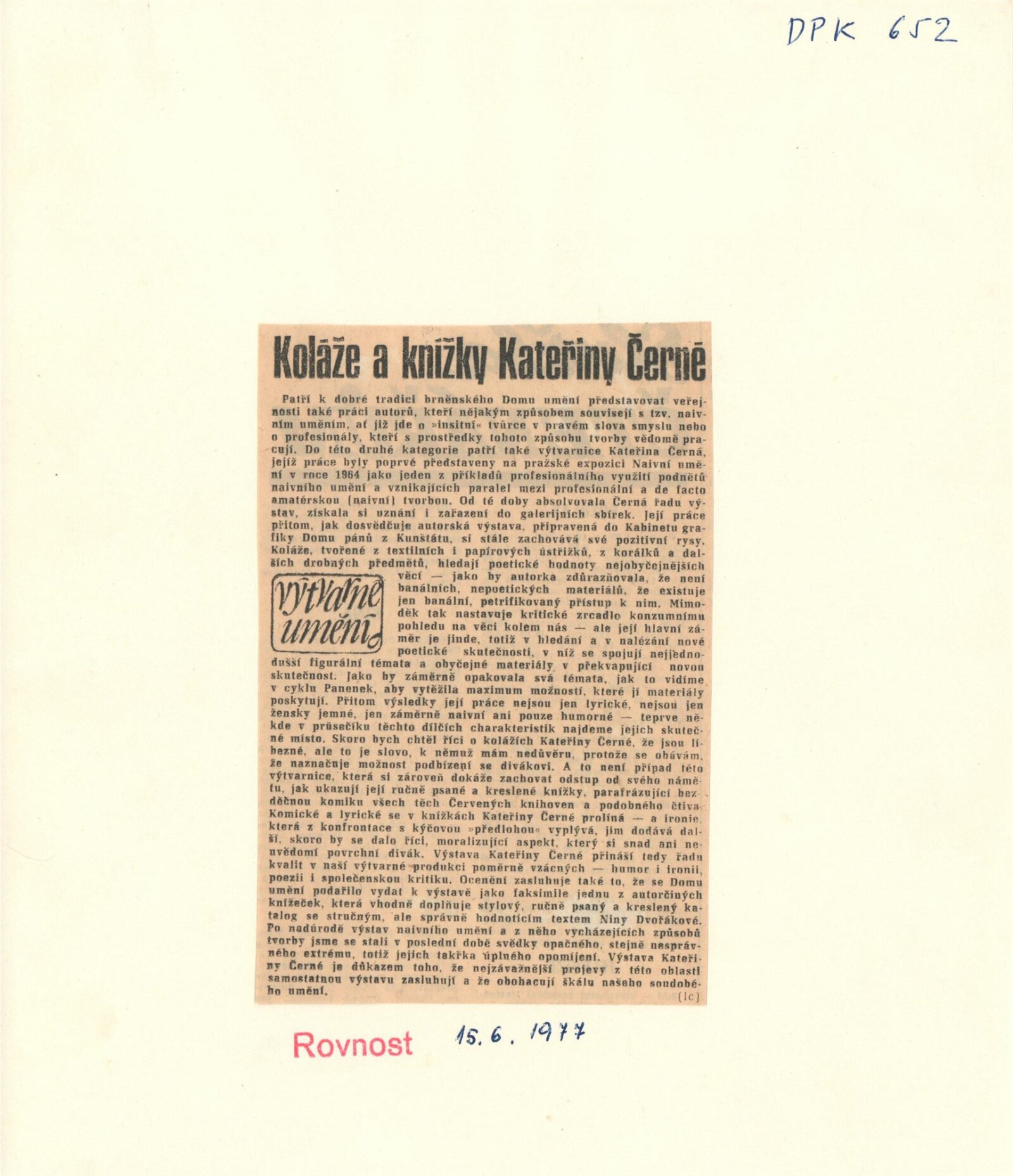 pozvánky, katalogy, katalog výstavy Kateřiny Černé v Mánesu 1976, seznam děl, fotografie výstavy + negativy, úvodní slovo, podklady pro katalog, korespondence – rukopisy Kateřiny Černé, provozní korespondence, smlouva – NG , reverz, žádost o povolení výstavy, recenze v tisku