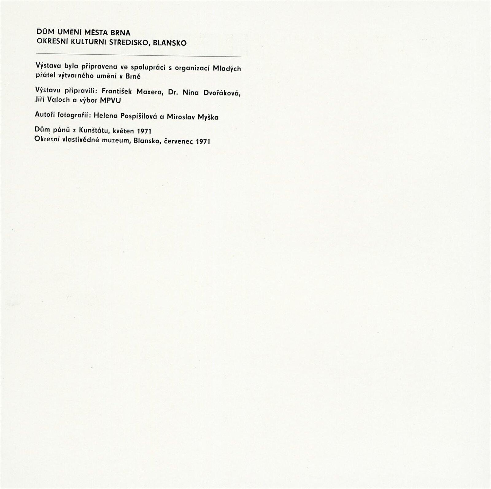 pozvánka, katalog, seznam vystavených děl, fotografie z instalace, korespondence členů MPVU (návrh koncepce – František Maxera, Dušan Klimeš, Jiří Valoch a DU), provozní korespondence, anotace výstavy, žádost o povolení výstavy, recenze v tisku