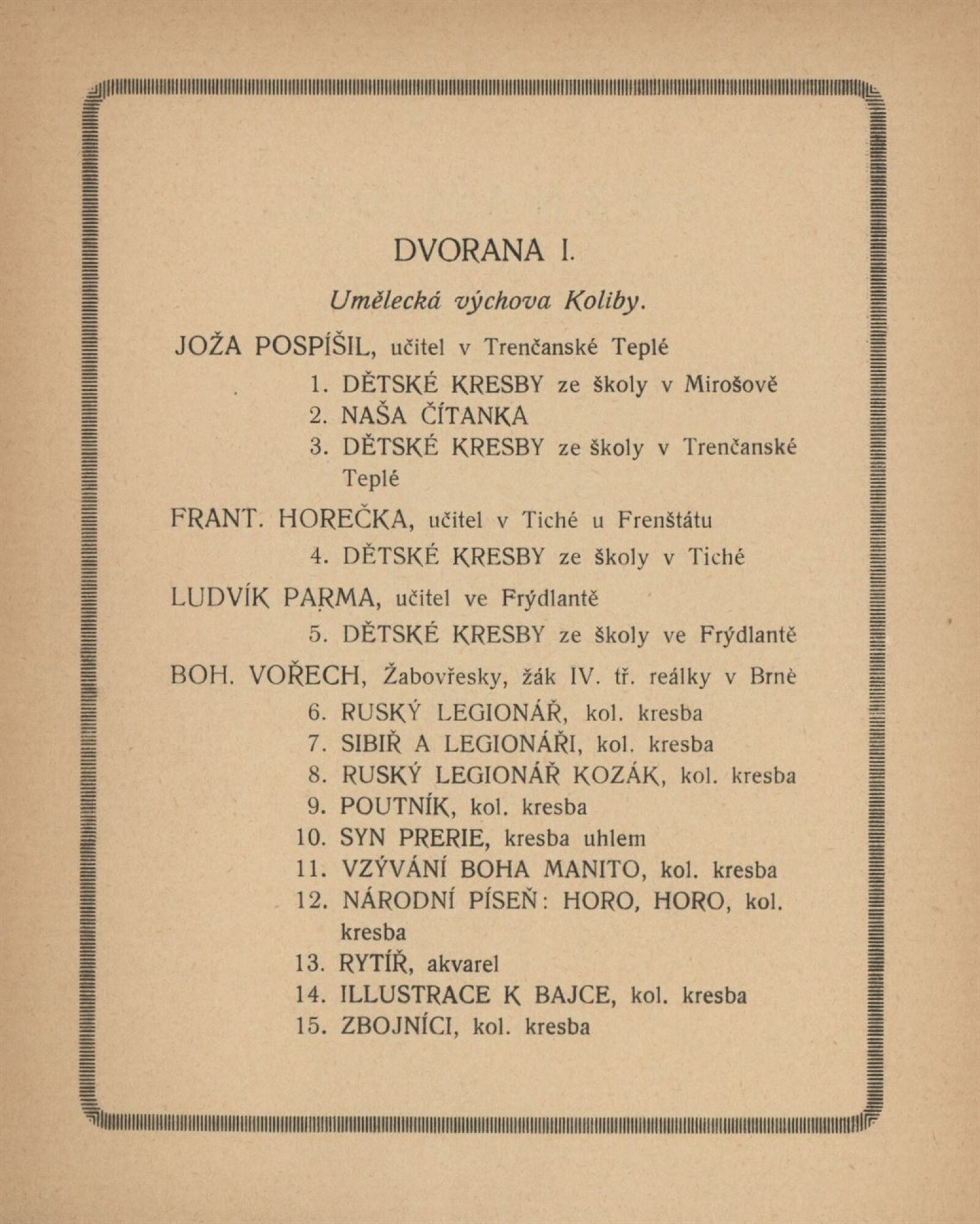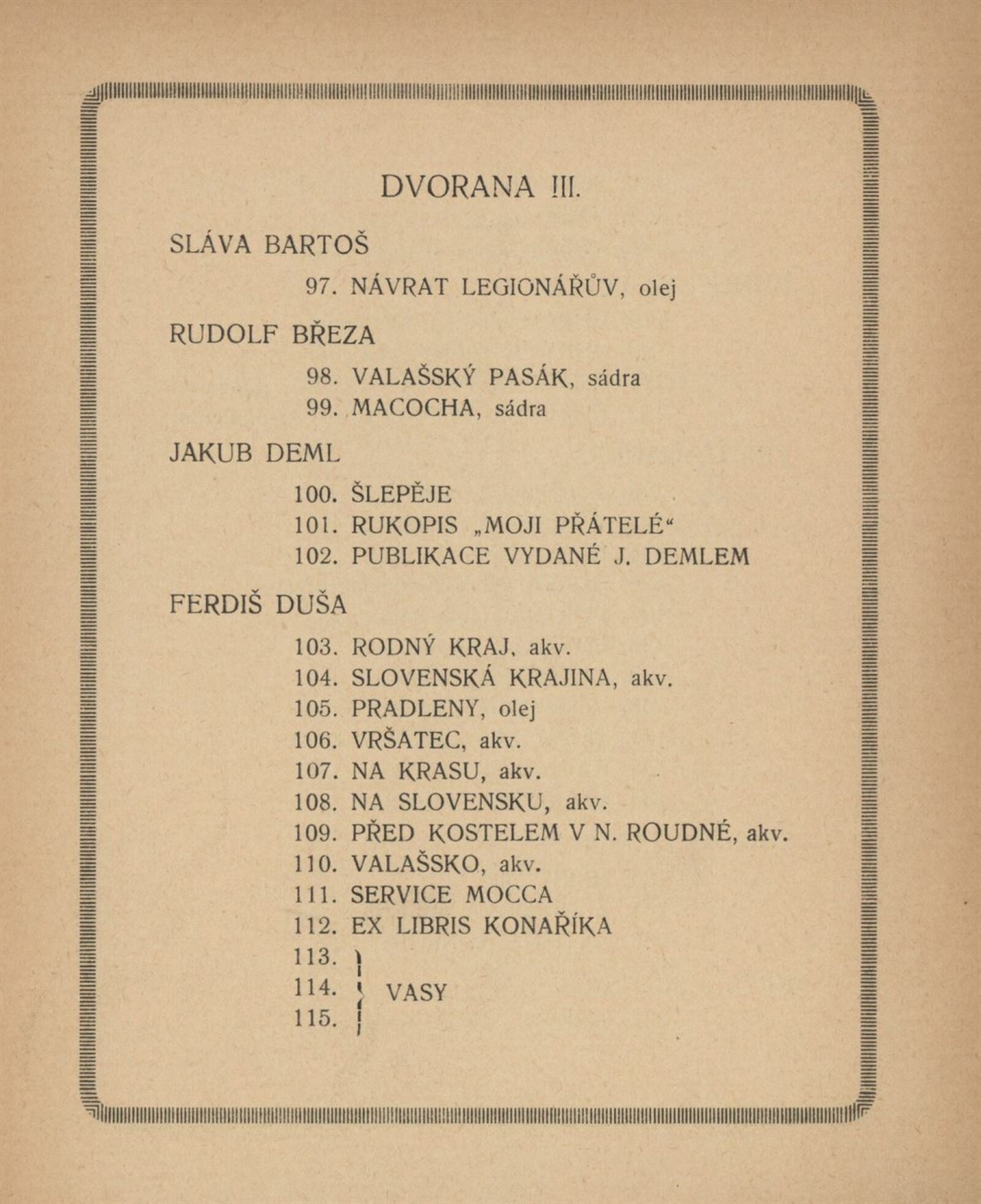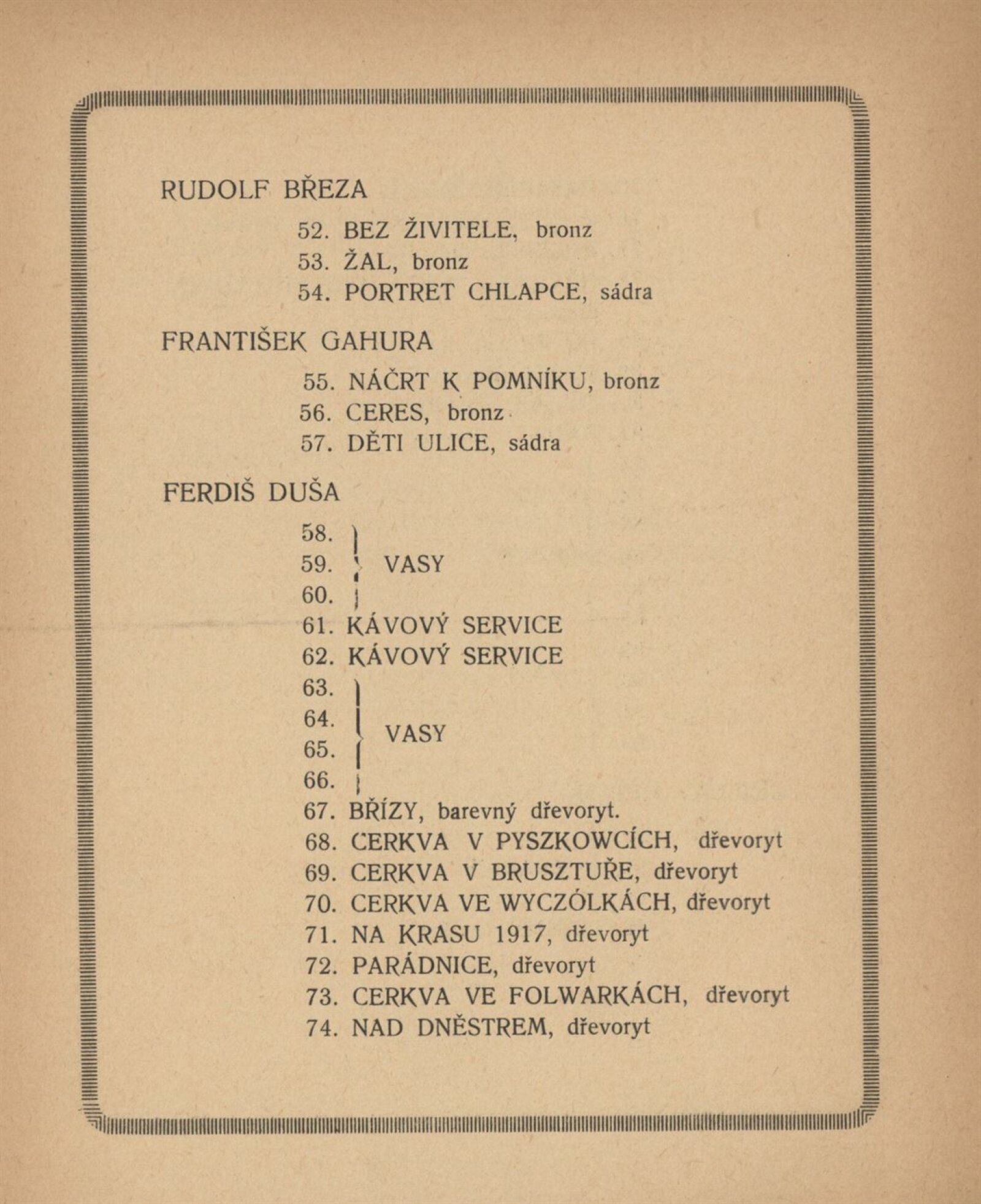 2. výstava Koliby v Brně 1920: Künstlerhaus, březen–duben / Brno: Koliba, 1920. – 18 s., 4, 1. pův. dřevorytu F. Dusi + Ceník 1 l. Adresář vystavujících umělců. – MZK; MZA; SVKOL