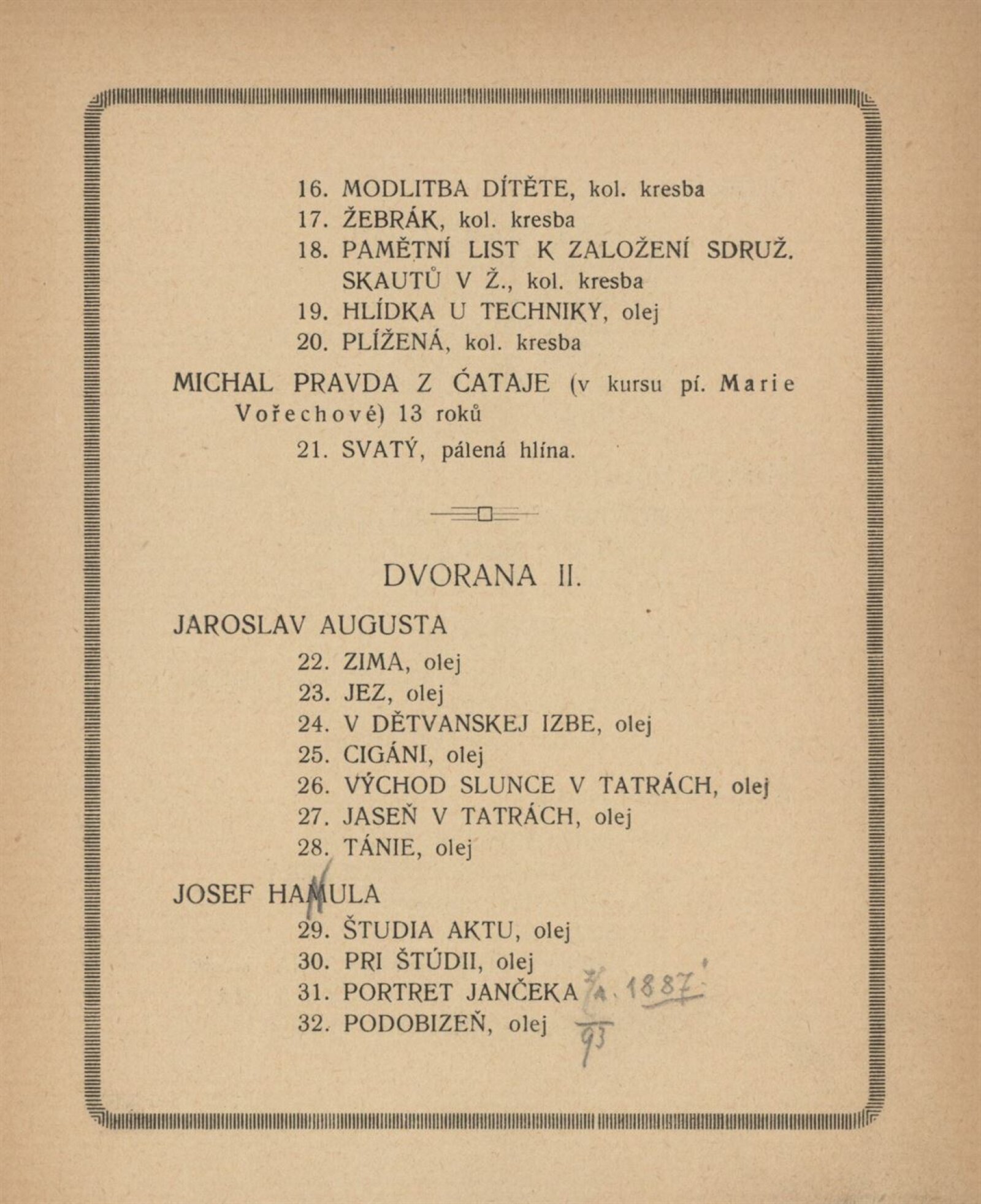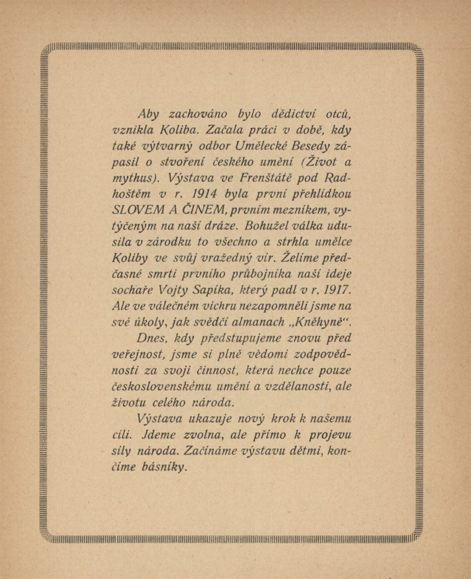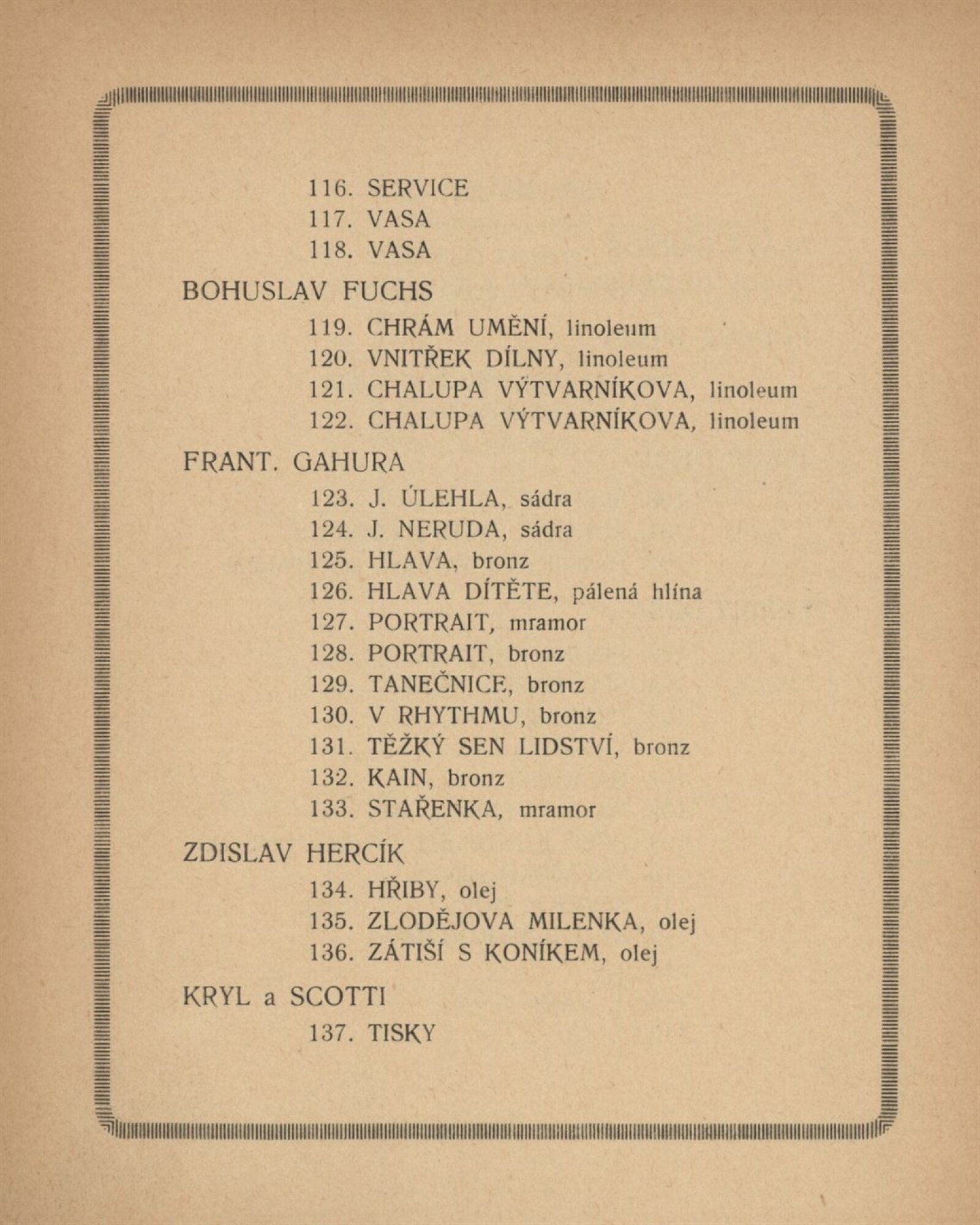2. výstava Koliby v Brně 1920: Künstlerhaus, březen–duben / Brno: Koliba, 1920. – 18 s., 4, 1. pův. dřevorytu F. Dusi + Ceník 1 l. Adresář vystavujících umělců. – MZK; MZA; SVKOL