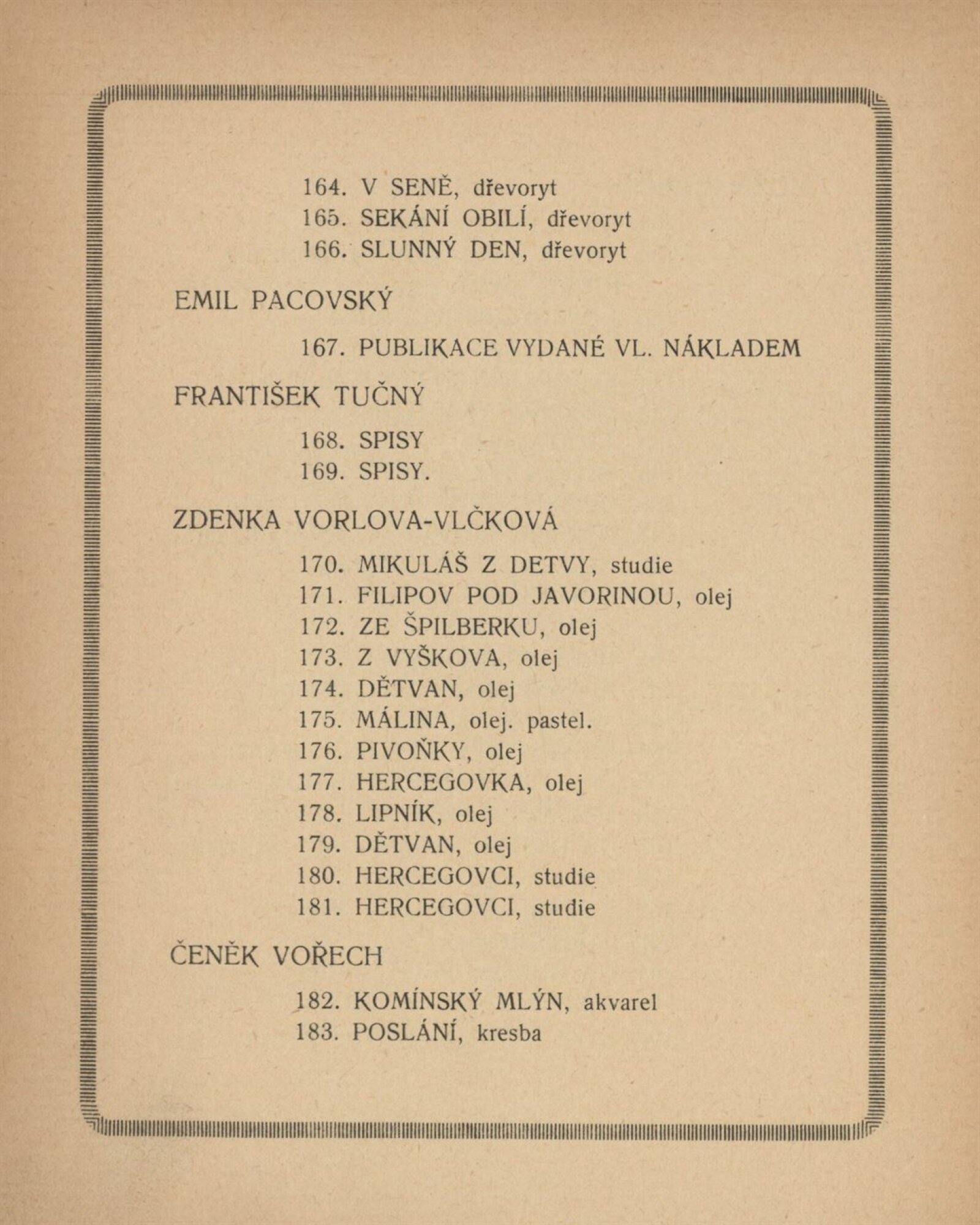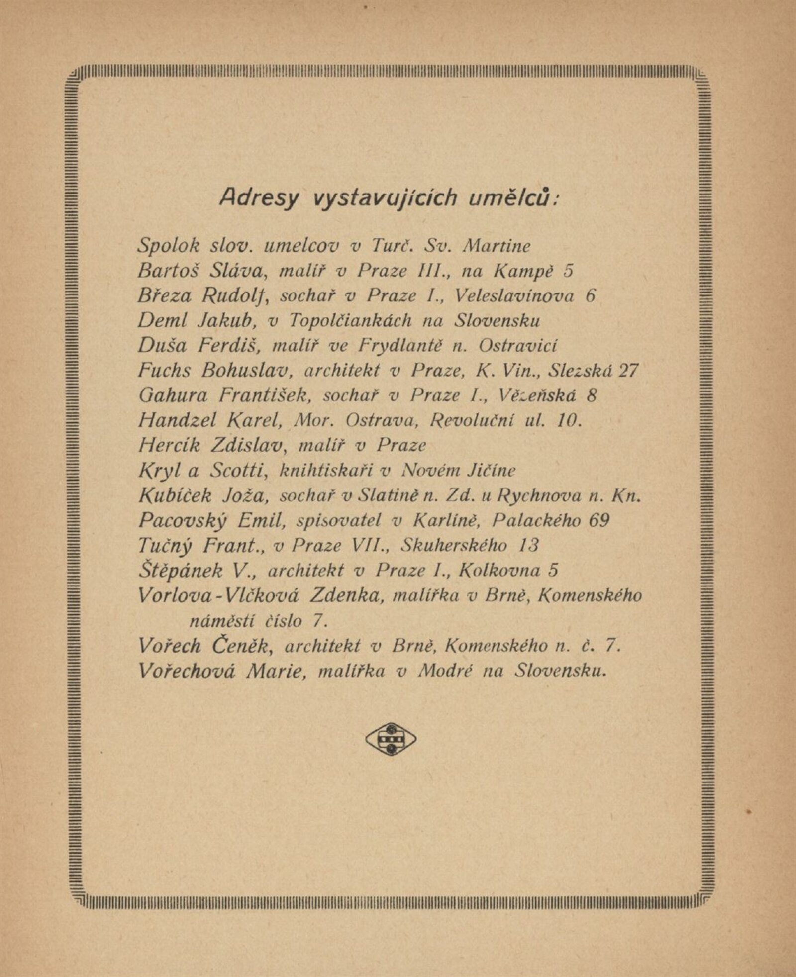 Jaroslav Augusta, Sláva Bartoš, Rudolf Březa, Jakub Deml, Ferdiš Duša, Bohuslav Fuchs, František Gahura, Karel Handzel, Josef Hanula, Zdislav Hercík, František Horečka, Peter Jul. Kern, Kryl a Scotti, Joža Kubíček, Gustav Mallý, Emil Pacovský, Ludvík Parma, Joža Pospíšil, Michal Pravda z Čataje, V. Štěpánek, František Tučný, Zdenka Vorlová-Vlčková, Boh. Vořech, Čeněk Vořech, Marie Vořechová