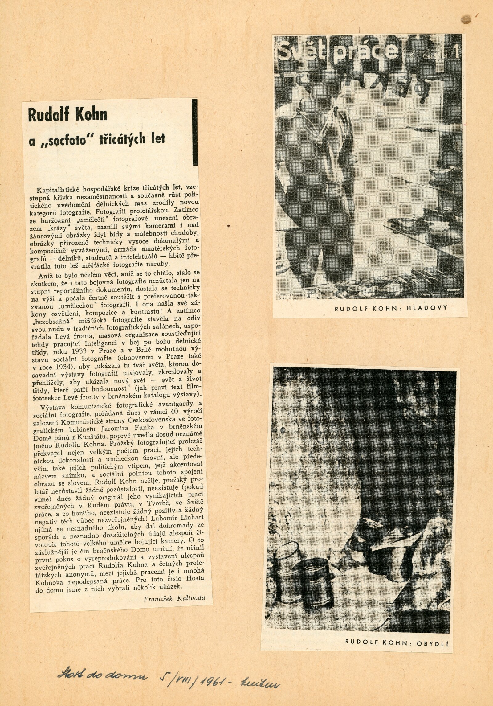 pozvánka, katalog, plakát, strojopisy textů (Rudolf Kohn a "socfoto" třicátých let, František Kalivoda – Předchůdci sociální fotografie), zápis z porady o výstavě, seznam vystavených prací, fotografie děl pro katalog, korespondence (o přípravě výstavy, Adolf Kroupa, František Kalivoda, Jiří Jeníček, AJG, SNG, provozní korespondence), žádosti o zapůjčení fotografií, potvrzení o převzetí putovní výstavy AJG, recenze v tisku, strojopis úvodního slova vernisáže výstavy František Povolný