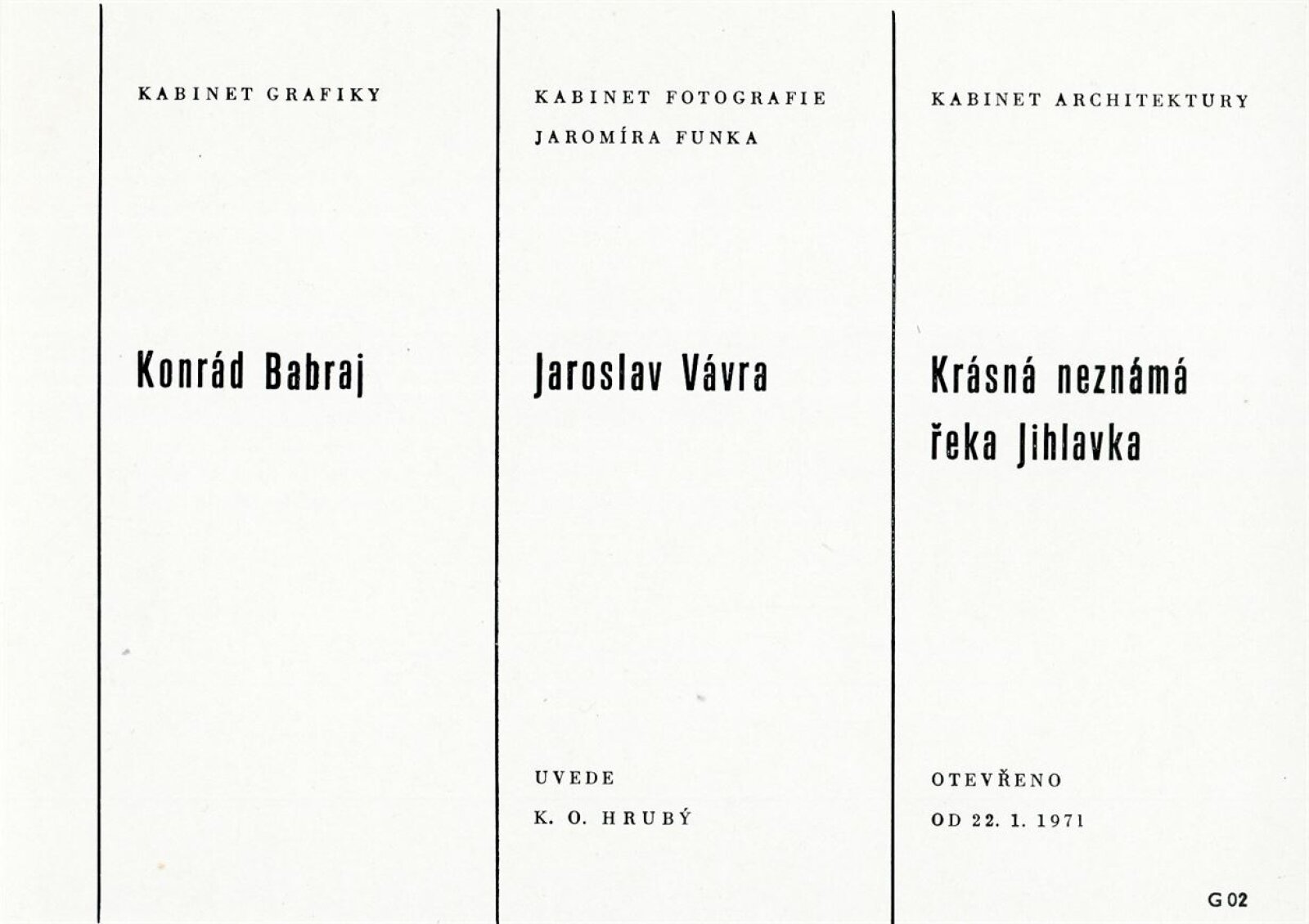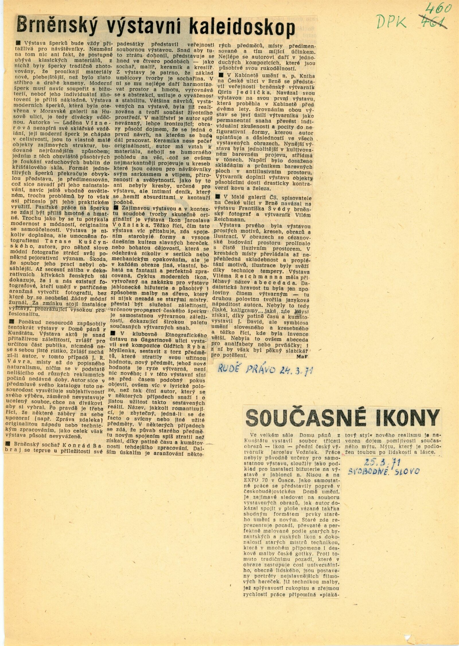 pozvánka, spol. pozvánka DPK 458–460, katalog, fotografie z vernisáže a výstavy, strojopis textu pro katalog s překladem (NJ), smlouva výstavy, recenze v tisku
