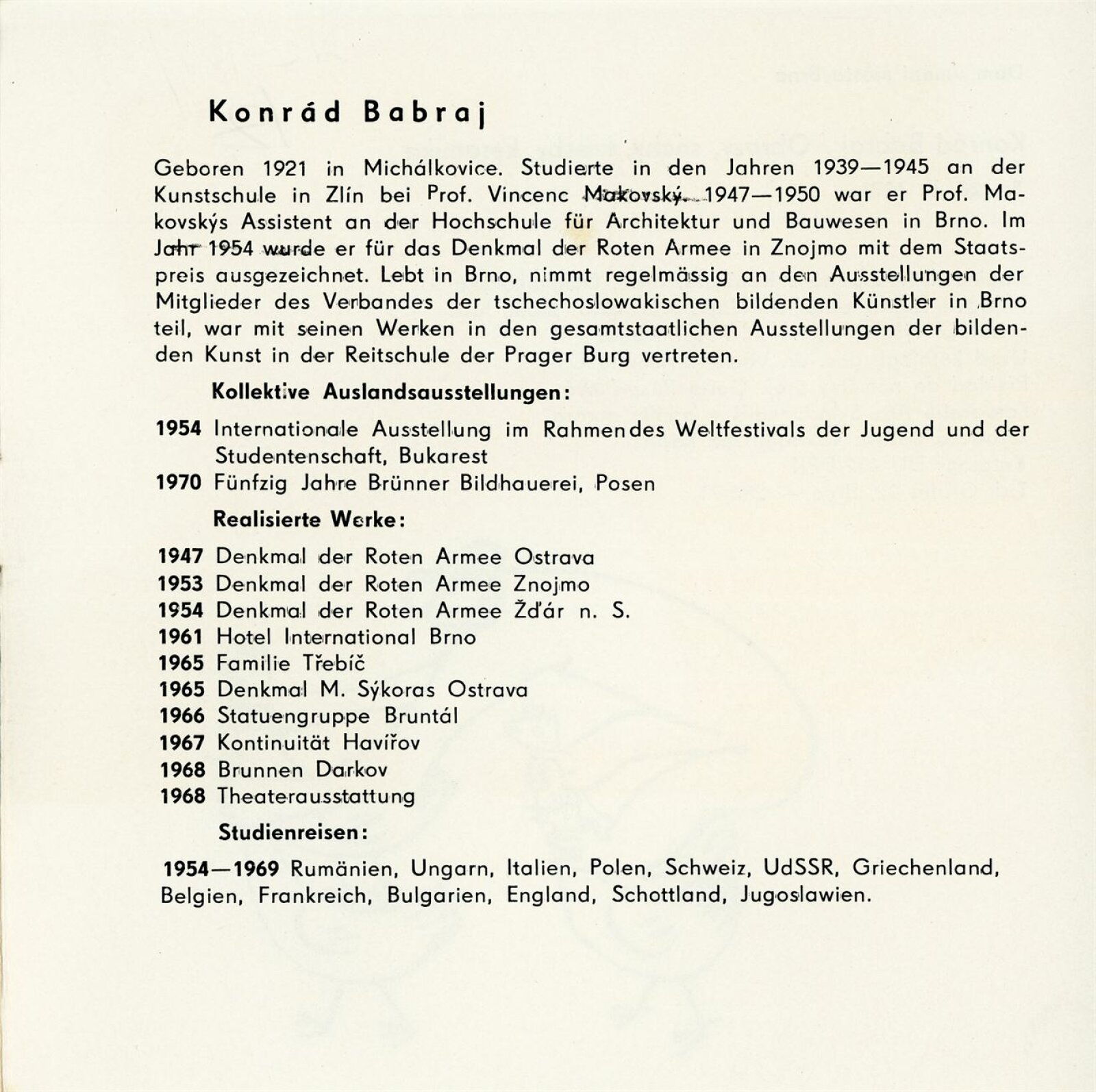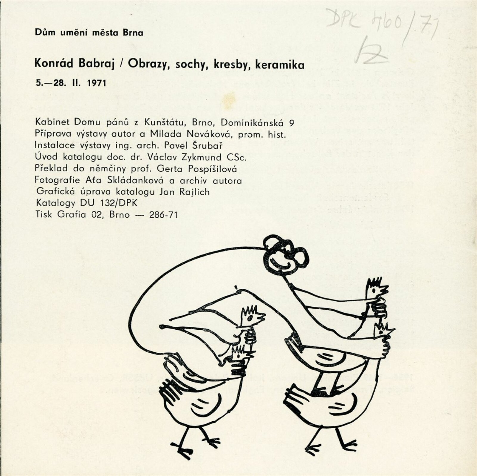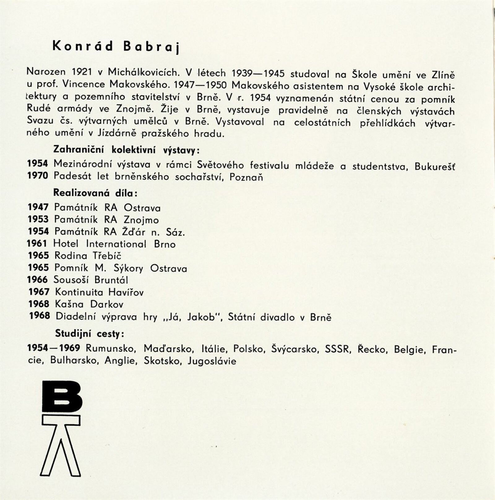 Konrád Babraj. Obrazy, sochy, kresby, keramika: Dům umění města Brna / Dům pánů z Kunštátu, Kabinet grafiky, 5. 2. – 28. 2. 1971 / Text: Václav Zykmund. – Brno: DUmB, 1971. – 10 s., obr., životopis, DPK 460. – MMB