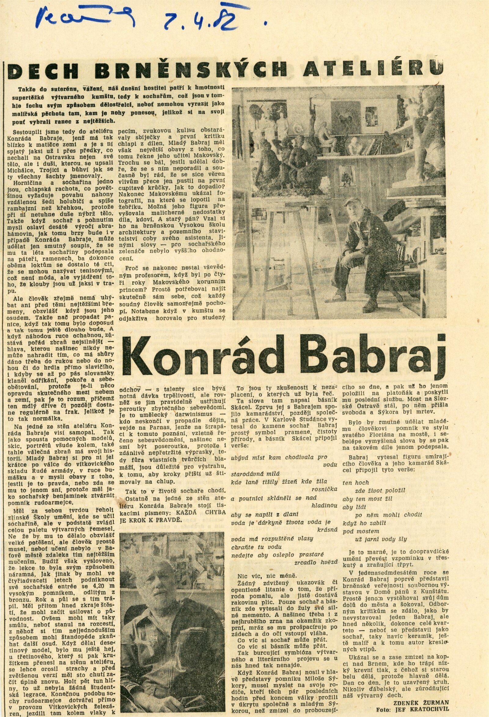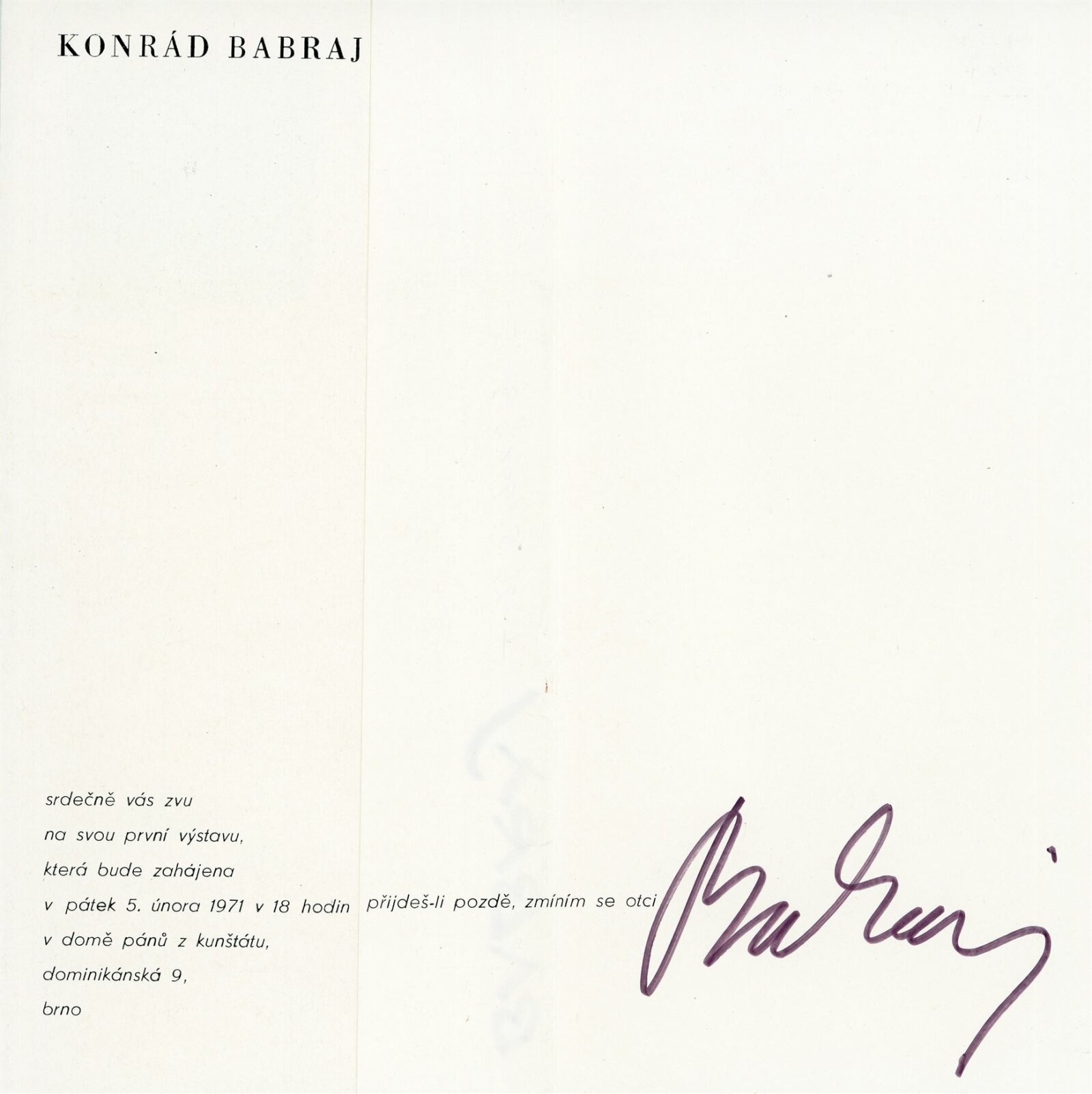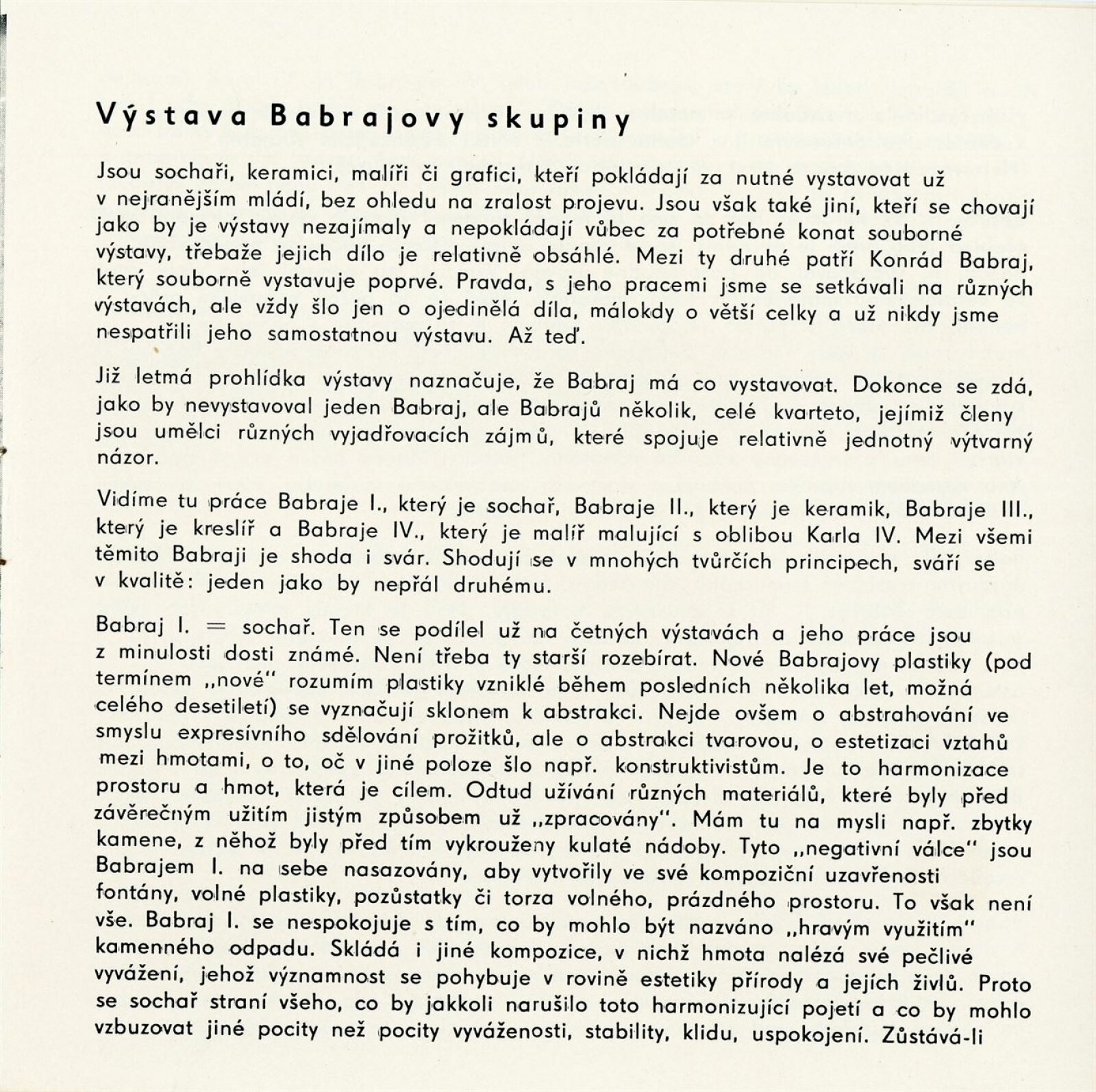 Konrád Babraj. Obrazy, sochy, kresby, keramika: Dům umění města Brna / Dům pánů z Kunštátu, Kabinet grafiky, 5. 2. – 28. 2. 1971 / Text: Václav Zykmund. – Brno: DUmB, 1971. – 10 s., obr., životopis, DPK 460. – MMB