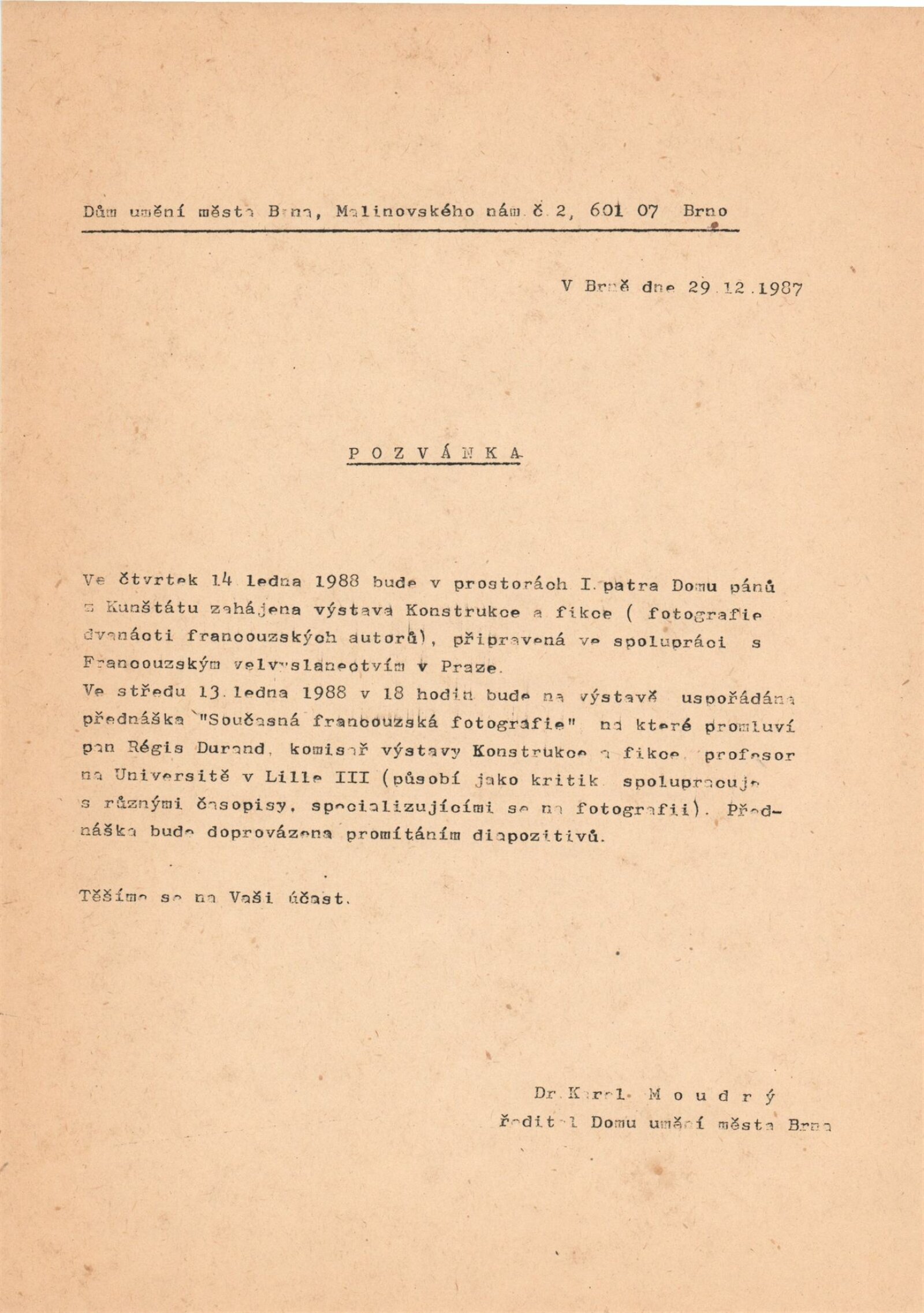 Konstrukce a fikce. Fotografie dvanácti francouzských autorů: Dům umění / Dům pánů z Kunštátu, 14. 1. – 21. 2. 1988 / Text: Régis Durand. – Brno: DUmB, 1988. – [9] s., obr., životní data, výstavy, DPK 905. – MZK; MG