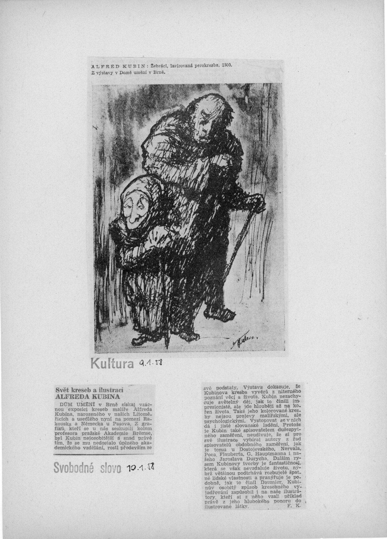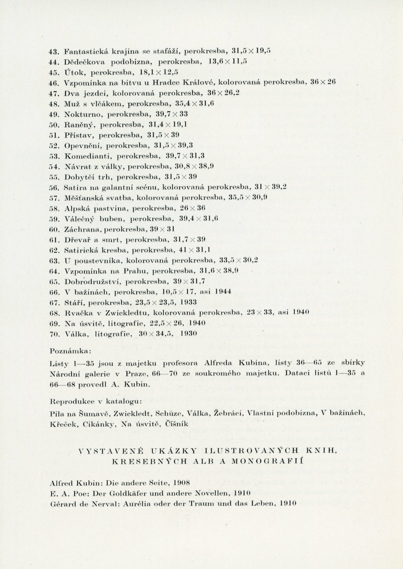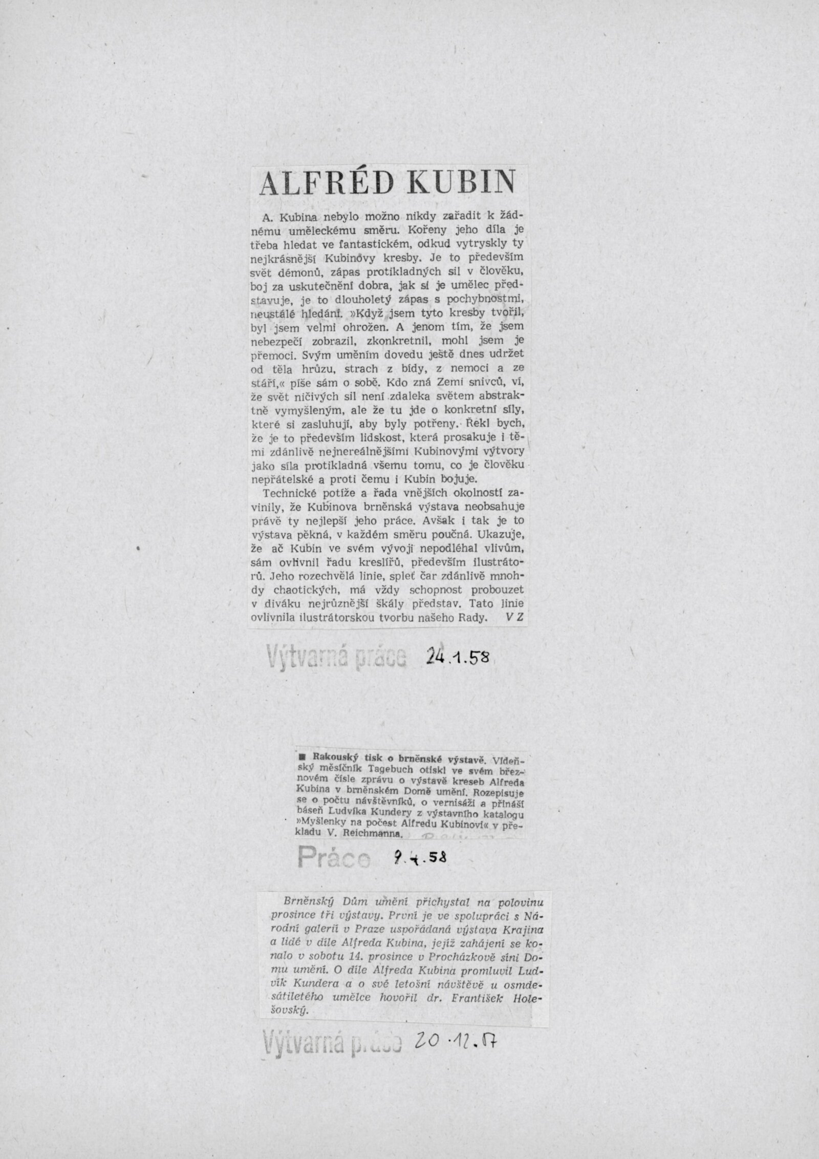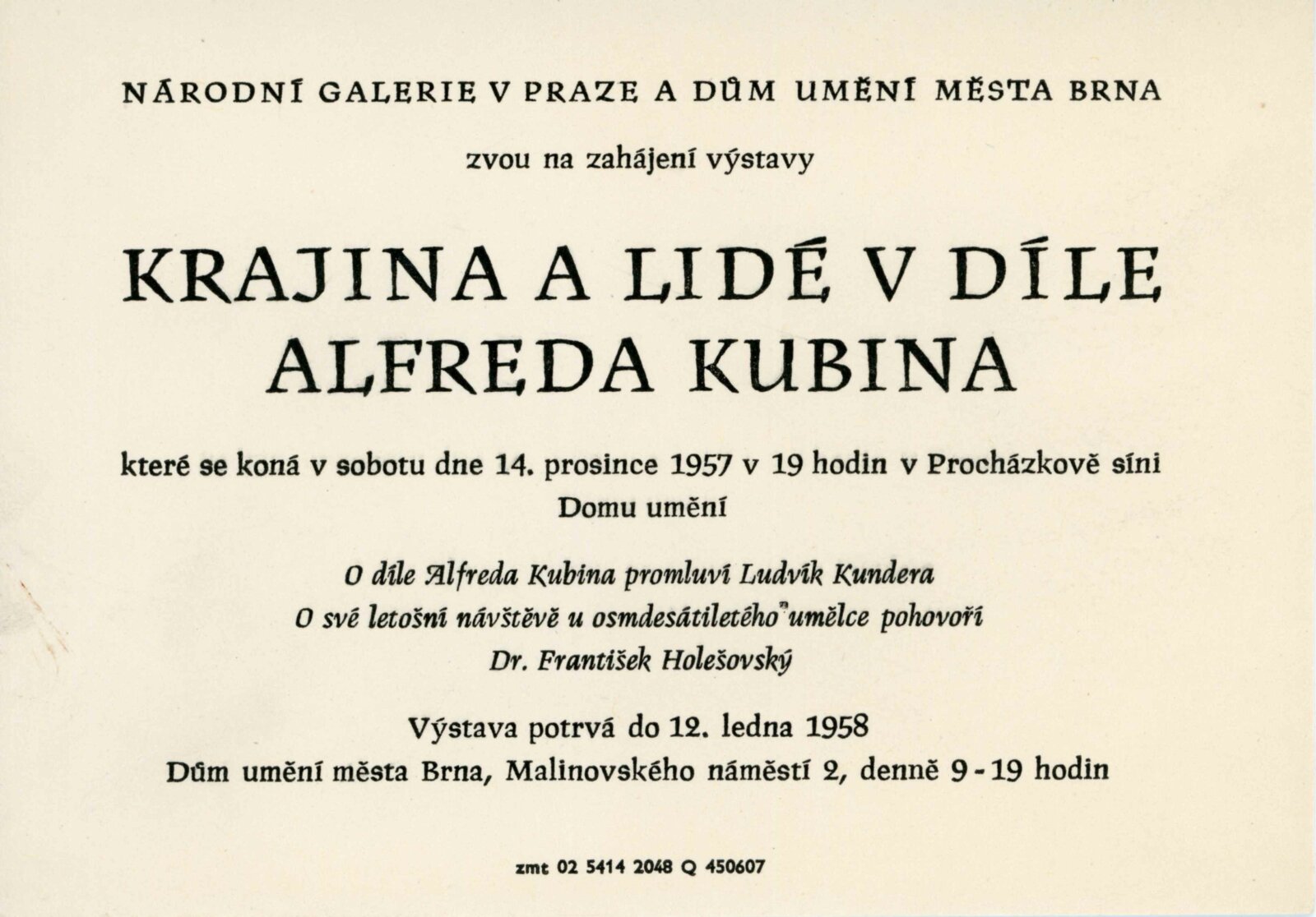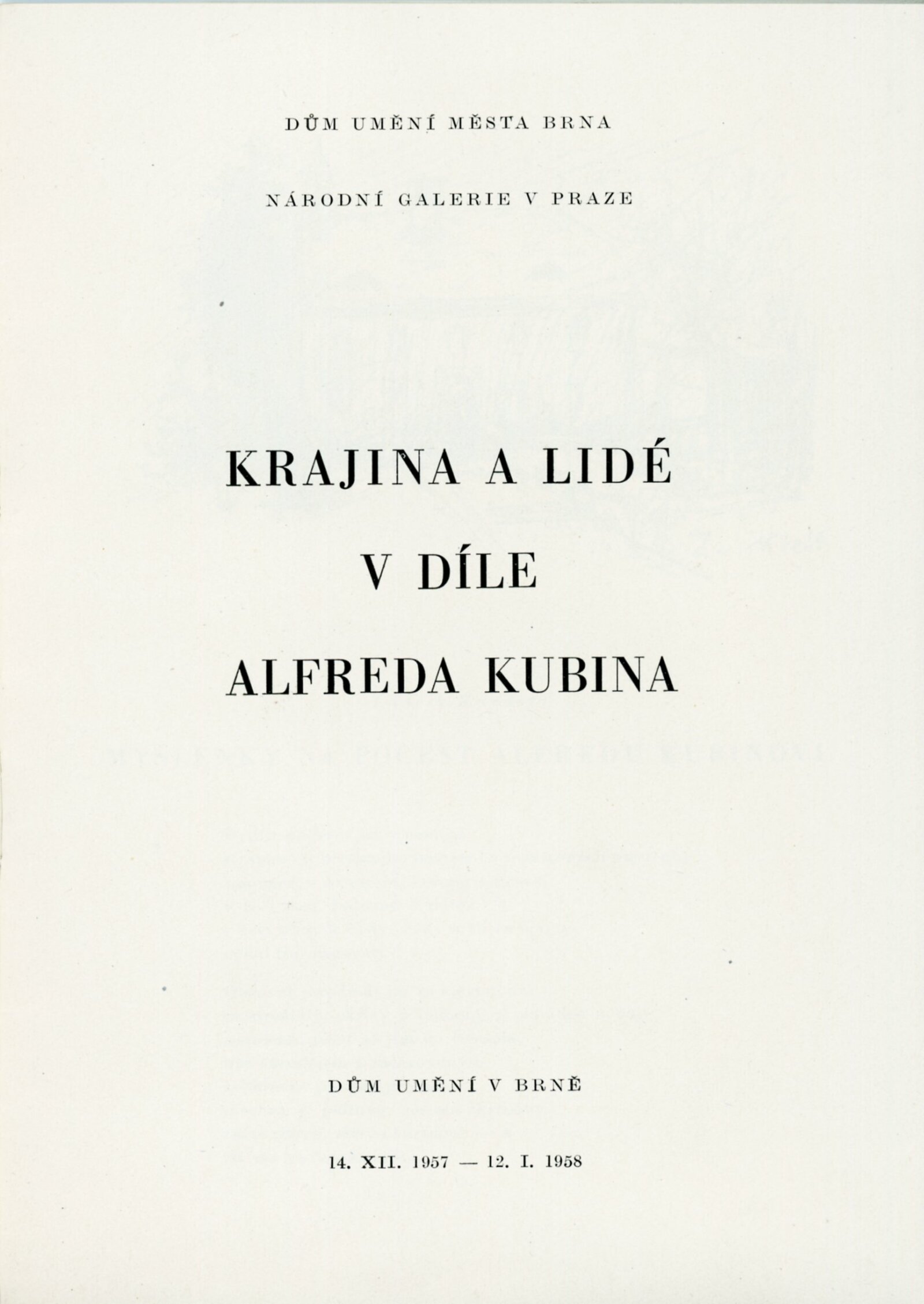 Krajina a lidé v díle Alfreda Kubina: Dům umění v Brně, 14. 12. 1957 – 12. 1. 1958 / Texty: Ludvík Kundera, František Holešovský, Alfred Kubin. – Brno: DUmB, 1957. – 18 s., obr., DU 300. – MZK; MG