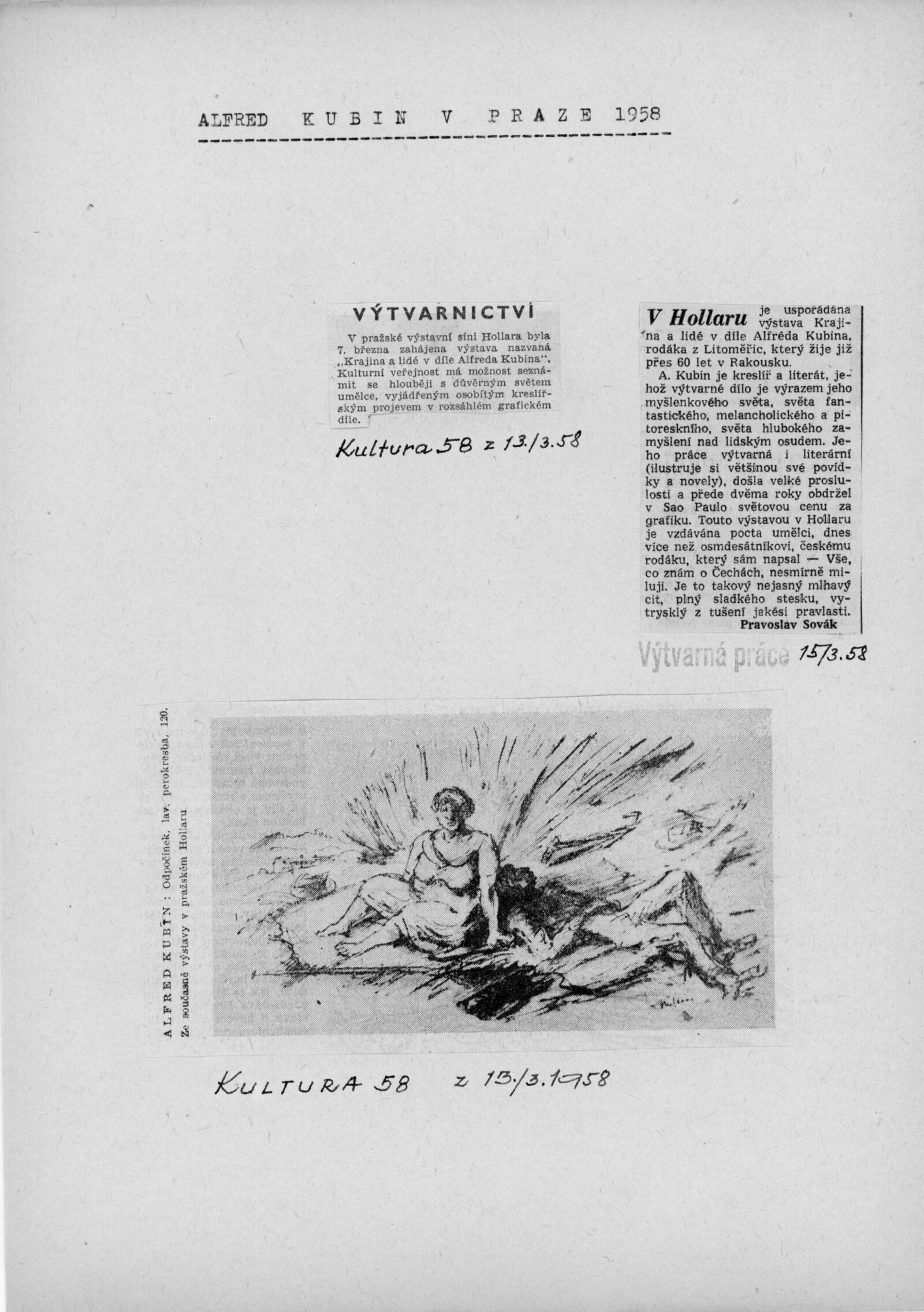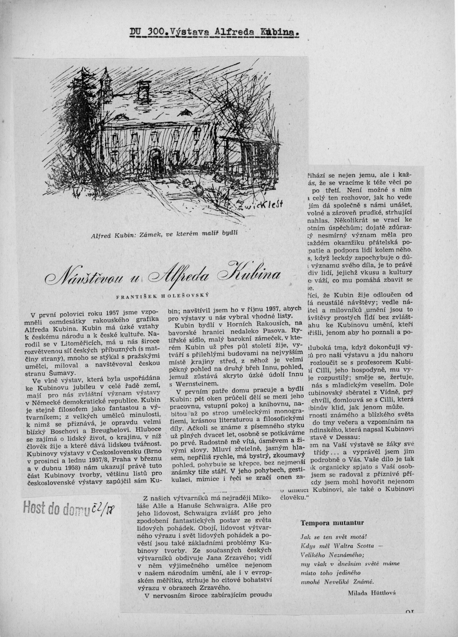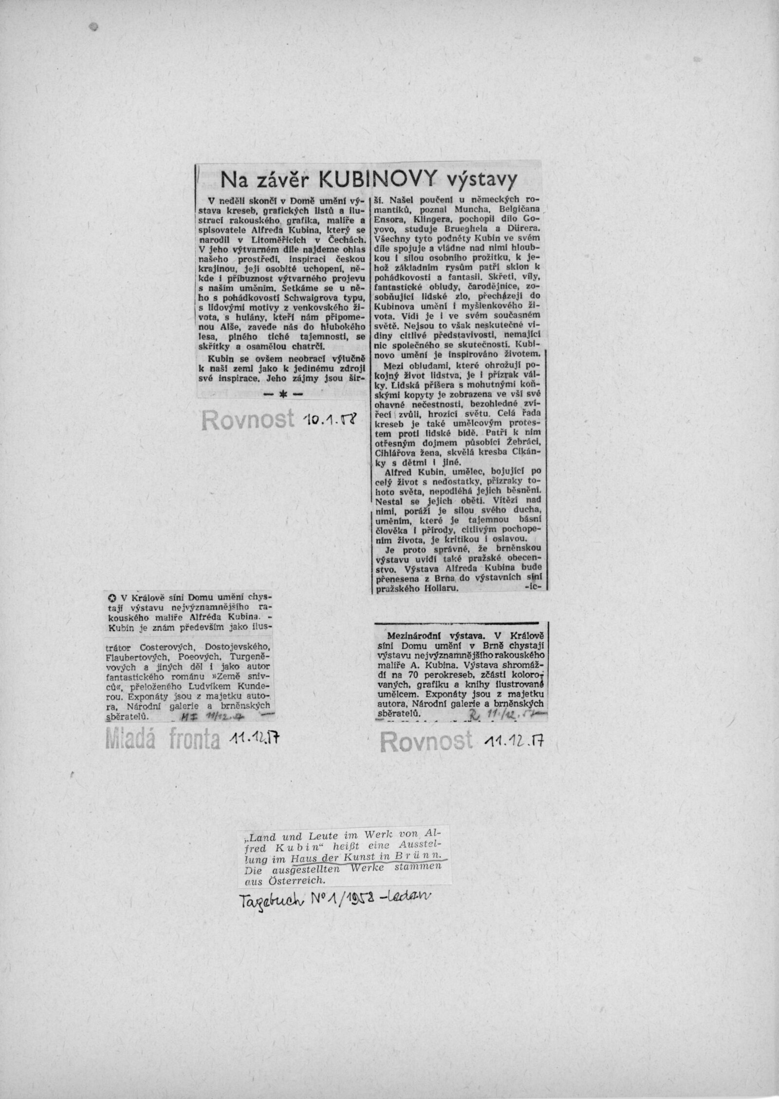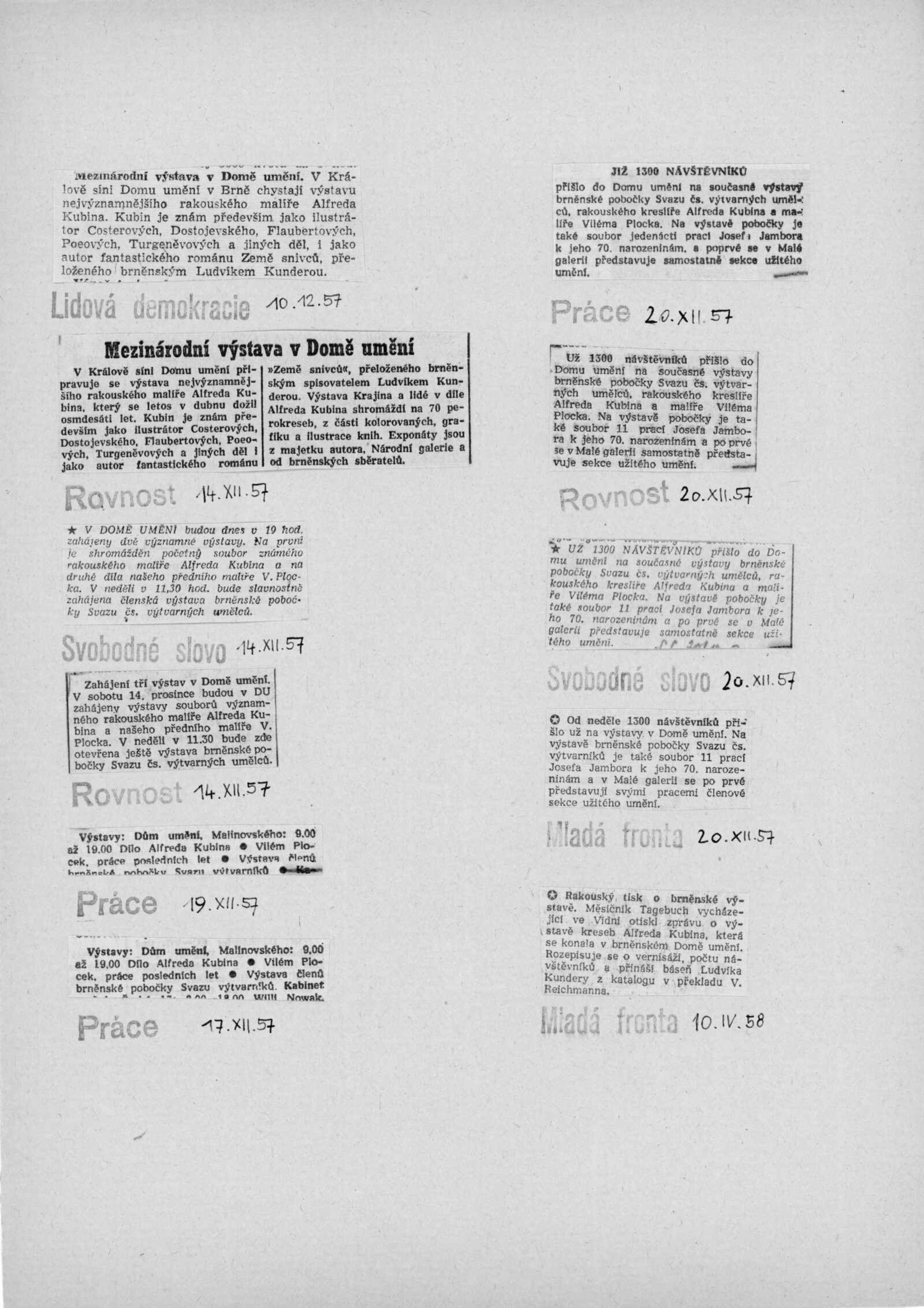 Krajina a lidé v díle Alfreda Kubina: Dům umění v Brně, 14. 12. 1957 – 12. 1. 1958 / Texty: Ludvík Kundera, František Holešovský, Alfred Kubin. – Brno: DUmB, 1957. – 18 s., obr., DU 300. – MZK; MG