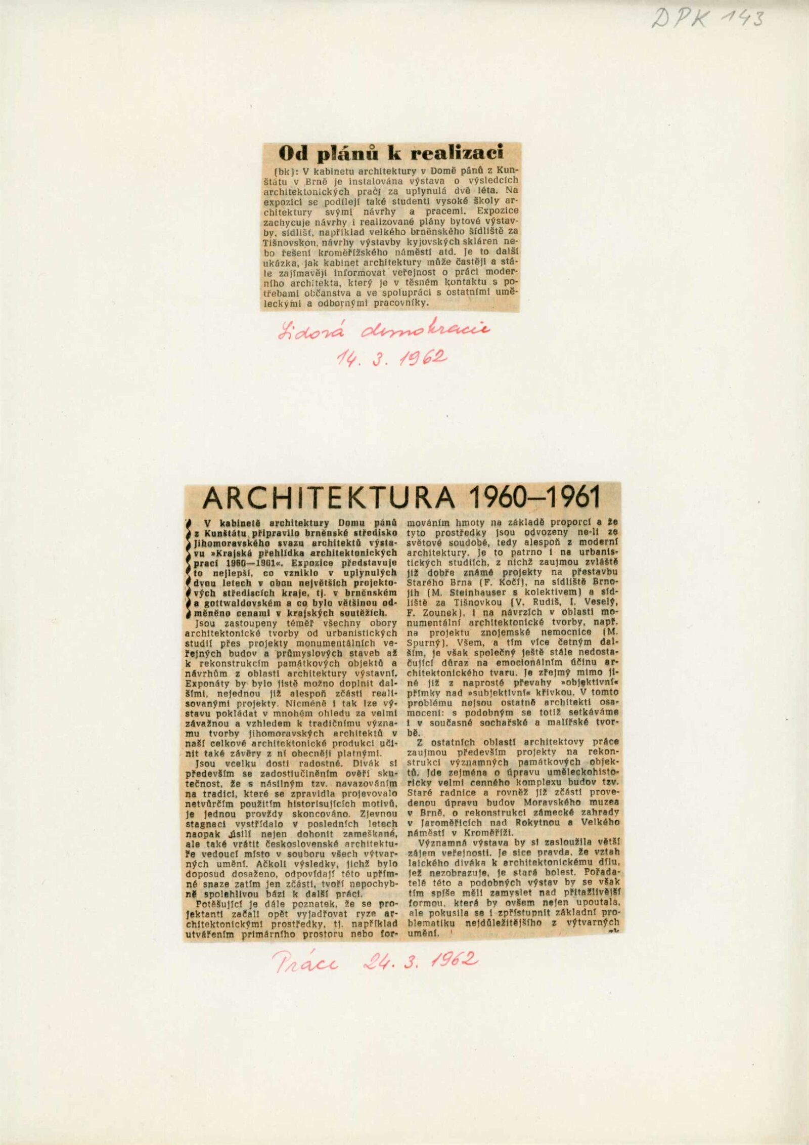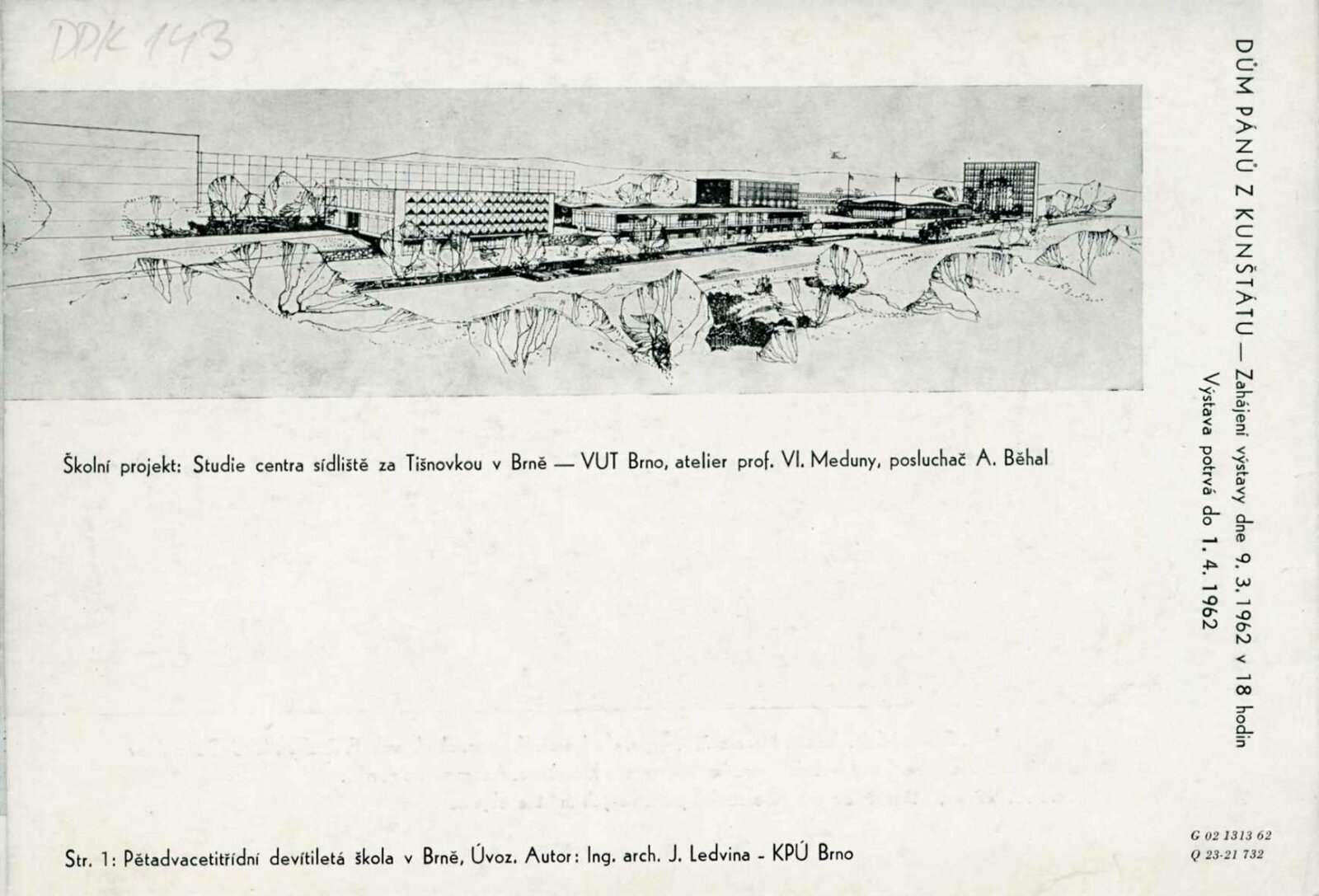 Krajská přehlídka architektonických prací 1960–1961: Dům umění města Brna / Dům pánů z Kunštátu, 22. výstava Kabinetu architektury Svazu architektů ČSSR, 9. 3. – 1. 4. 1962, 4 s., obr., DPK 143