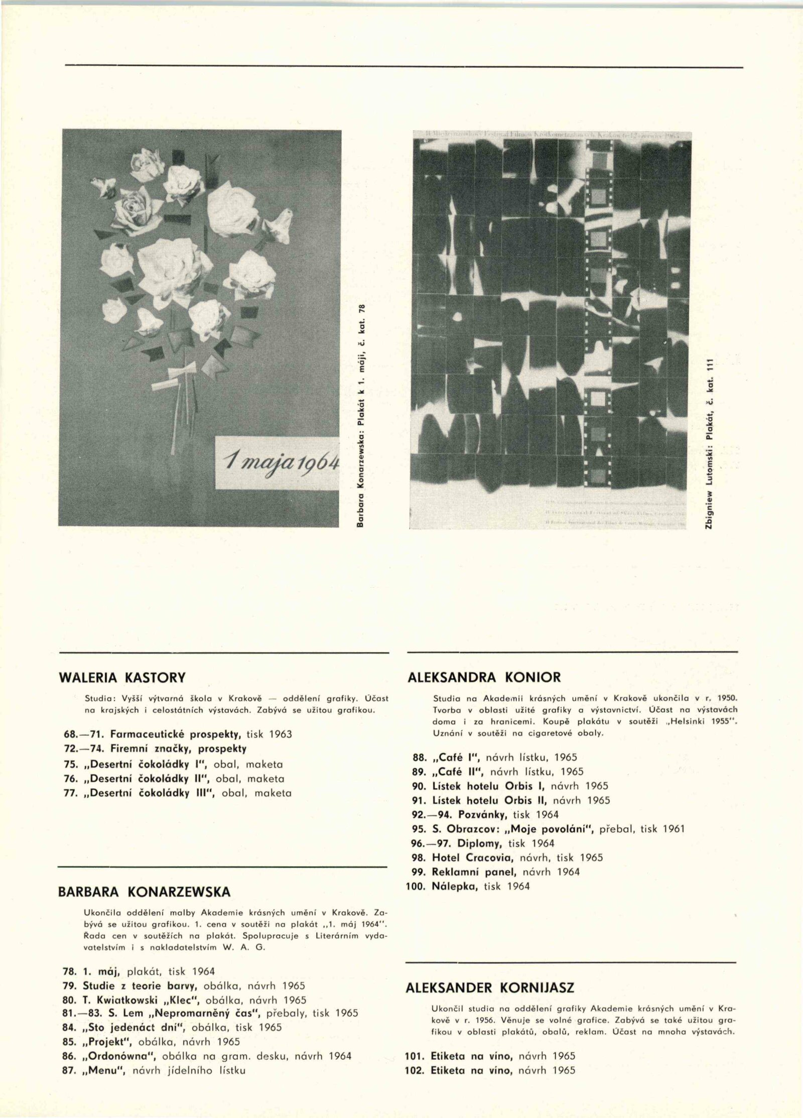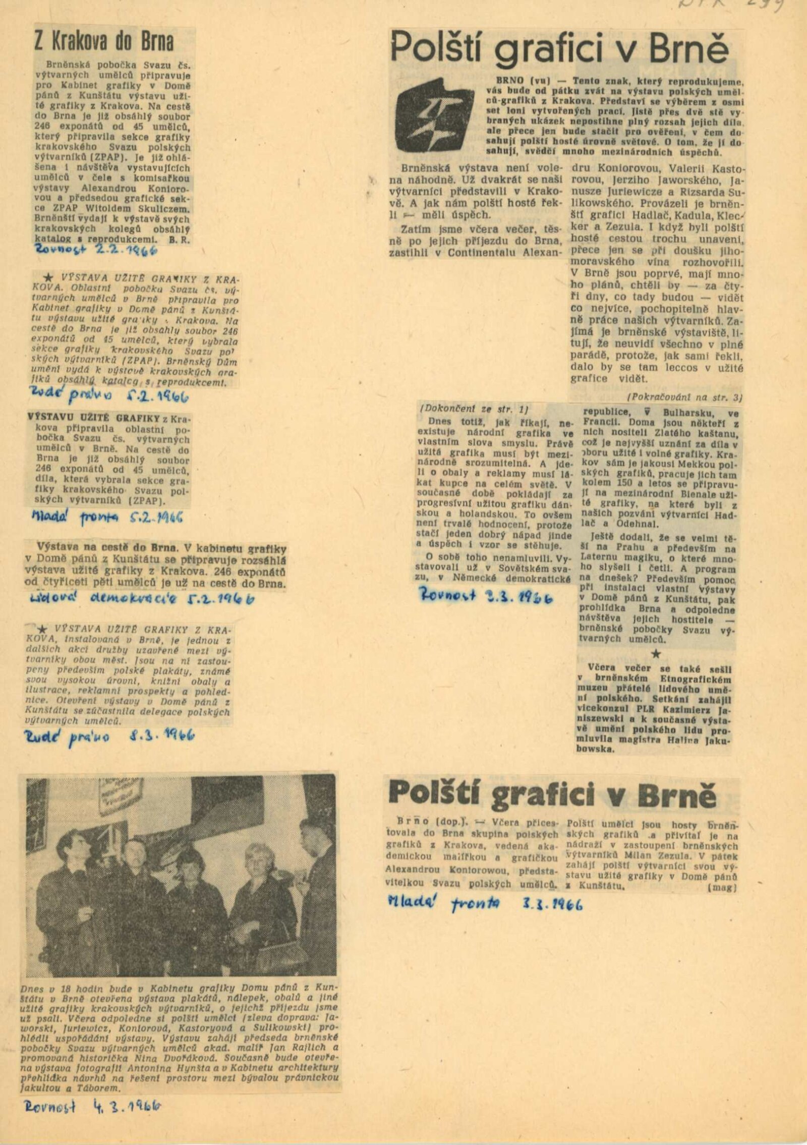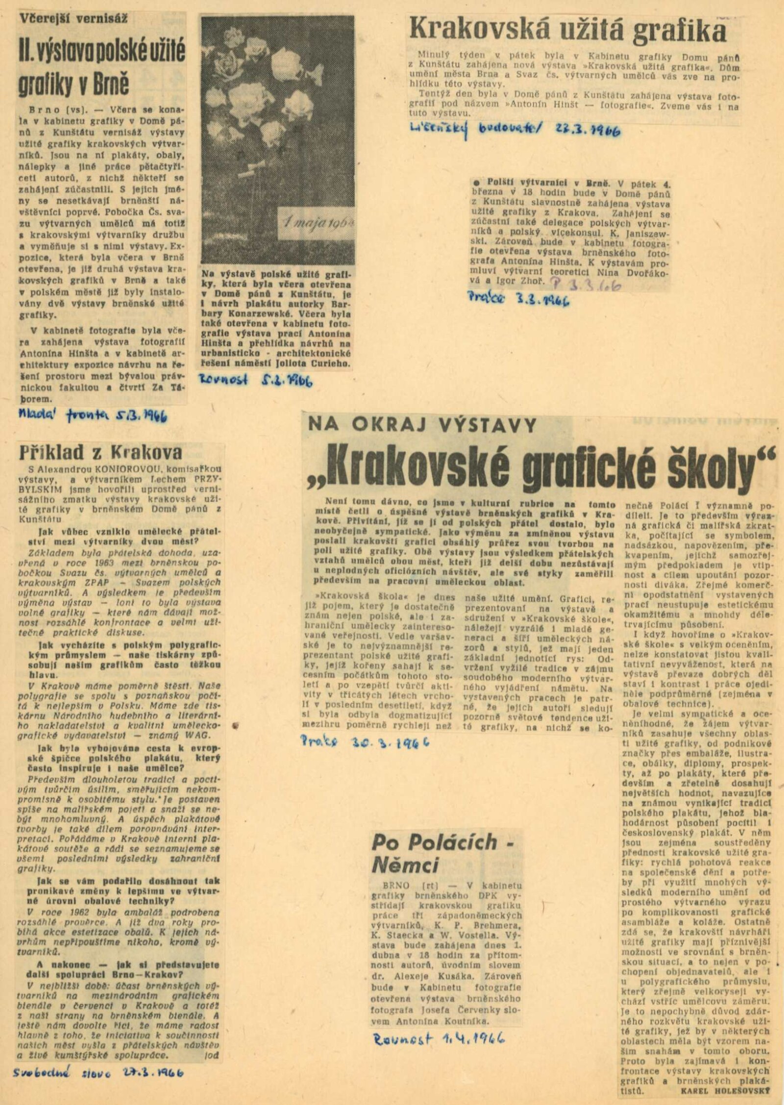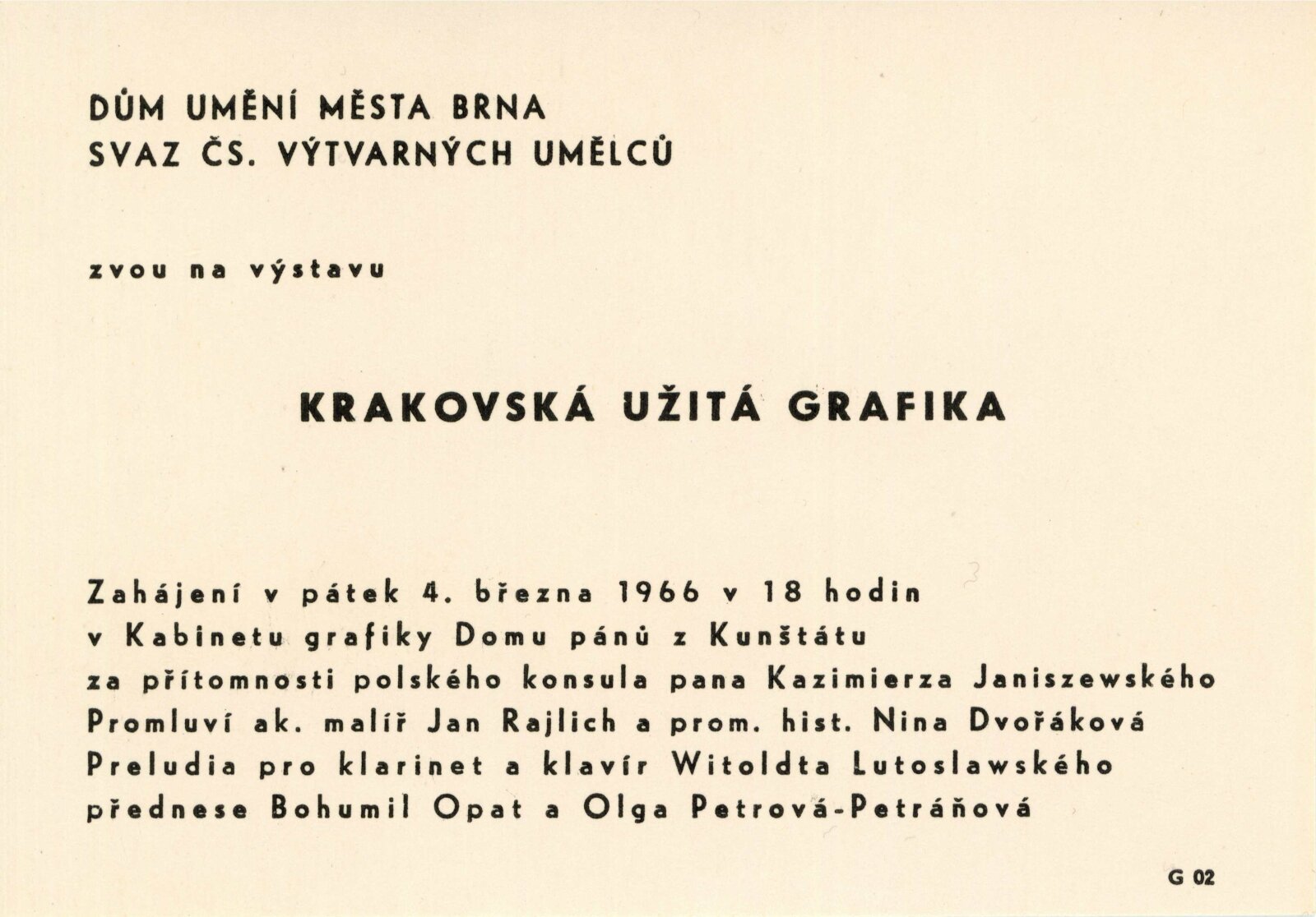 Užitá grafika. Krakov: Dům umění města Brna / Dům pánů z Kunštátu, 73. výstava Kabinetu grafiky, 4. 3. – 27. 3. 1966 / Text: Nina Dvořáková. – Brno: DUmB, 1966. – 15 s., obr., životní data vystavujících, DPK 299. – MZK; MG