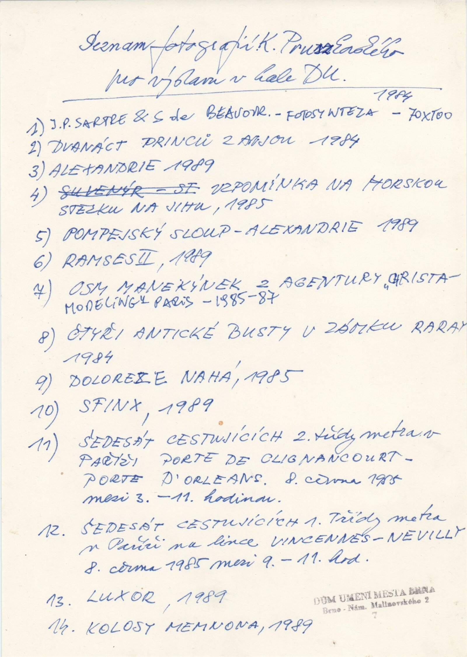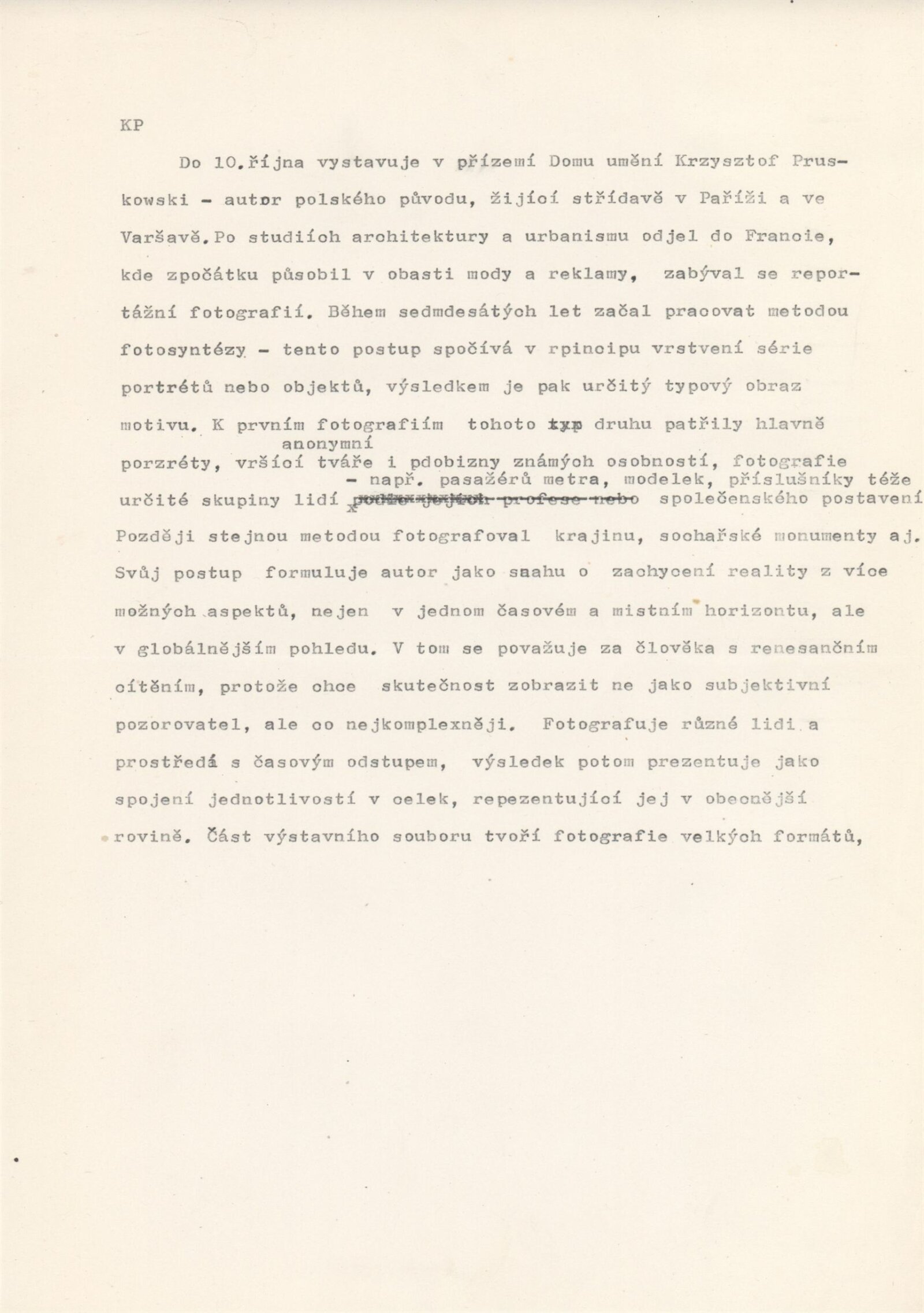 pozvánka, katalog, zprávy pro tisk, strojopis pozvánky, podklady ke katalogu, korespondence o realizaci výstavy, katalog PHP Praha, recenze v tisku, katalogy z výstav Pruszkowského (1986, 1989, 1991)