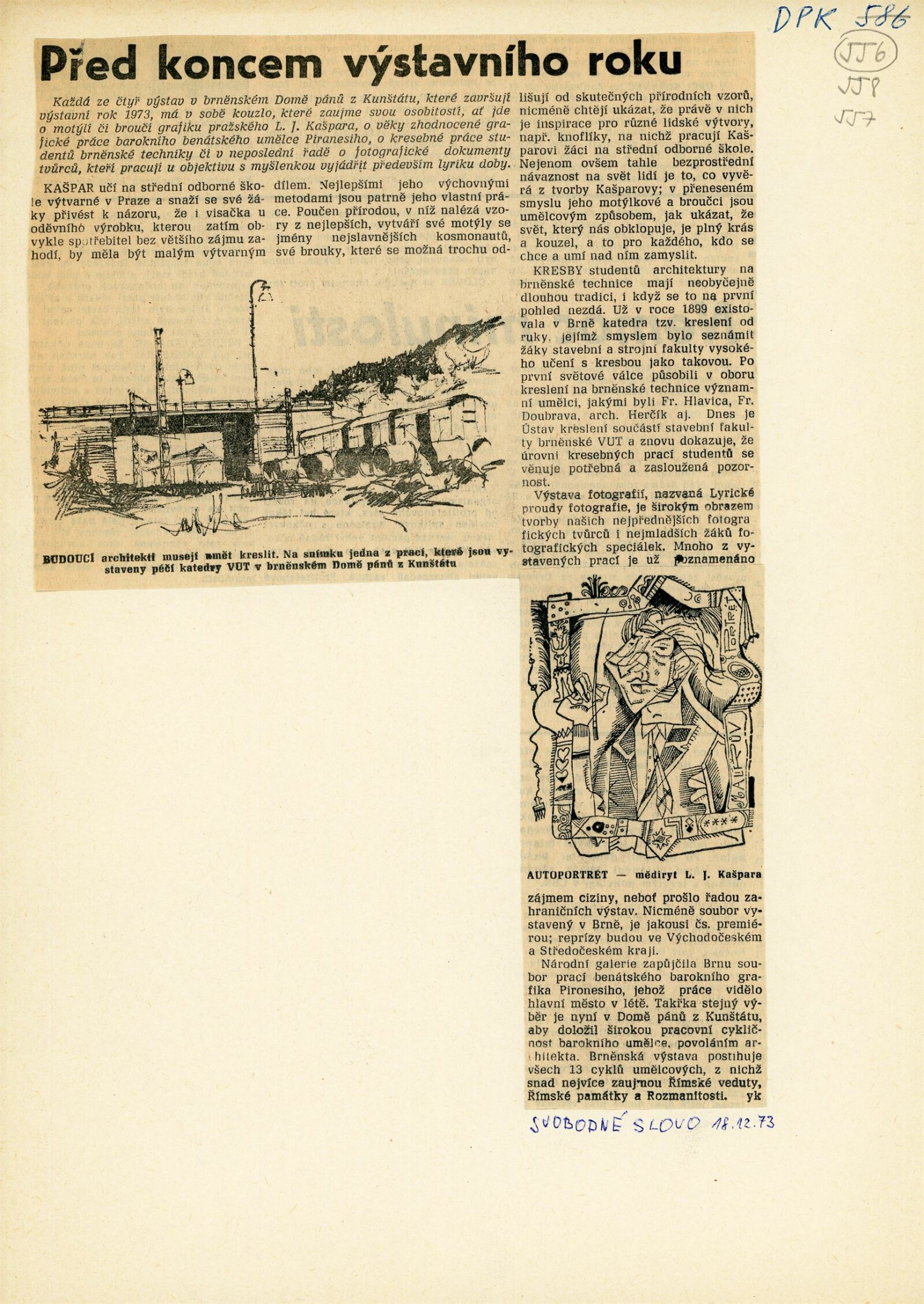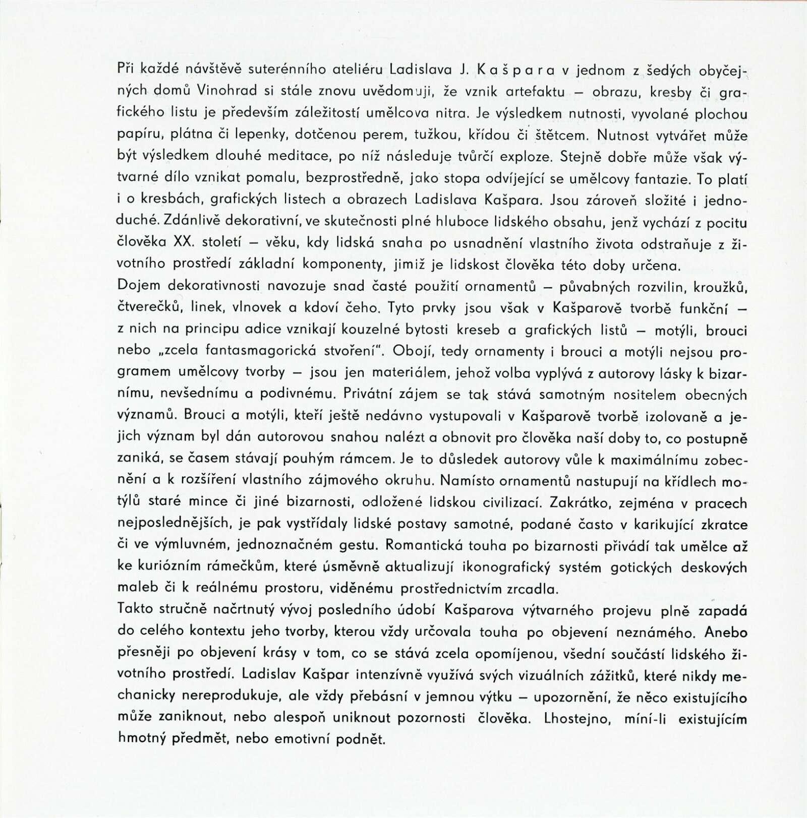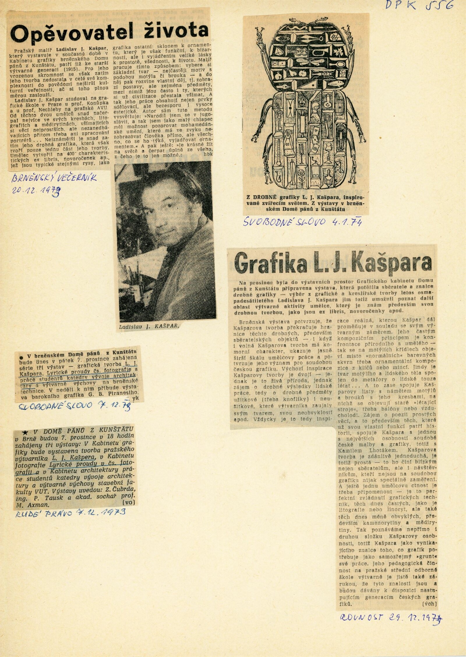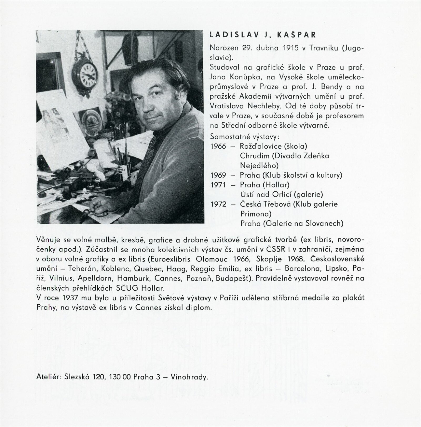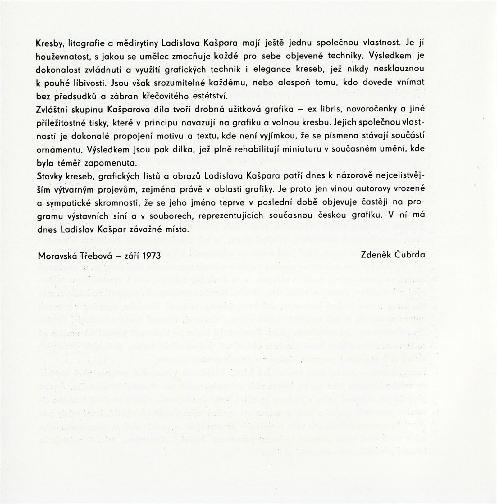 Ladislav J. Kašpar: Dům umění / Dům pánů z Kunštátu, 139. výstava Kabinetu grafiky, 7. 12. 1973 – 1. 1. 1974 / Text: Zdeněk Čubrda. – Brno: DUmB, 1973. – 14 s., obr., seznam vystavených prací 1 s., portrét, životopis, DPK 556