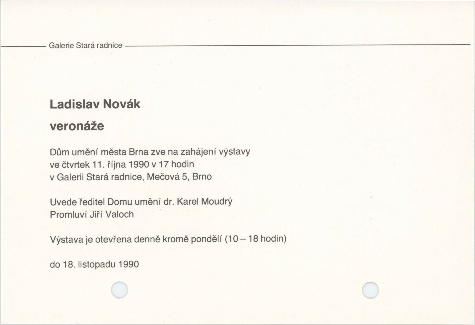 Ladislav Novák. Veronáže: Galerie Stará radnice, Kabinet grafiky, 11. 10. – 18. 11. 1990 / Text: Jiří Valoch. – Brno: DUmB, 1990. – [12] s., obr., životní data, výstavy, vlastní publikace, GSR 80. – MG