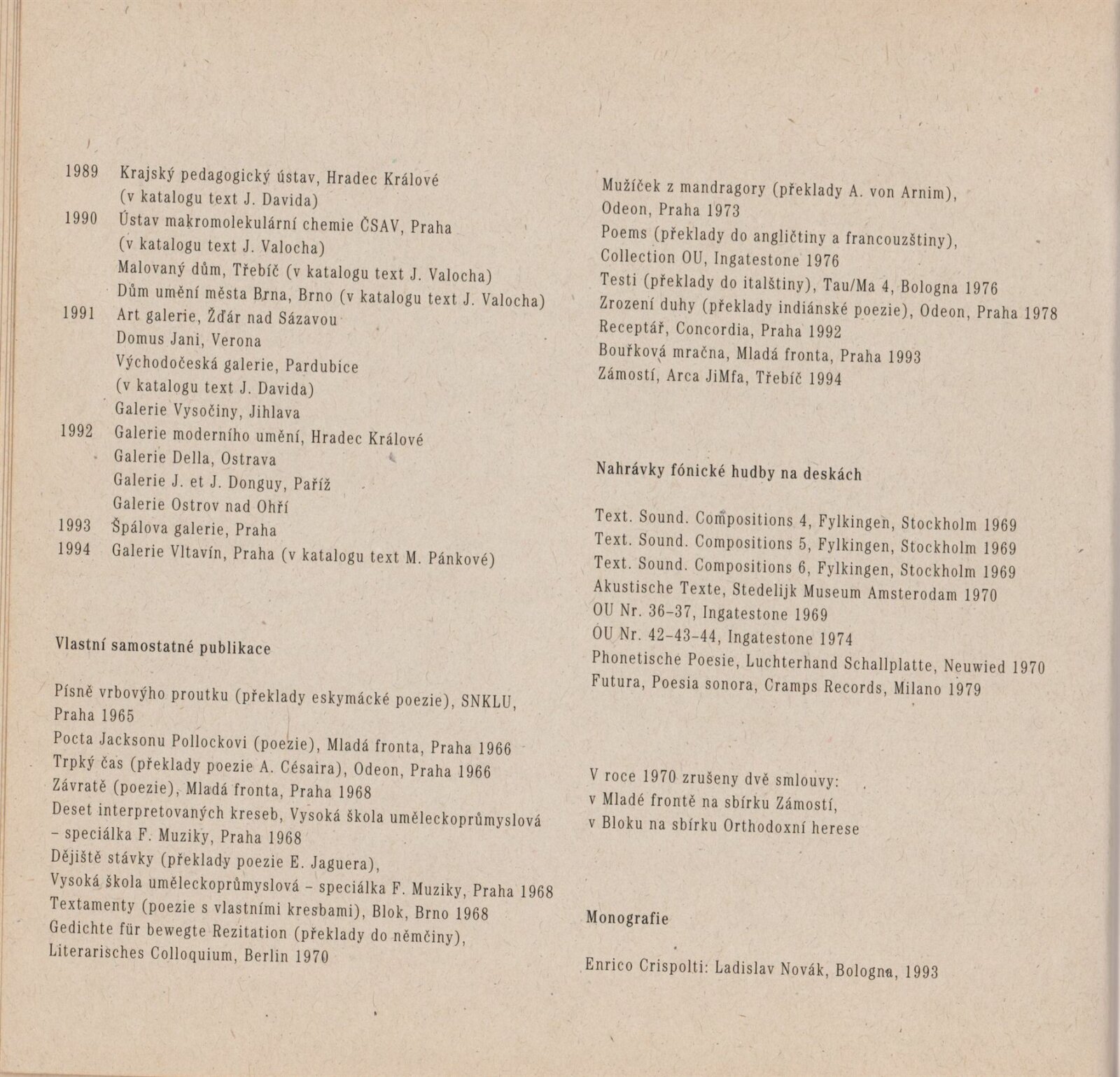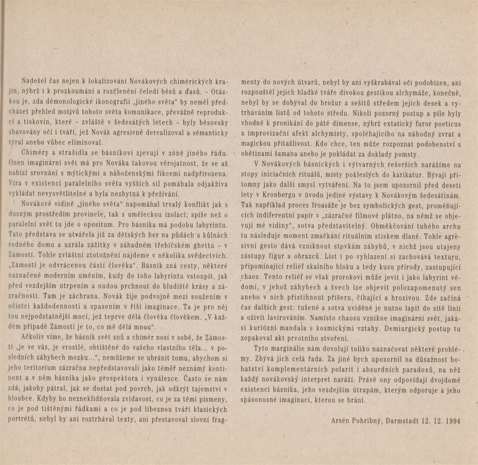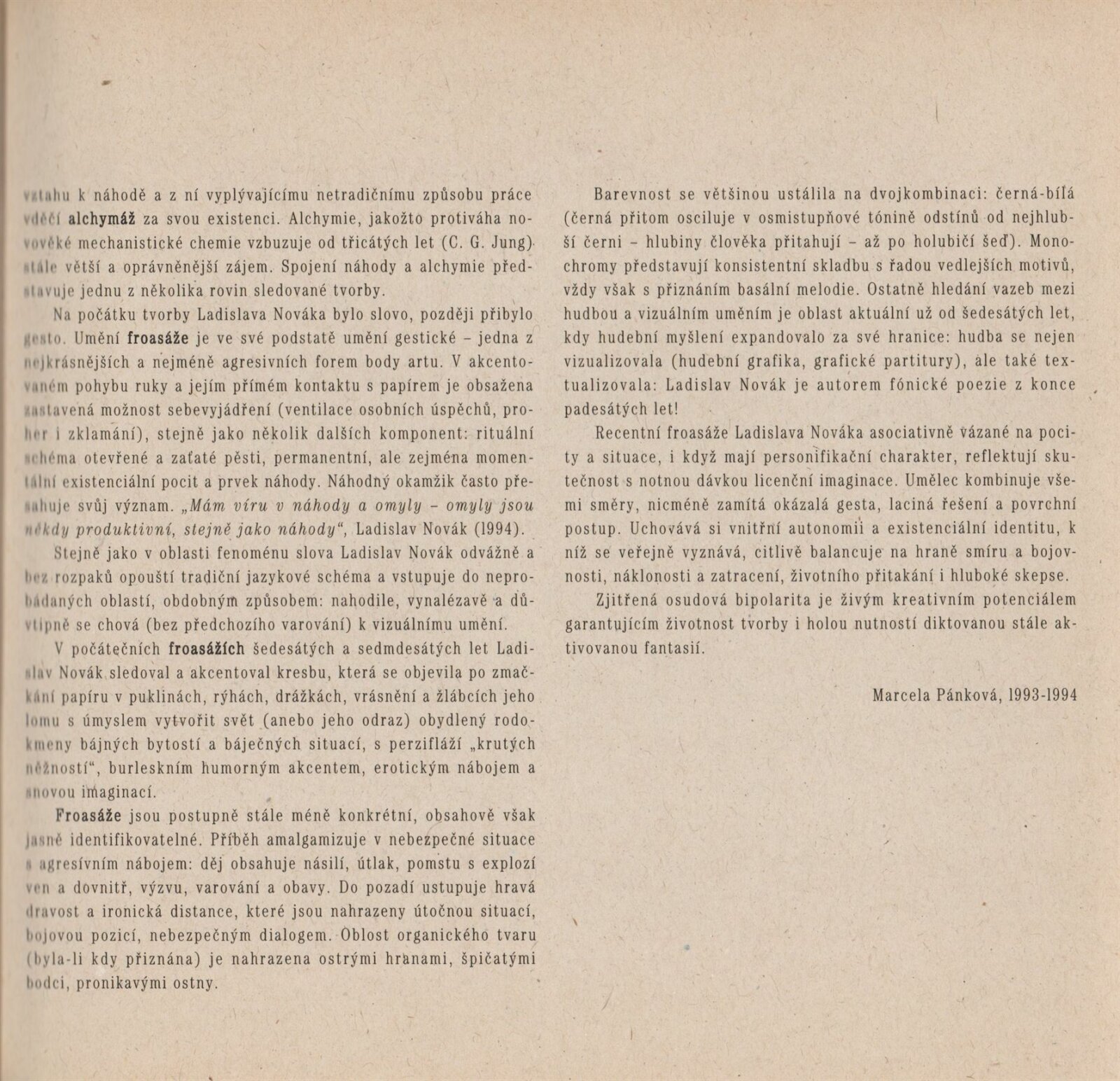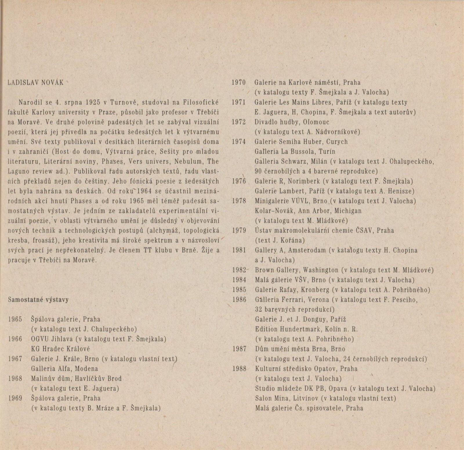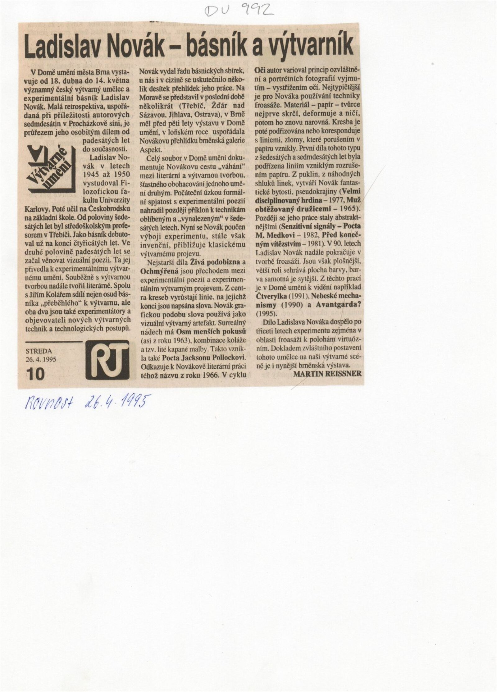 Ladislav Novák: ... Dům umění města Brna, Procházkova síň, 18. 4. – 14. 5. 1995 ... / Texty Jan Severa, Jiří Valoch, Marcela Pánková, Arsén Pohribný. - Ústí nad Labem: Nadace Lidé výtvarnému umění výtvarné umění lidem [1995.] - [82] s., obr. DU 992; MZK