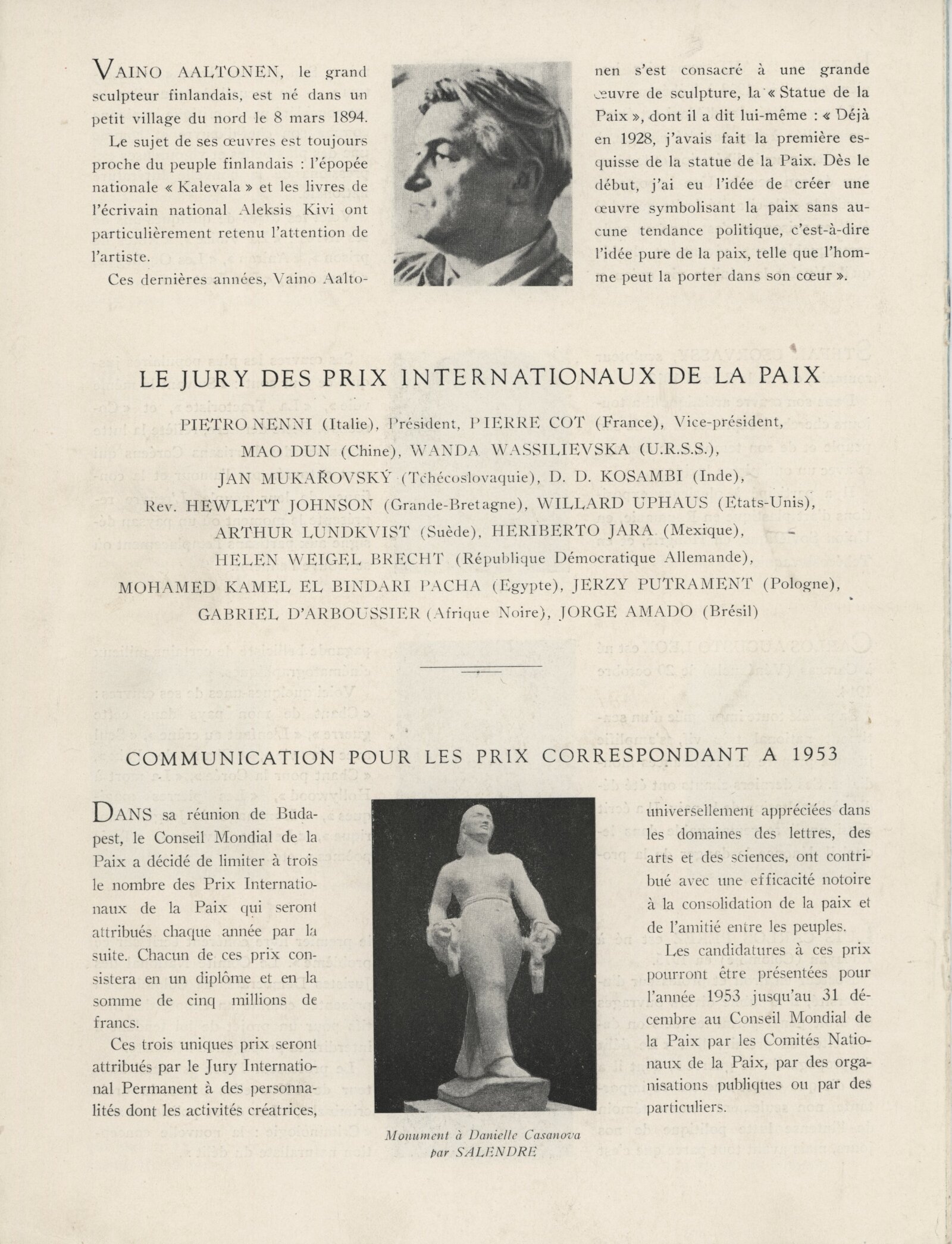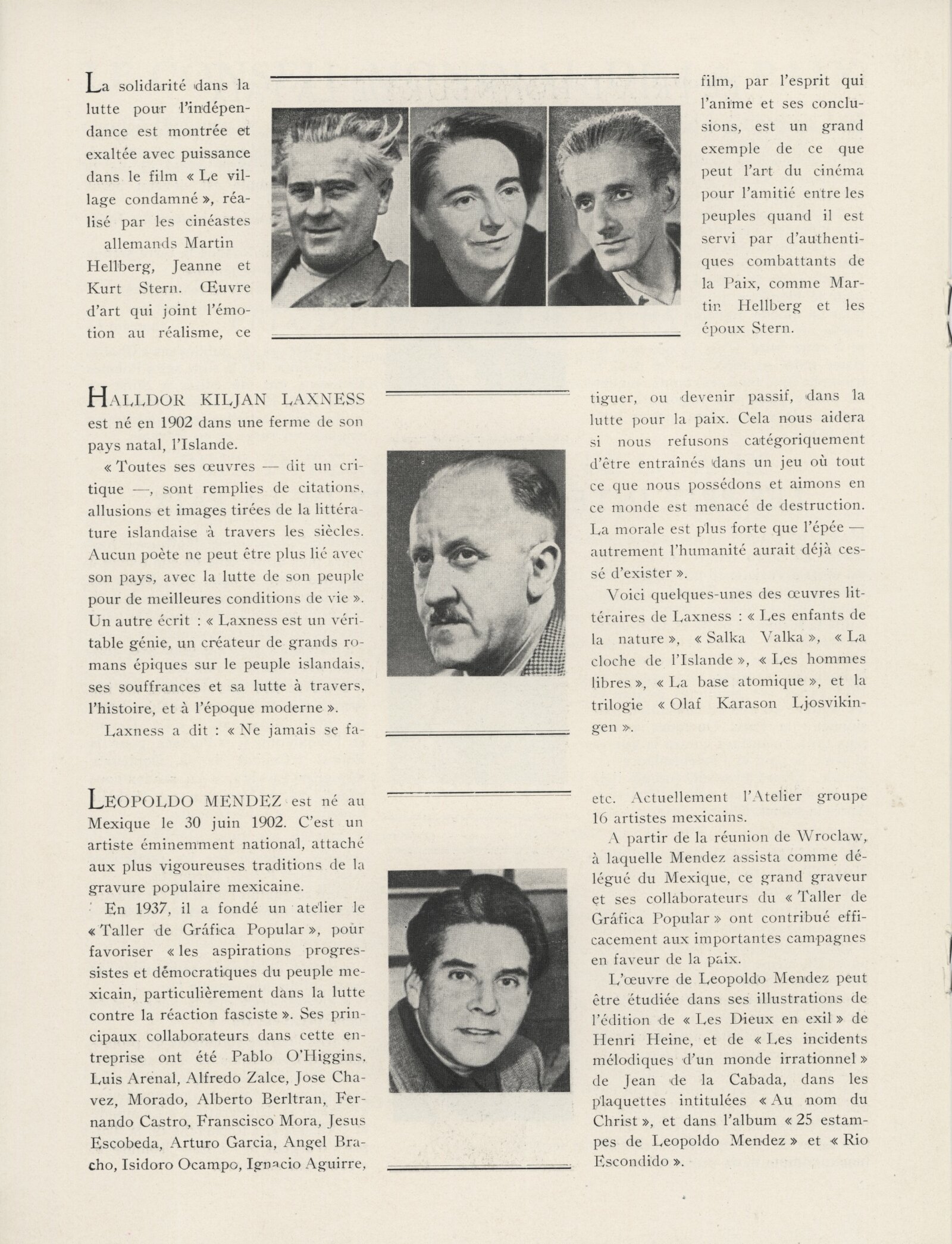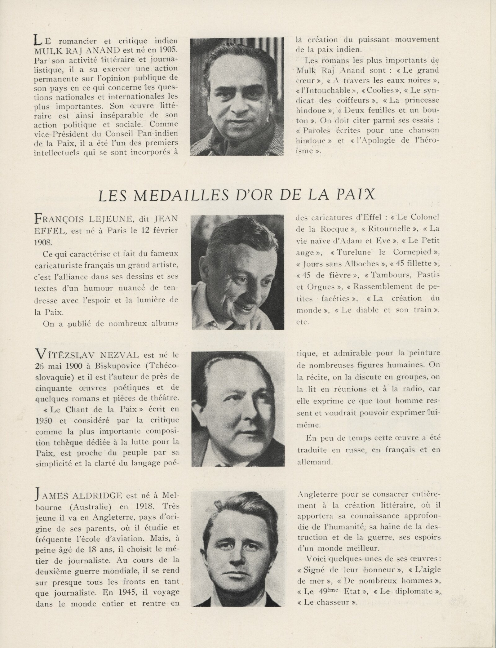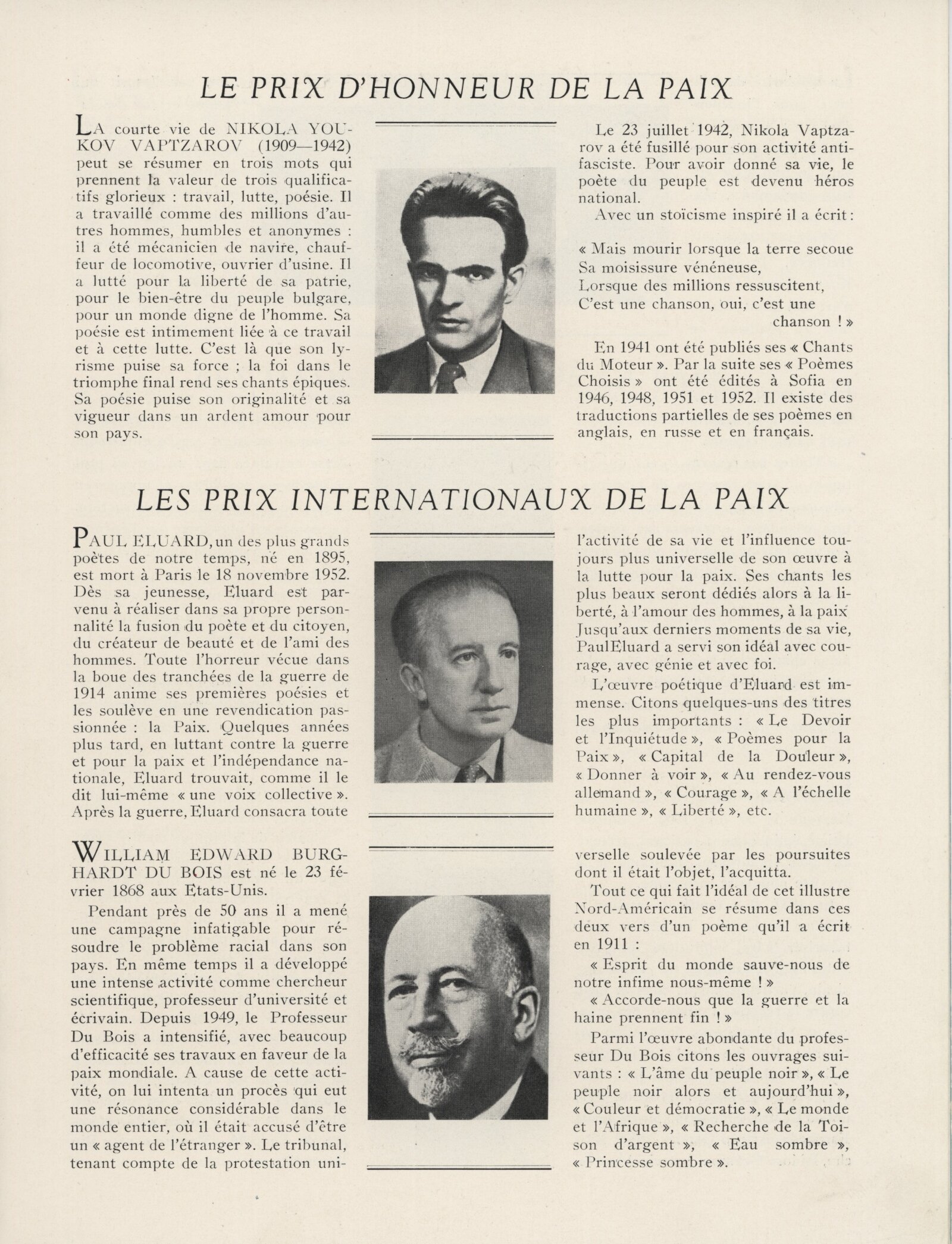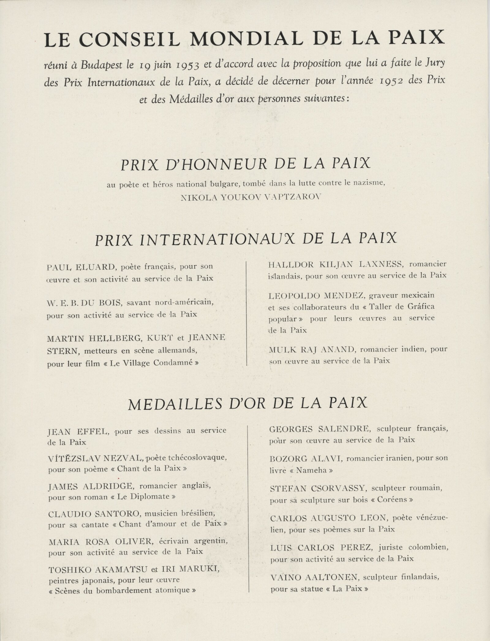 Nikola Youkov Vaptzarov, Paul Éluard, William Edward Burghardt du Bois, Halldor Kiljan Laxness, Leopold Mendez, Mulk Raj Anand, François Lejeune, Jean Effel, Vítězslav Nezval, James Aldridge, Claudio Santoro, Maria Rosa Oliver, Iri Maruki, Toshikio Akamatsu, Georges Salendre, Bozorg Alavi, Stefan Csorvassy, Carlos Augusto Leon, Luis Carlos Perez