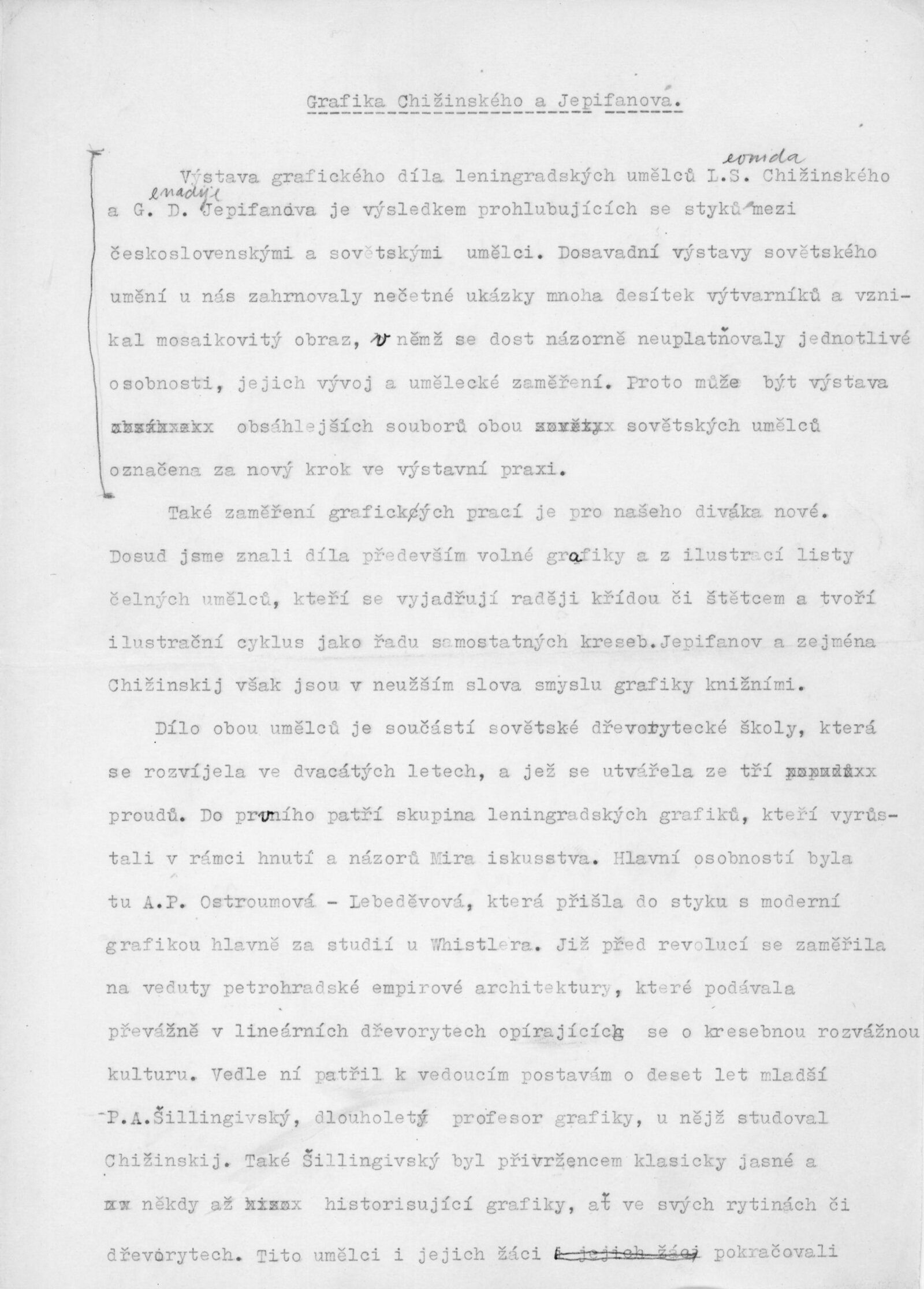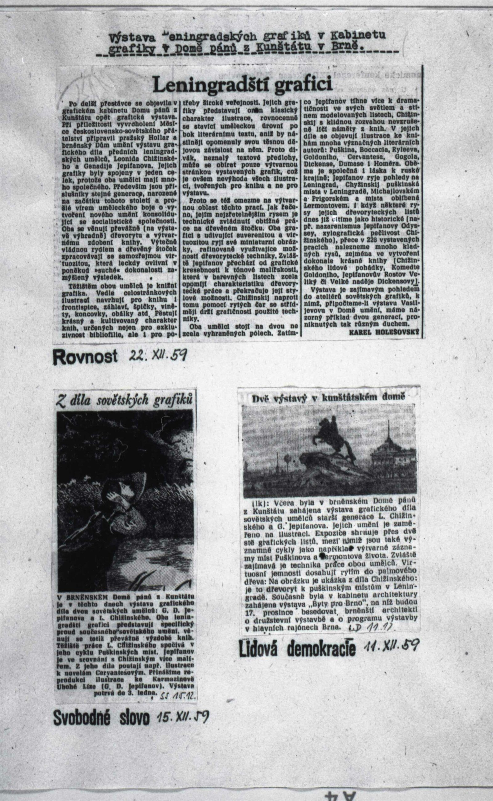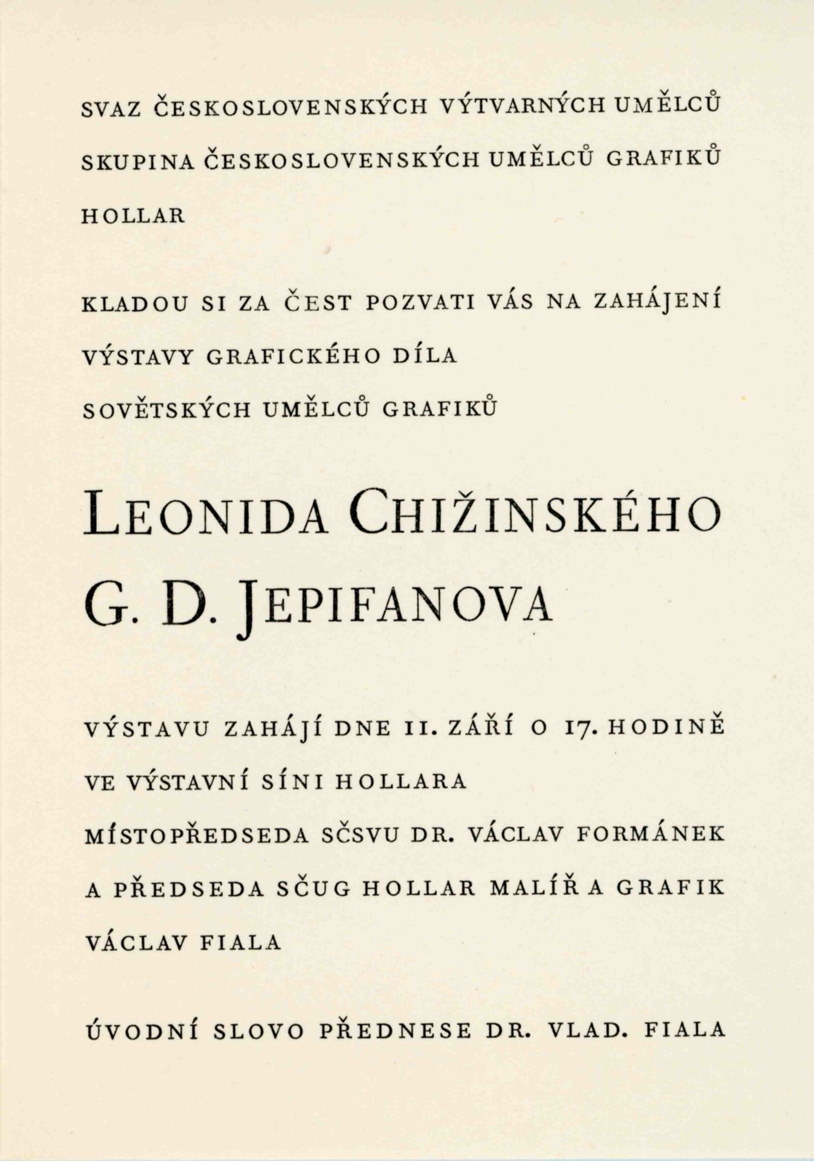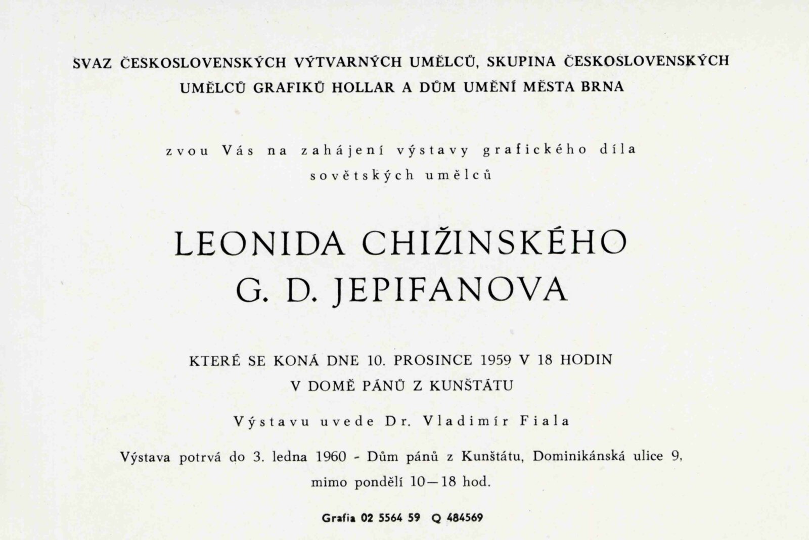Leningradští grafici Leonid Chižinskij a G. D. Jepifanov: Dům umění města Brna / Dům pánů z Kunštátu, 8. výstava Kabinetu grafiky, 10. 12. 1959 – 3. 1. 1960 / Převzatý katalog. Grafická díla sovětských umělců Leonida Chižinského, Gennadije Jepifanova: Výstavní síň Hollar v Praze, září 1959 / Text: Vladimír Fiala. – Praha: ČFVU, 1959. – 10 s., obr., DPK 47. – MG
