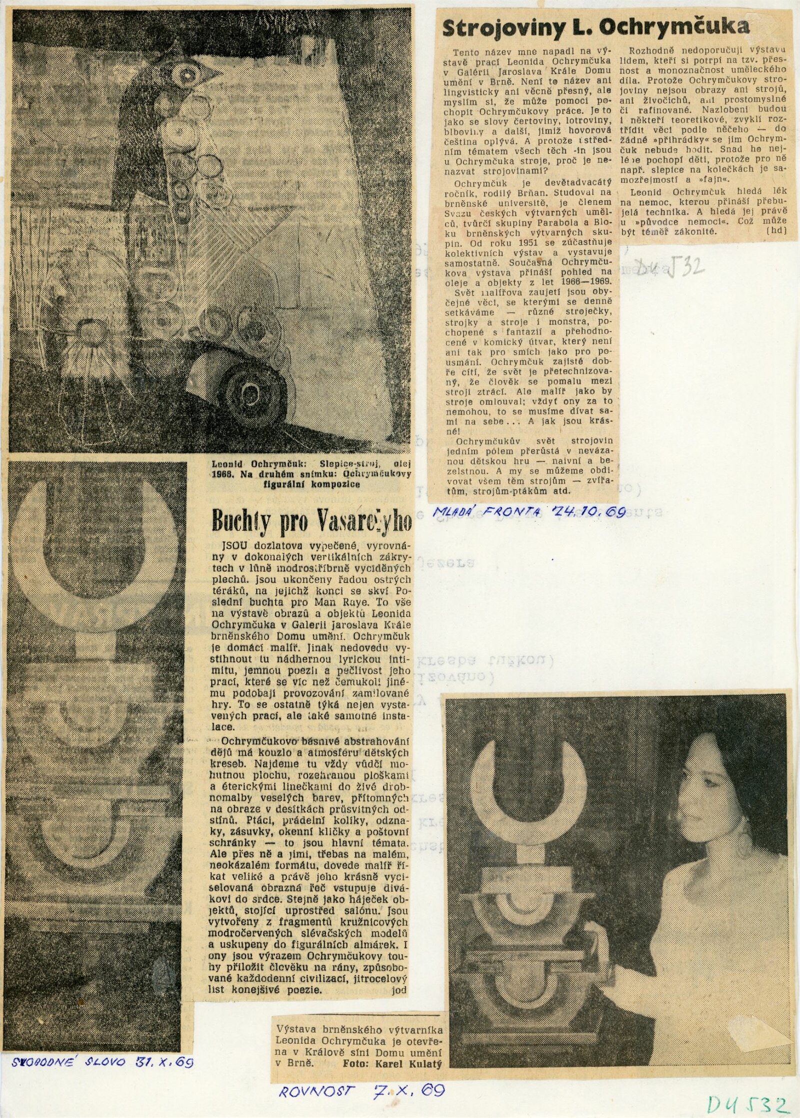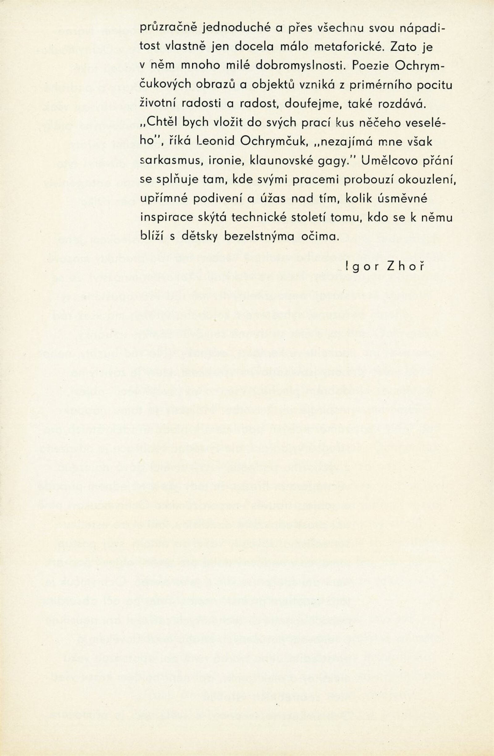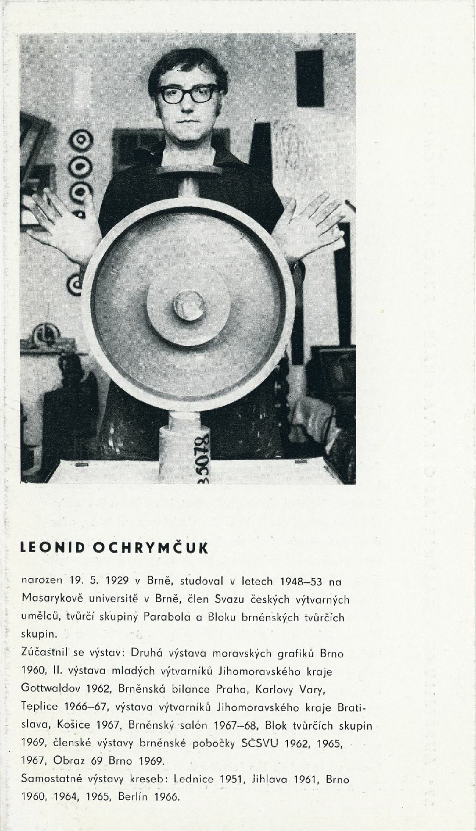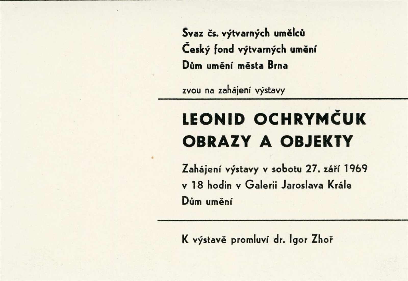 Leonid Ochrymčuk. Obrazy a objekty: Dům umění, 27. výstava v Galerii Jaroslava Krále, 27. 9. – 2. 11. 1969 / Text: Igor Zhoř. – Brno: ČFVU, 1969. – 10 s., obr., portrét, životopis, DU 532. – MZK; MG; MMB