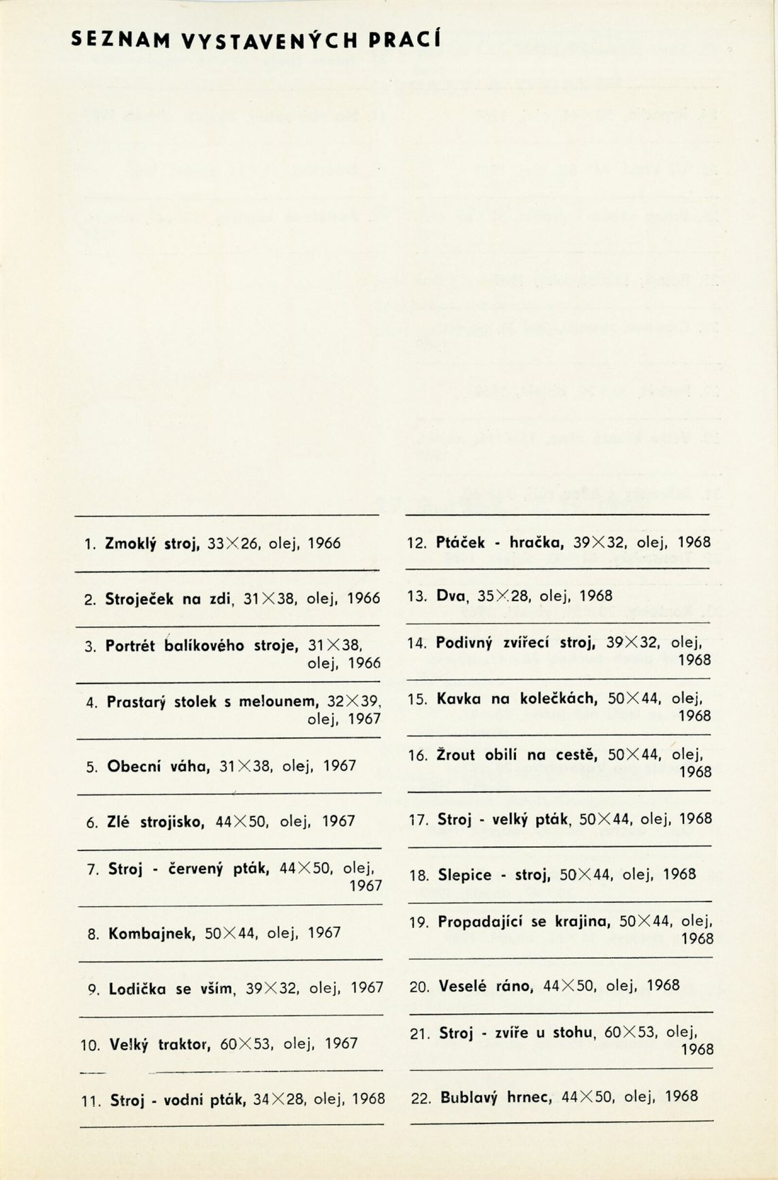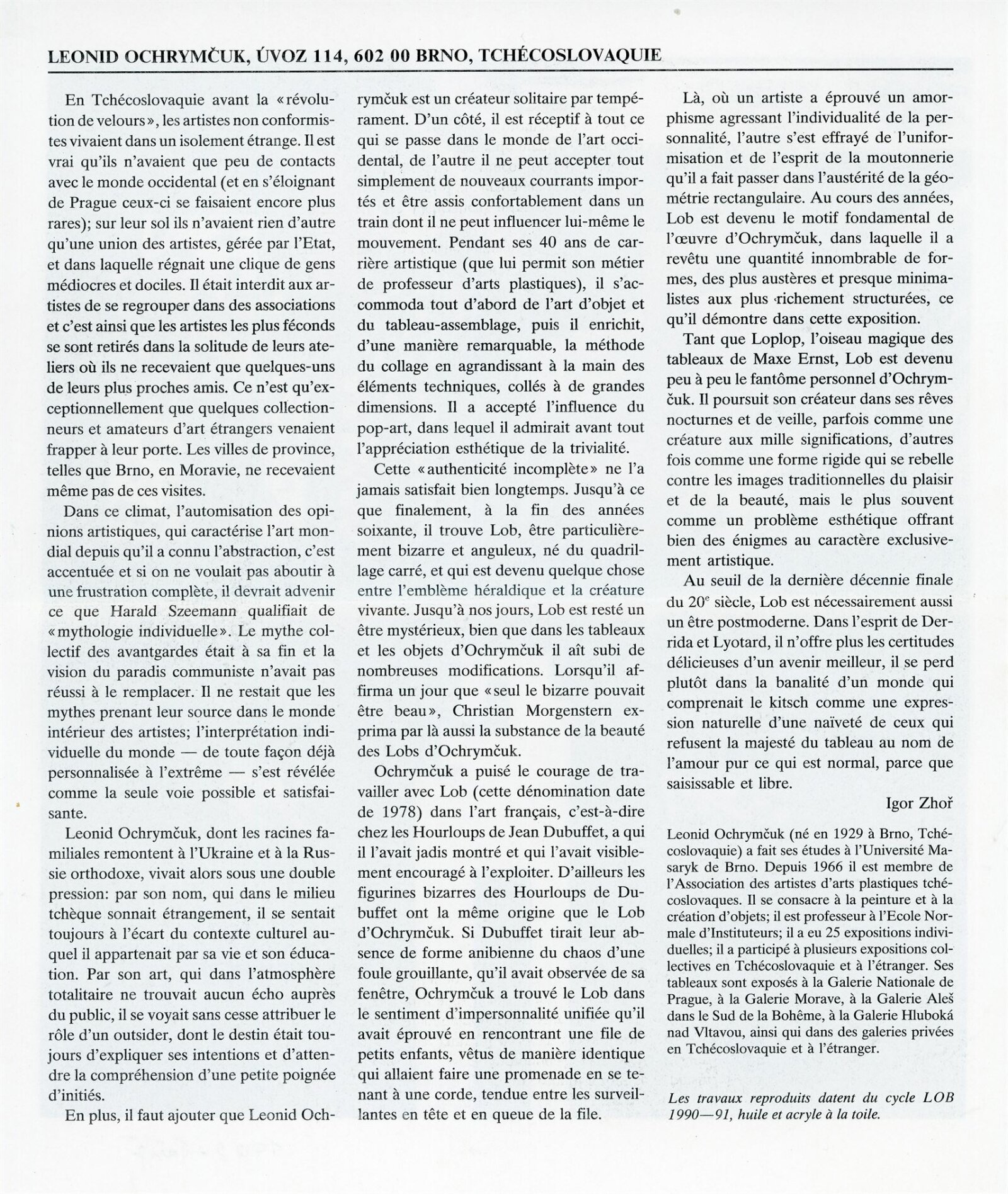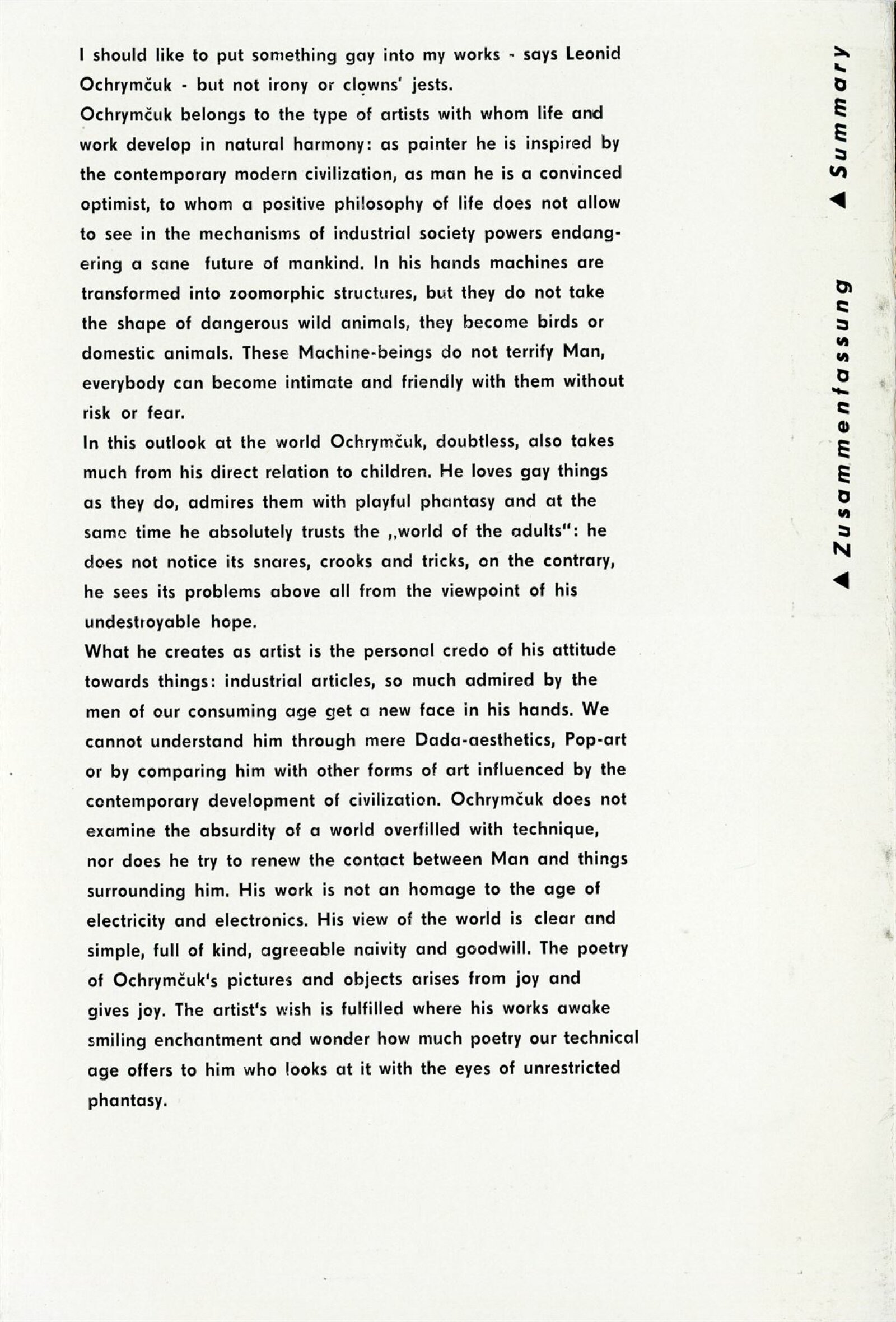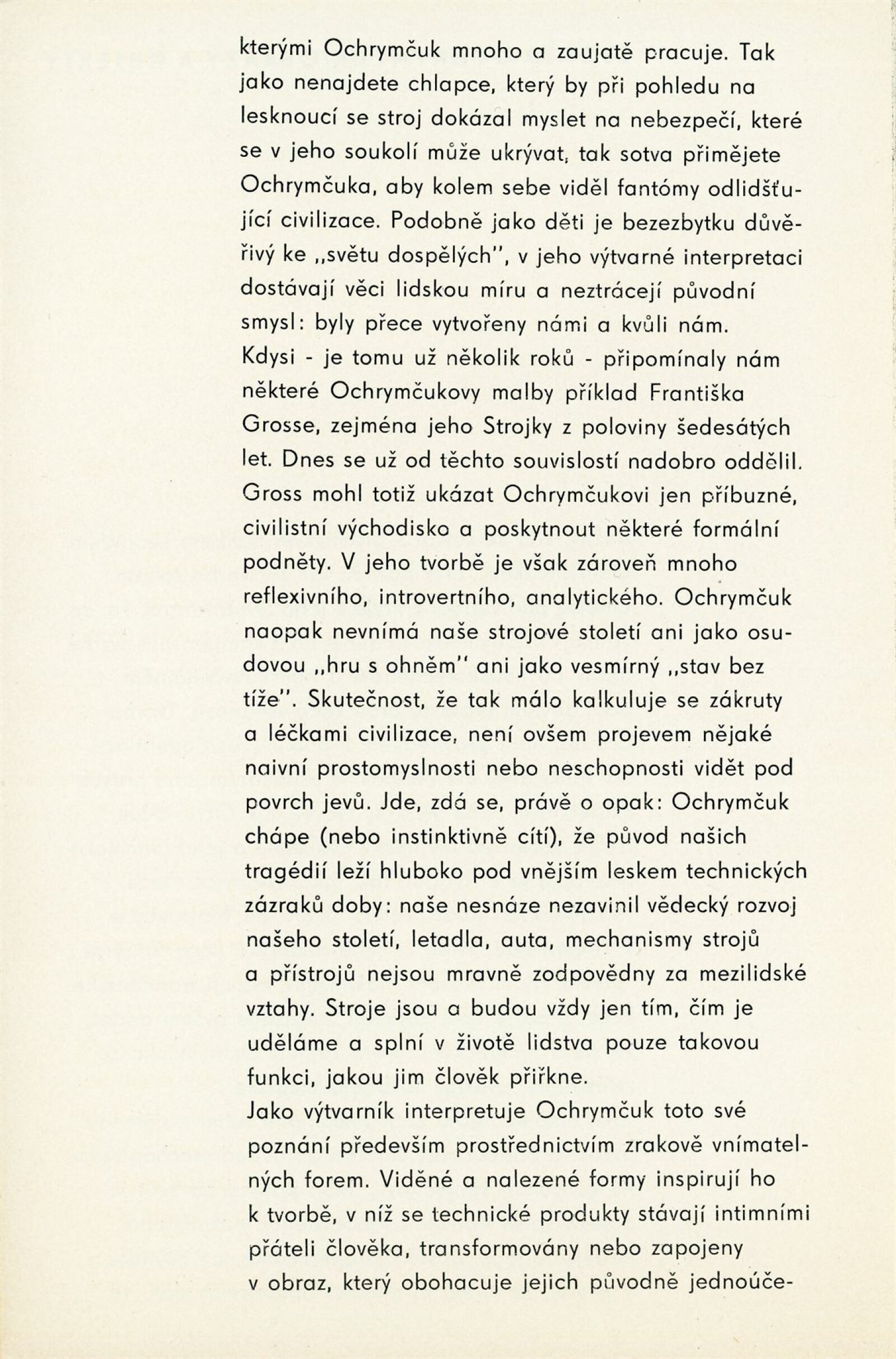 Leonid Ochrymčuk. Obrazy a objekty: Dům umění, 27. výstava v Galerii Jaroslava Krále, 27. 9. – 2. 11. 1969 / Text: Igor Zhoř. – Brno: ČFVU, 1969. – 10 s., obr., portrét, životopis, DU 532. – MZK; MG; MMB