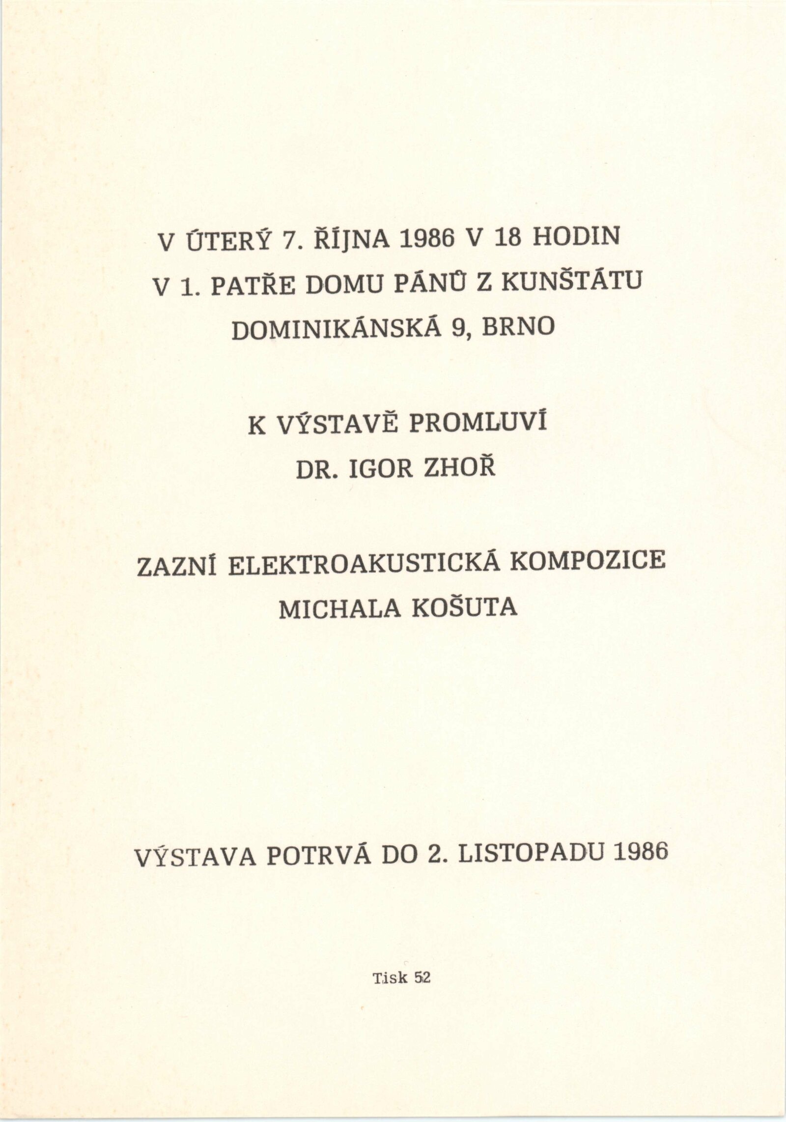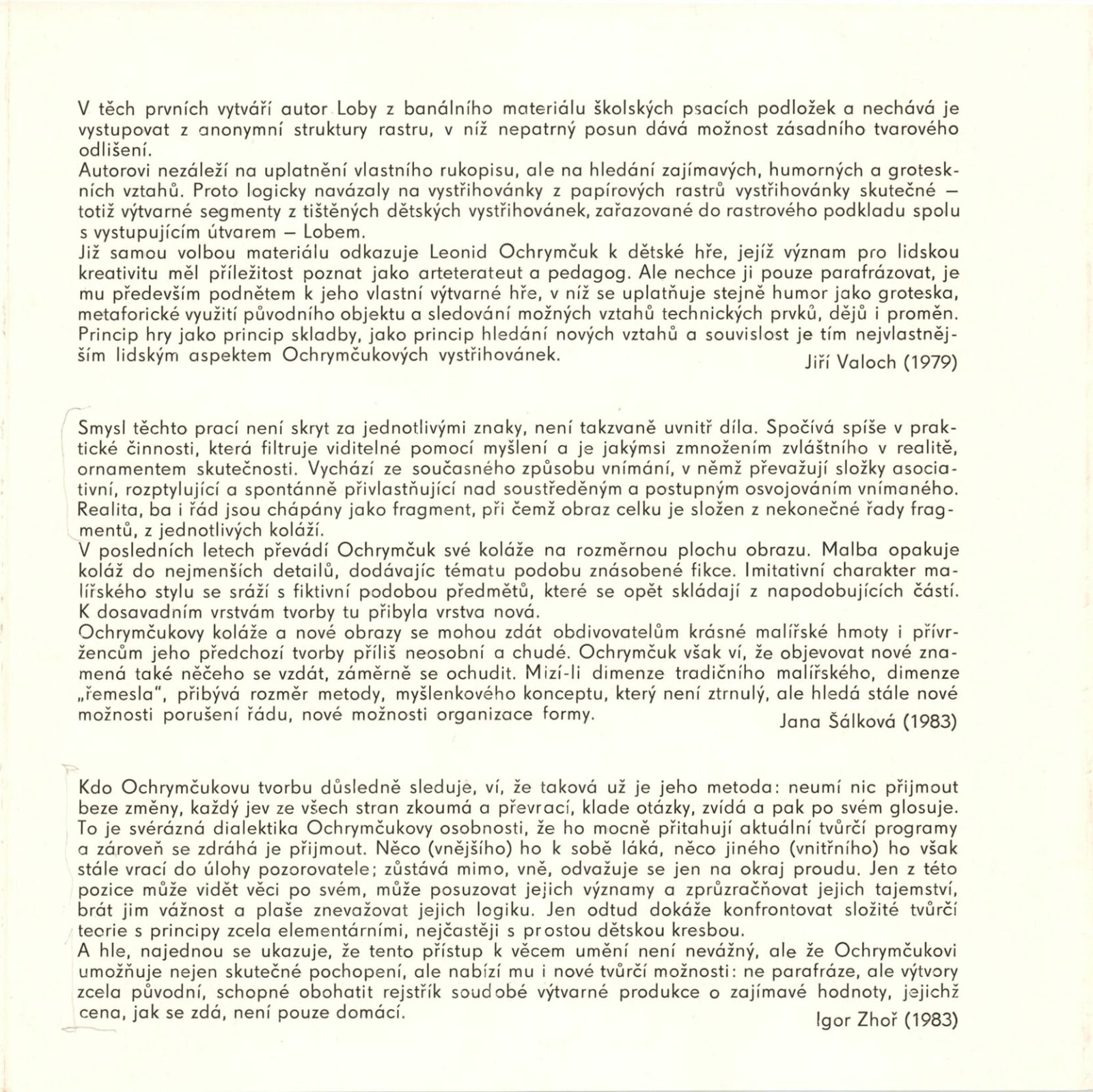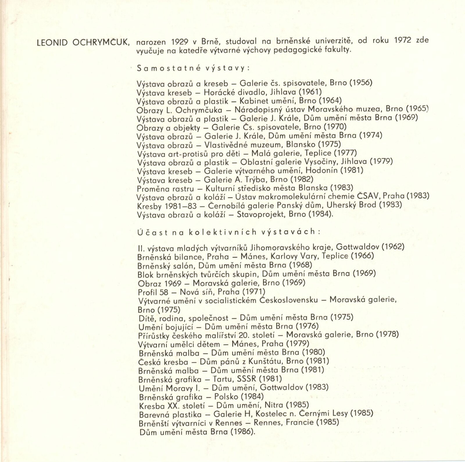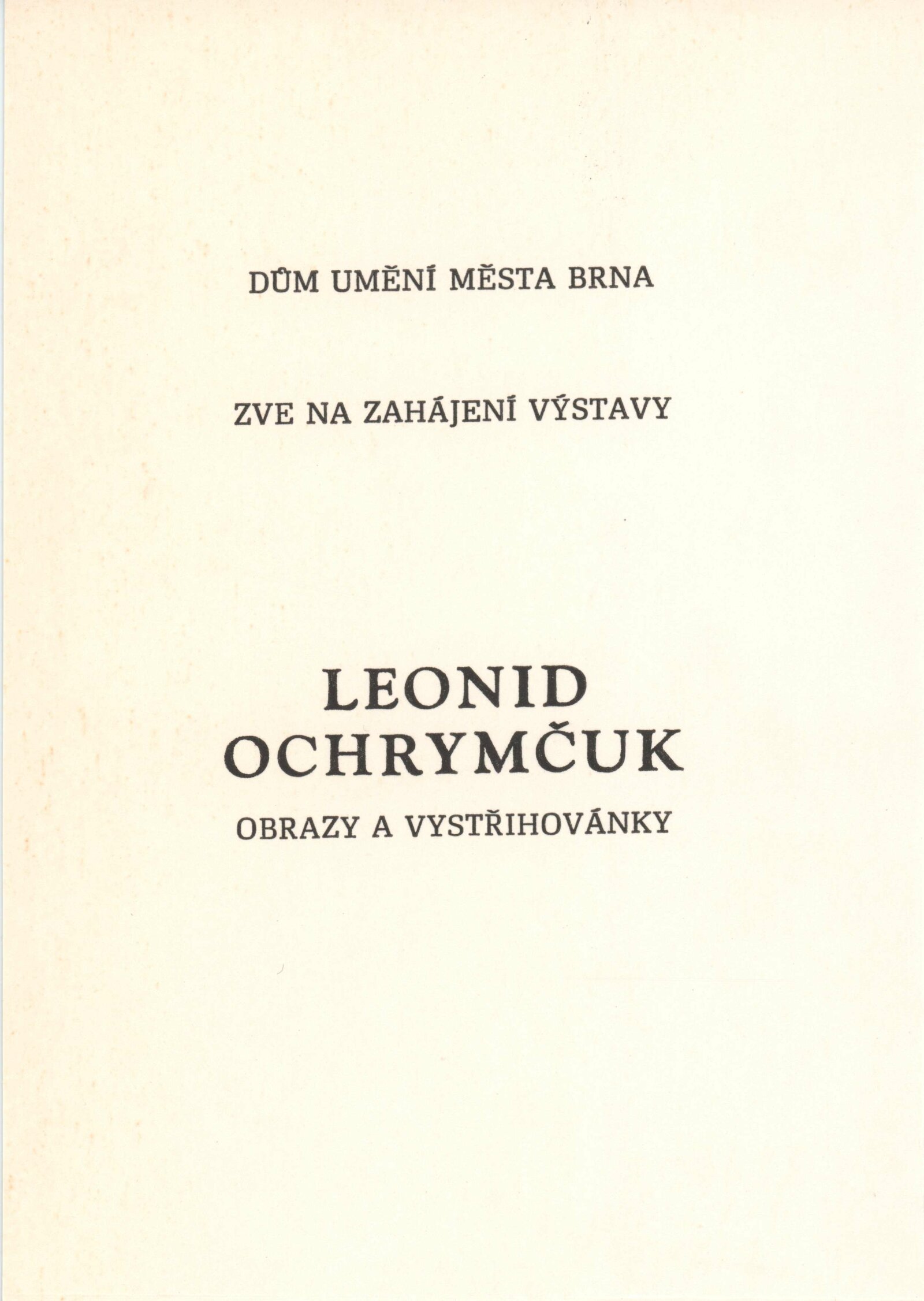 Leonid Ochrymčuk. Obrazy a vystřihovánky: Dům umění / Dům pánů z Kunštátu, 7. 10. – 2. 11. 1986 / Texty: různých autorů. – Brno: DUmB, 1986. – [16] s., obr. ve skládačce (6 s.), životní data, výstavy, DPK 873. – MZK; MG; MMB