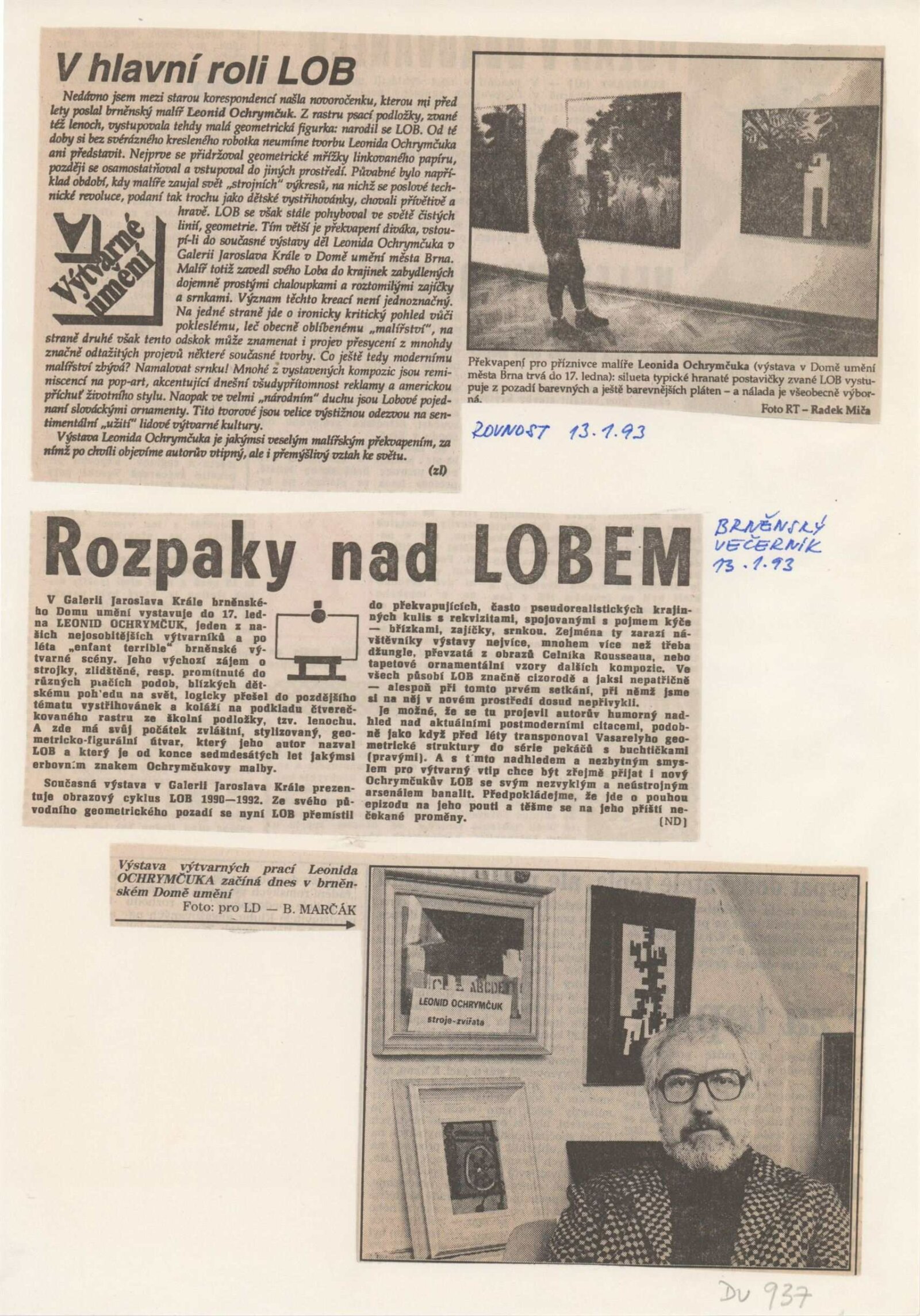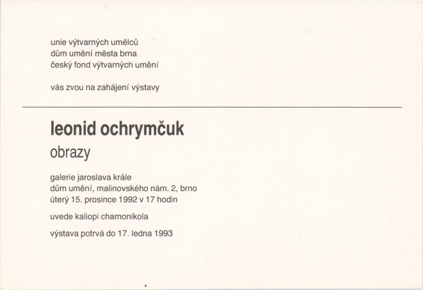 Leonid Ochrymčuk: Dům umění města Brna, 174. výstava v Galerii Jaroslava Krále, 15. 12. 1992 – 17. 1. 1993 / Text: Kaliopi Chamonikola. – Brno: UVU, 1992. – skládačka (6 s.), [12] s. obr. příl., životní data, výstavy, zastoupení ve sbírkách, DU 937. – MZK; MG
