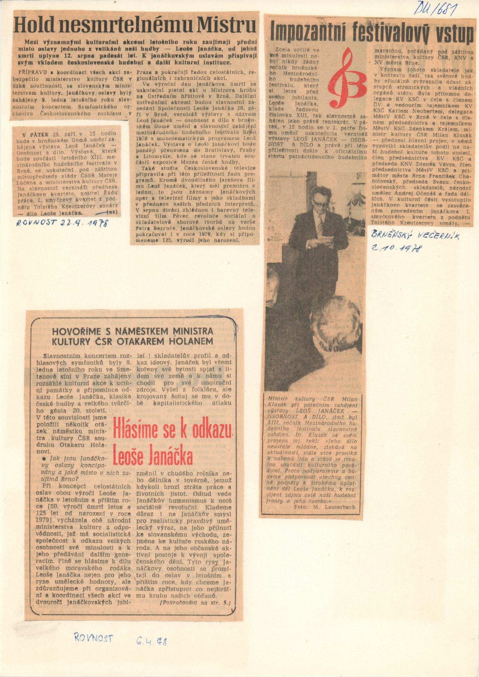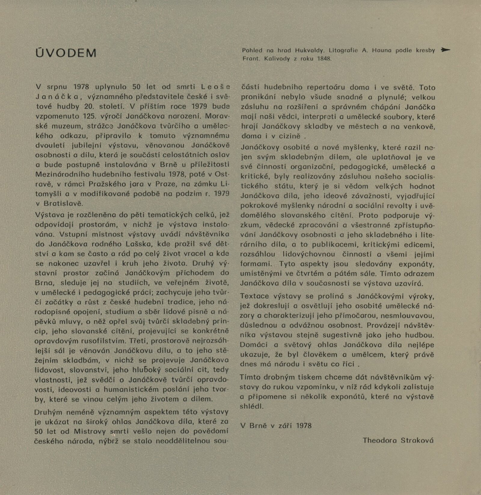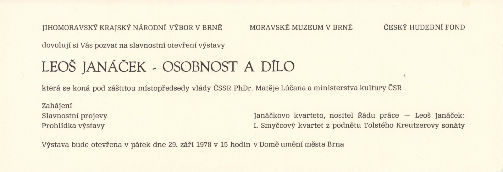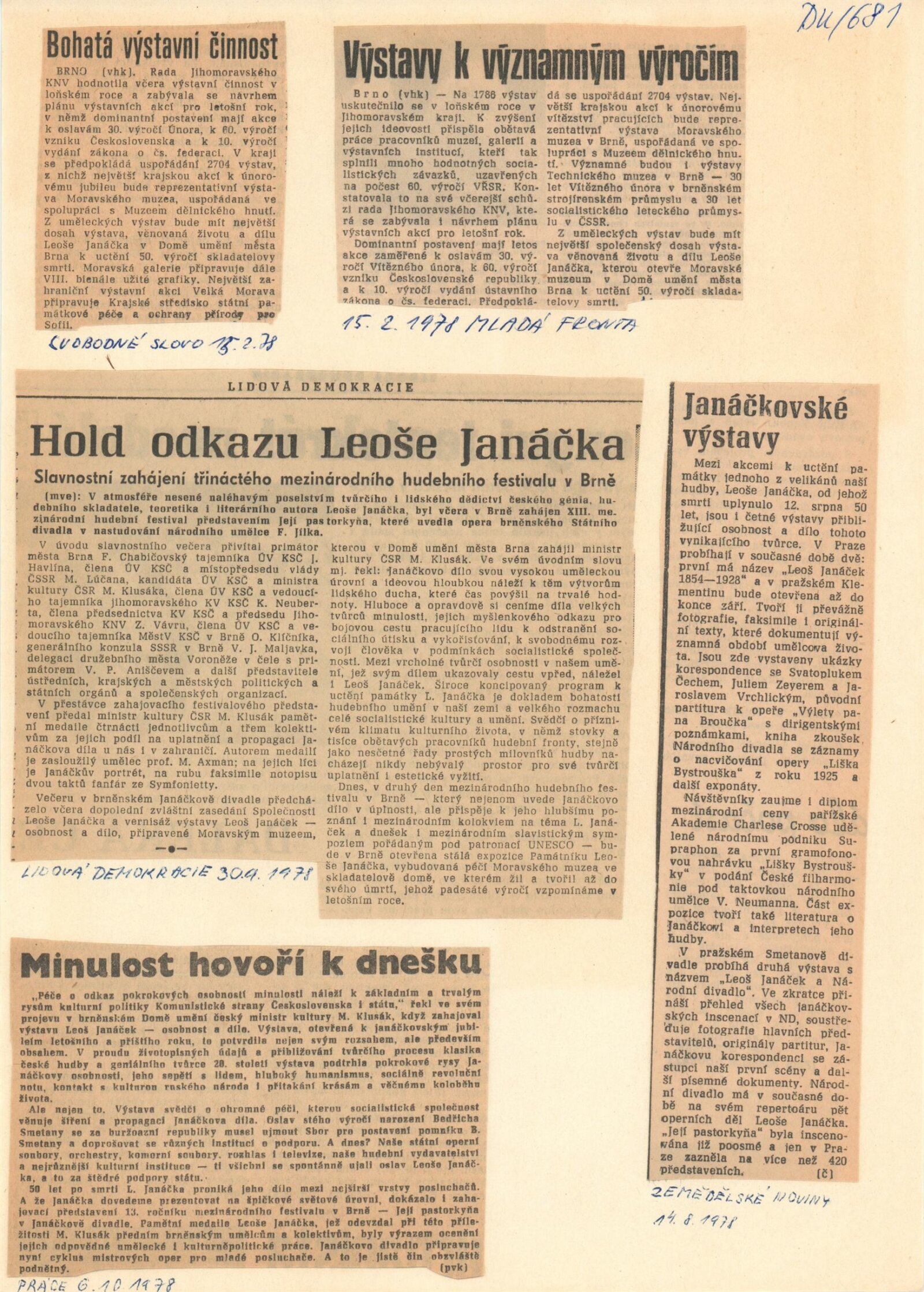pozvánky, katalog, plakát, program festivalu Leoše Janáčka (1978), strojopis textu k výstavě, provozní korespondence, zprávy tiskových konferencí, žádost o povolení výstavy, recenze v tisku