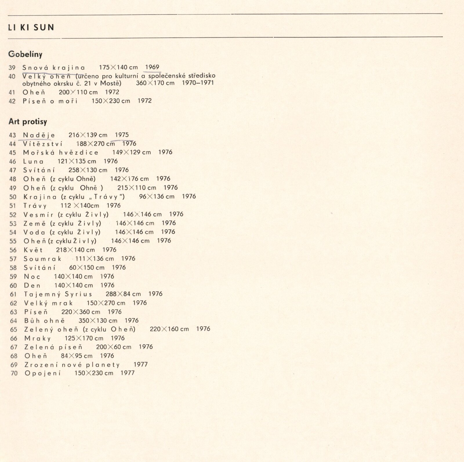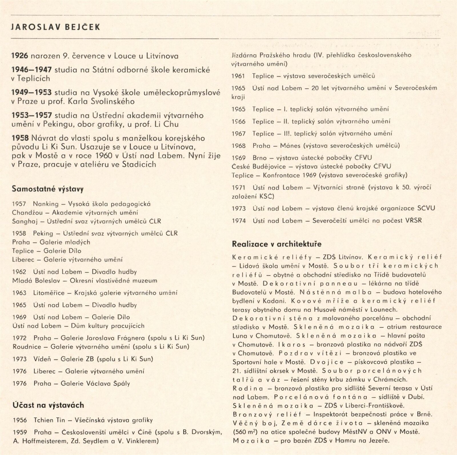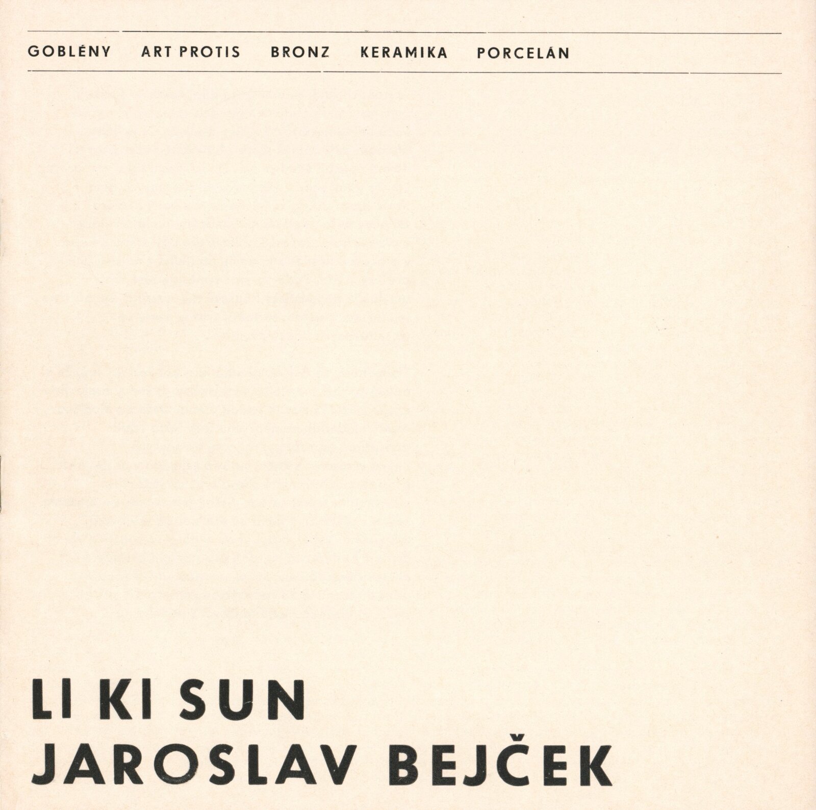 Li Ki Sun, Jaroslav Bejček. Goblény, art protis, bronz, keramika, porcelán: Dům umění / Dům pánů z Kunštátu, 31. 5. – 3. 7. 1977 / Text: Jan Škvára. – Brno: DUmB, 1977. – 22 s., obr., životní data, výstavy, realizace v architektuře, seznam ilustrací, DPK 655. – MZK; MG