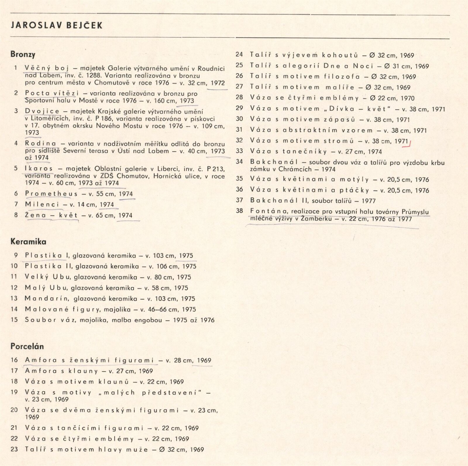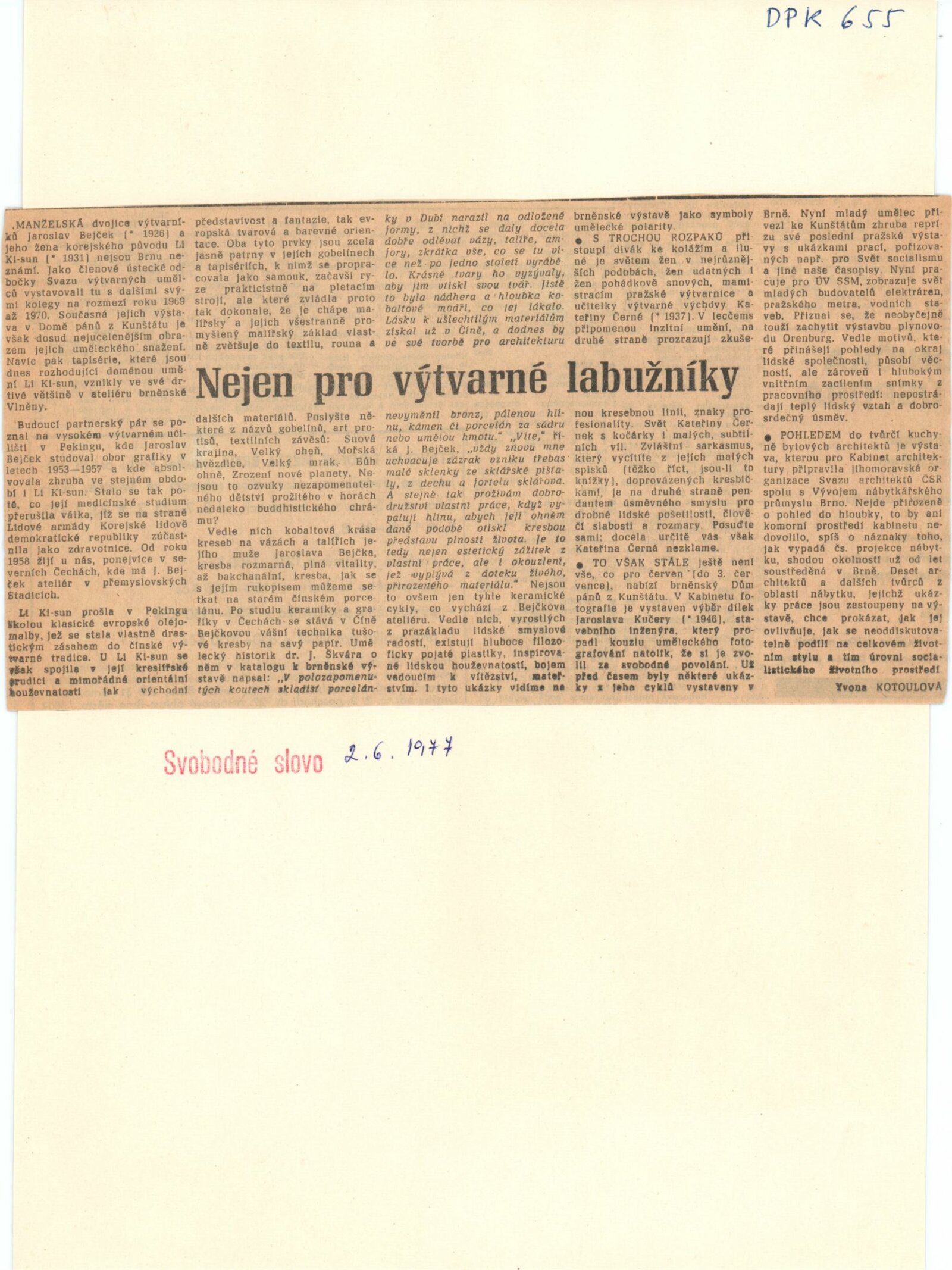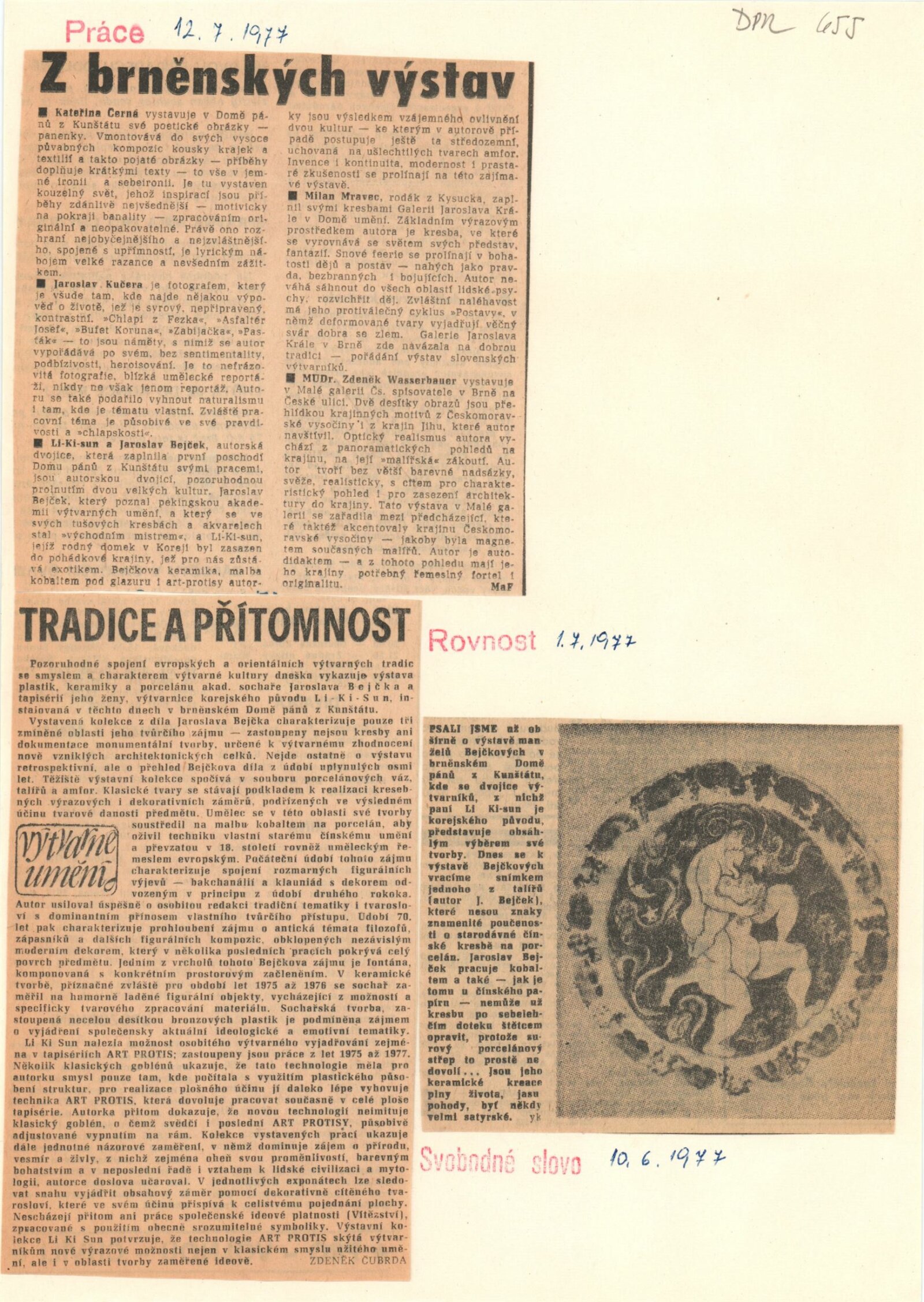 Li Ki Sun, Jaroslav Bejček. Goblény, art protis, bronz, keramika, porcelán: Dům umění / Dům pánů z Kunštátu, 31. 5. – 3. 7. 1977 / Text: Jan Škvára. – Brno: DUmB, 1977. – 22 s., obr., životní data, výstavy, realizace v architektuře, seznam ilustrací, DPK 655. – MZK; MG