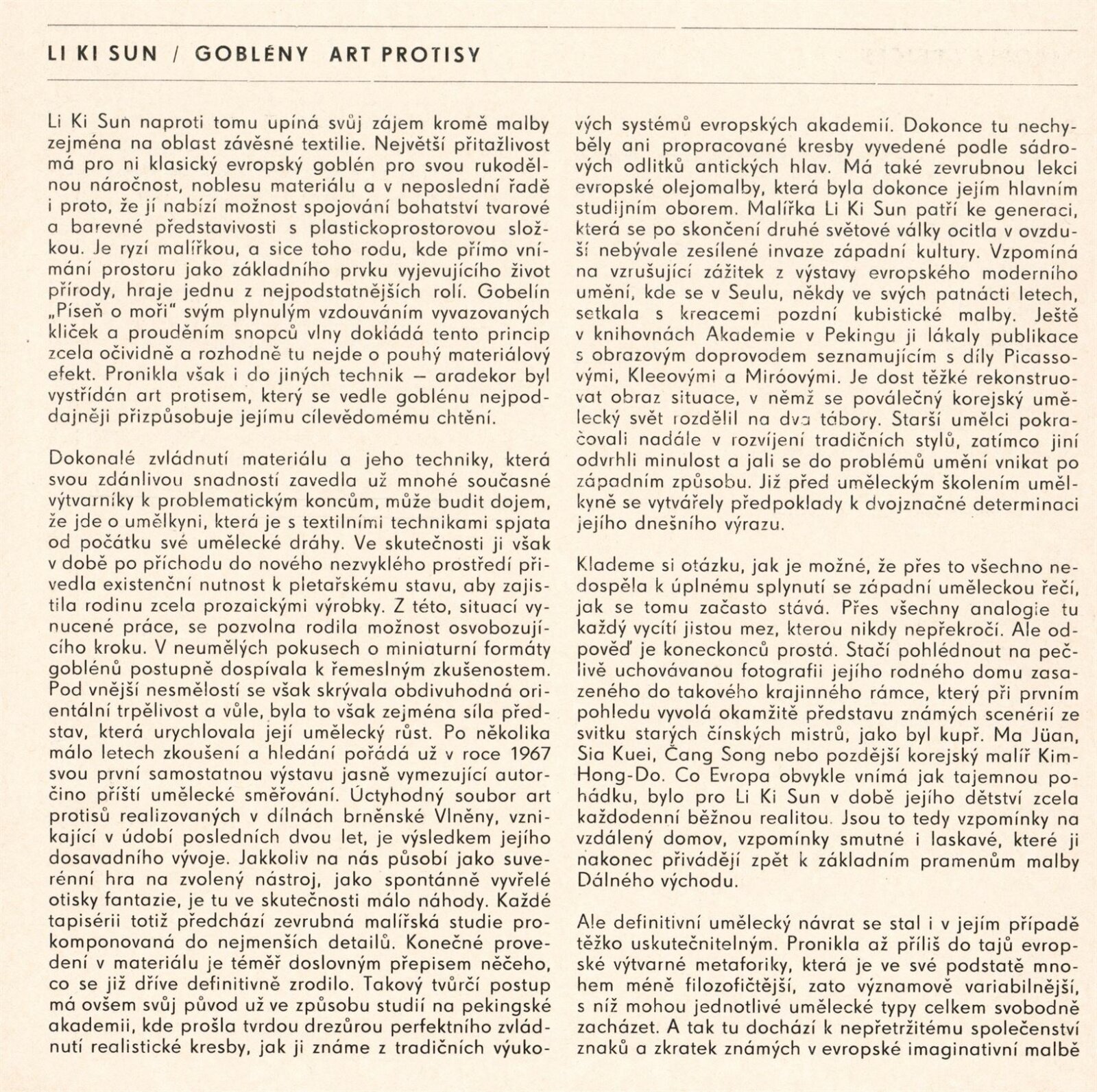 Li Ki Sun, Jaroslav Bejček – goblény, art protis, bronz, keramika, porcelán